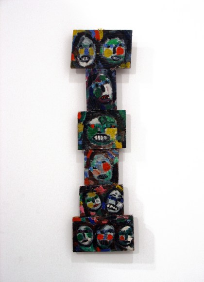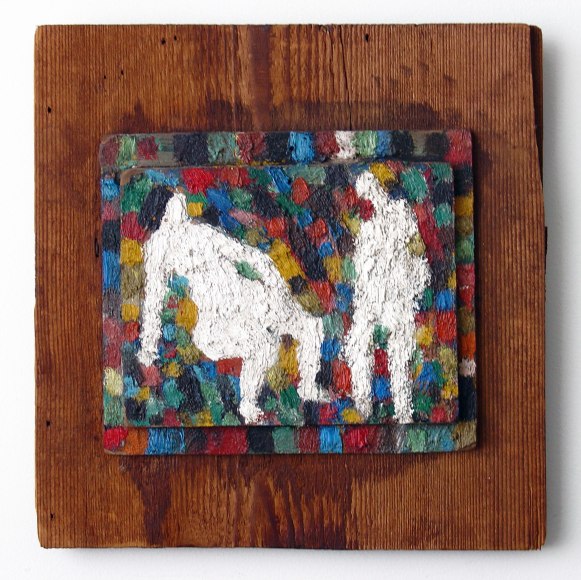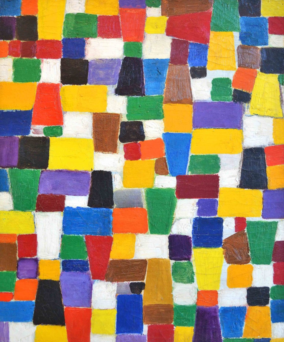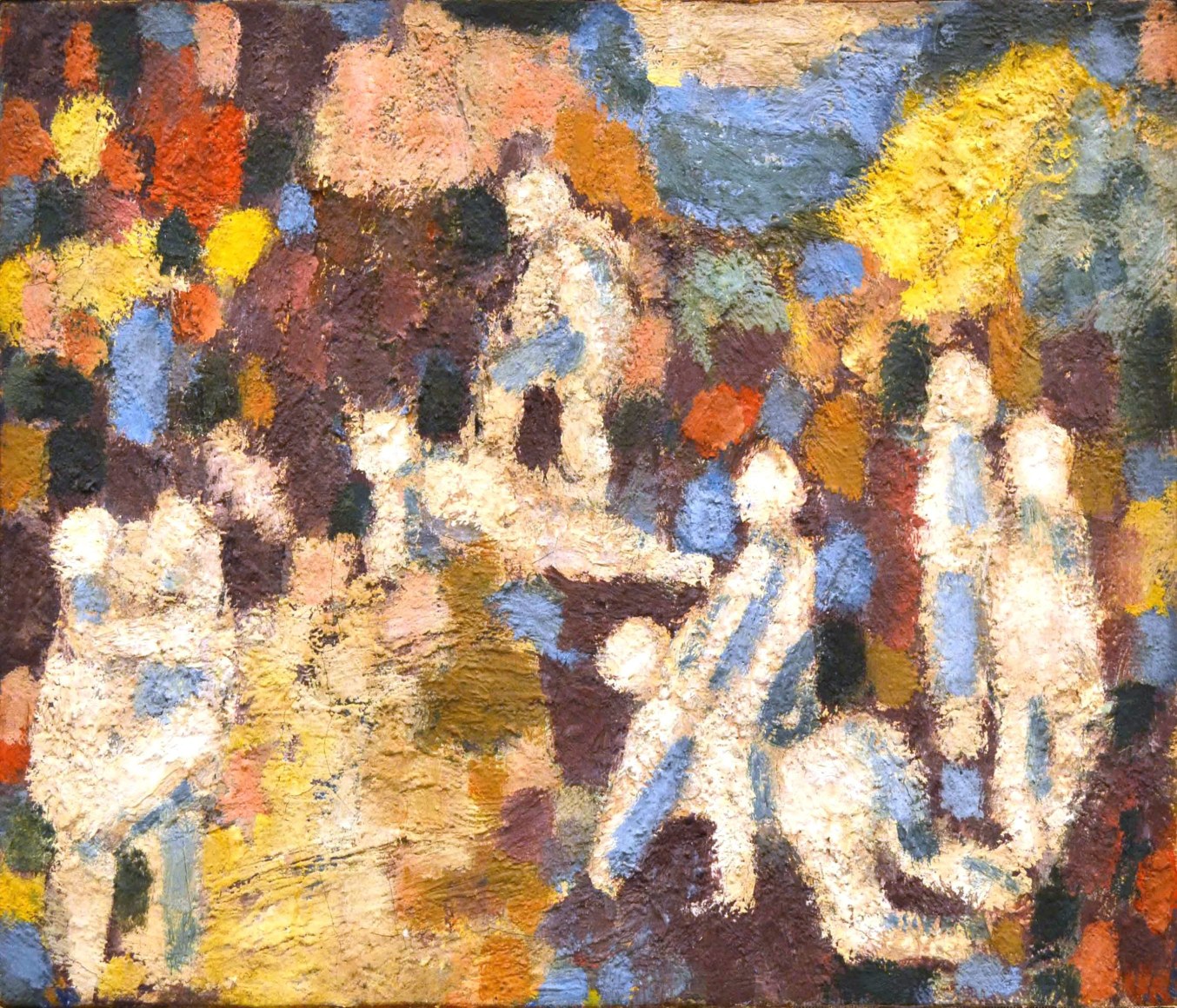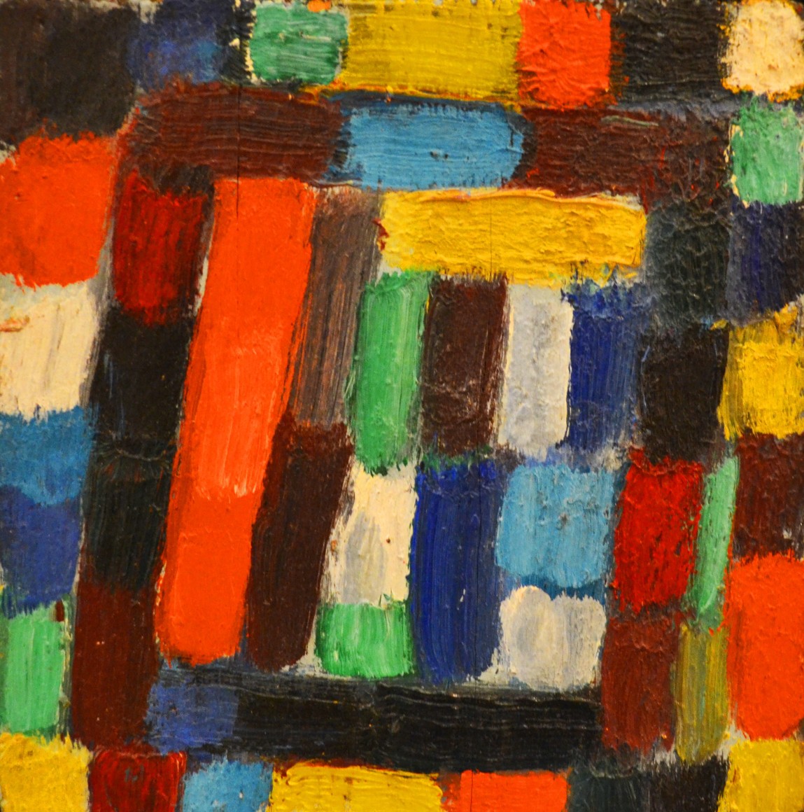 The variety of materials that Müller painted on reinforces the fury with which he explored the psychology of man through painting. Ranging from canvas to burlap to wooden shingles, the support in each of these paintings adds distinct texture and depth to the figures that rise through the mosaics. The total effect is a heightening of the tandem psychological-complexity and formal-simplicity of these works. Indeed, Meyer Schapiro has so eloquently described the artist’s transition as one “from abstract mosaics to a mosaic of nature and figures with simplicity and breadth.”