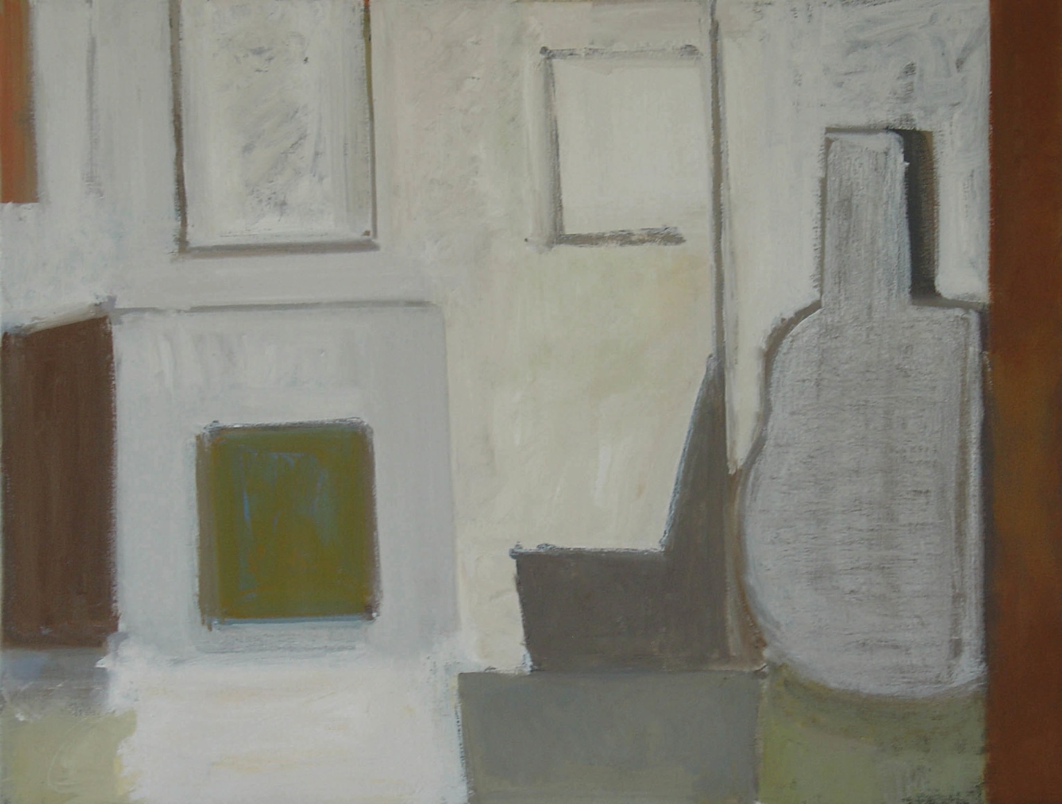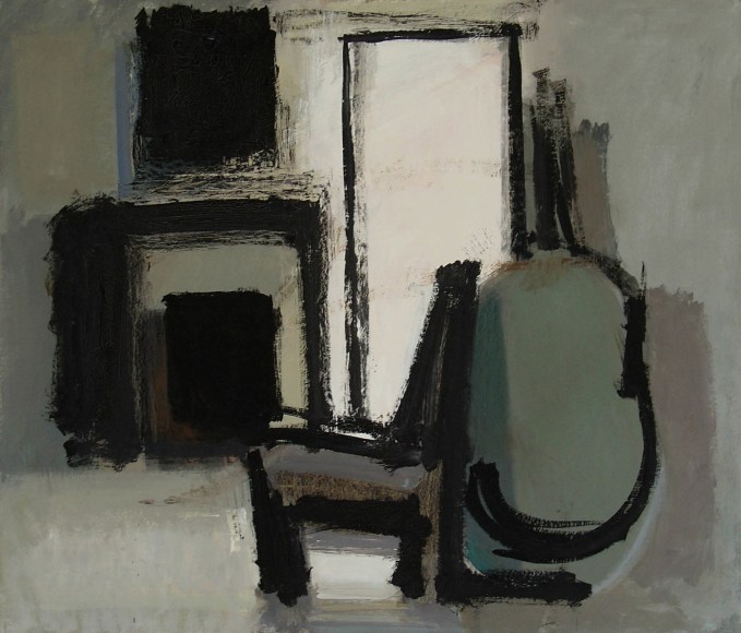 Phillips is unequivocally indebted to the still lifes of Giorgio Morandi, but while Morandi’s works tend towards completely isolated worlds, Phillips’ compositions often work as both intimate interiors and expansive abstractions. Karen Wilkin, in a 2005 Hudson Review article, describes the work as “‘early Gorky meets Morandi,’ but I don't mean that to be dismissive. From Gorky…she has learned how to suggest the weight and mass of the human body with flat, simplified shapes and strategically placed sweeps of line. From Morandi, she has learned how to construct lucid, rock-solid, geometric tabletop worlds. And she has combined what she learned into an intimatist approach all her own.”