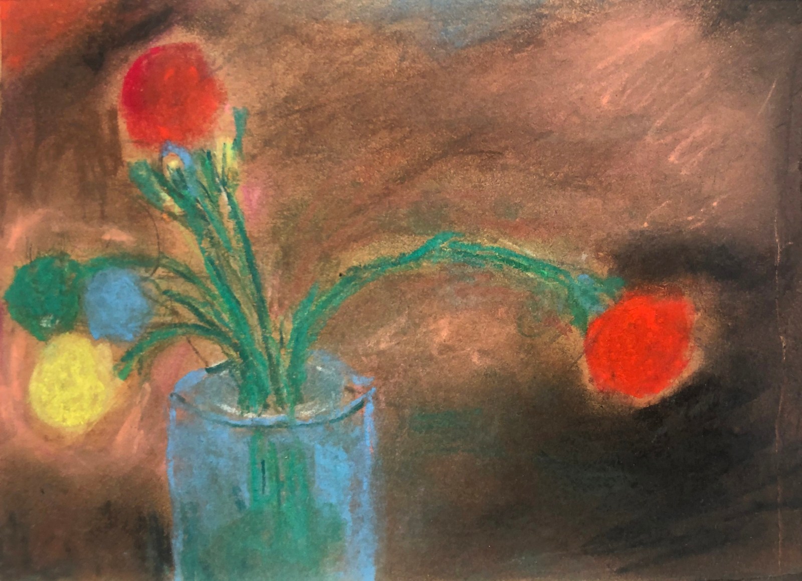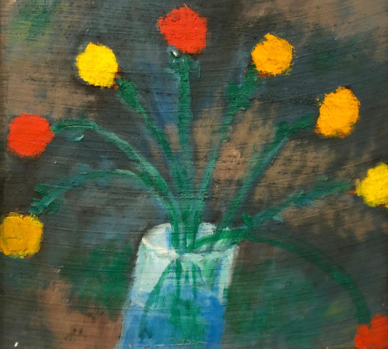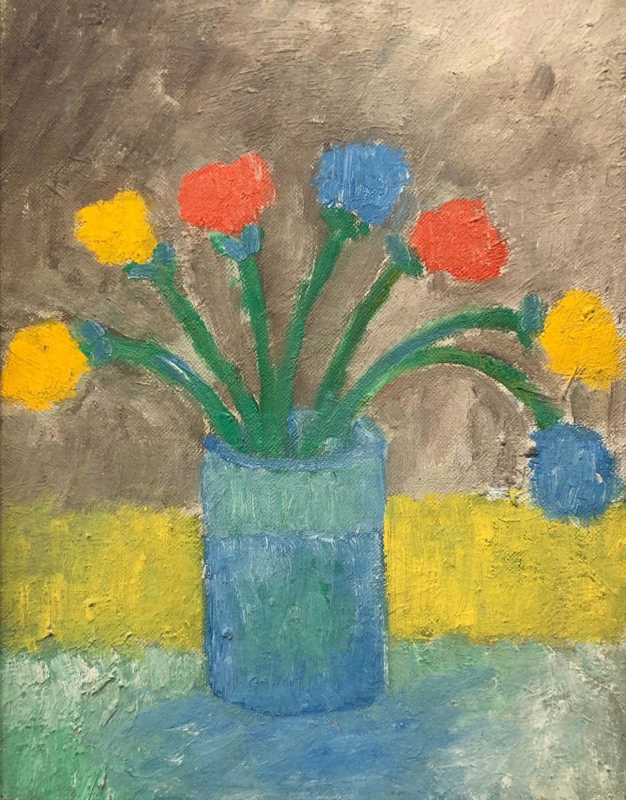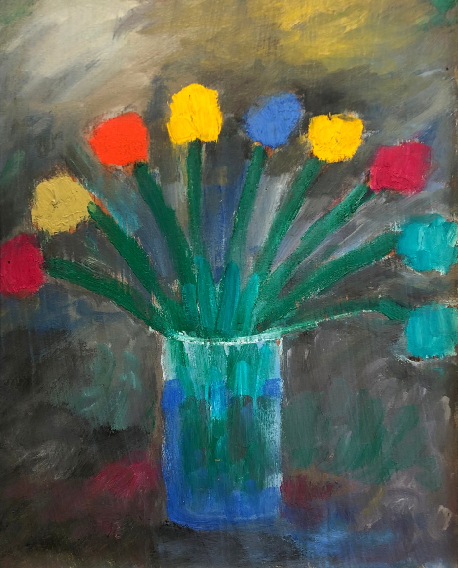 Executed in the most simple of shapes, Müller’s flowers could be mistaken for a vessel of lollipops. The blossoms are swiftly painted rounds of even color: fuchsia, red-orange, canary yellow and occasionally a soft blue. The round balls sit atop evenly-spaced stems which are arranged in either an erect, fan-like pattern or, more distinctly, limply drooping over the vessel which holds them. Occasionally, all of this sits on a tabletop, but more often, the arrangement floats against an abstract colorfield consisting of murky greys and browns blended with areas of vivid primary color.