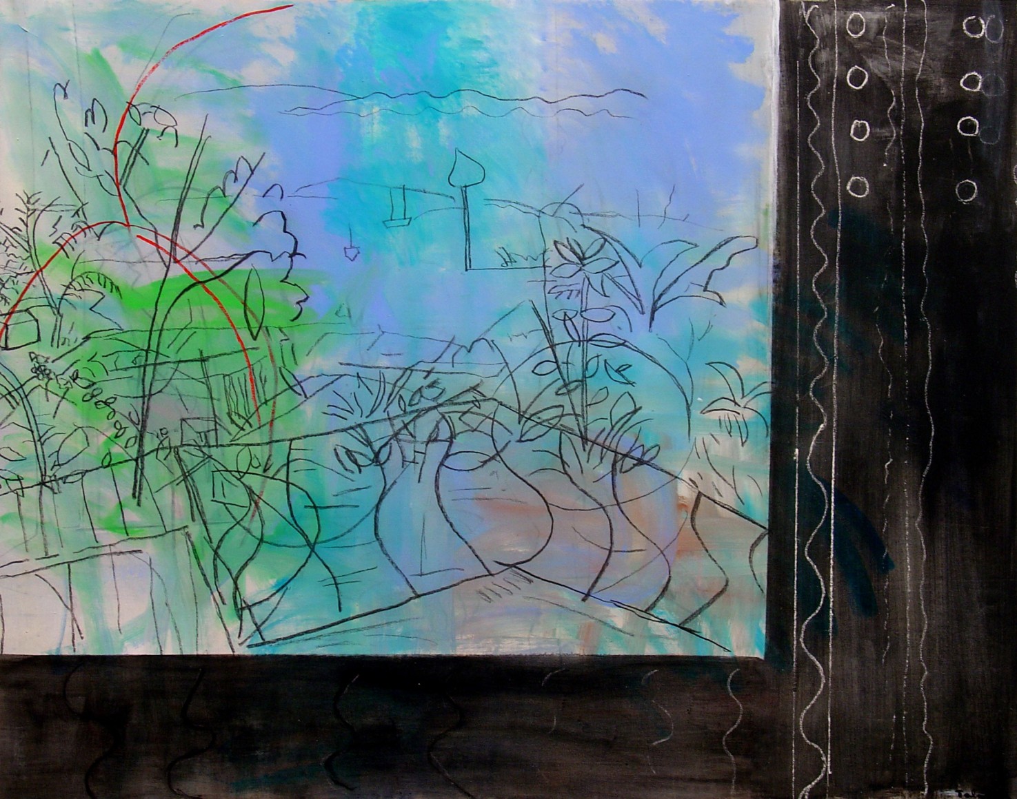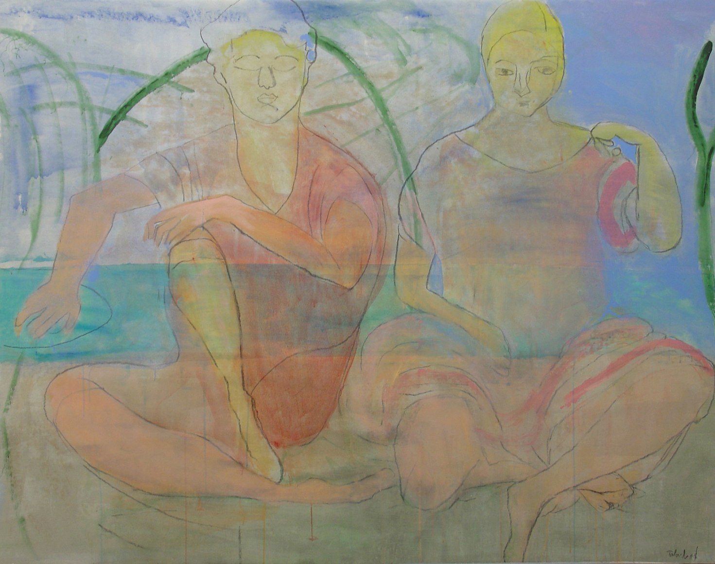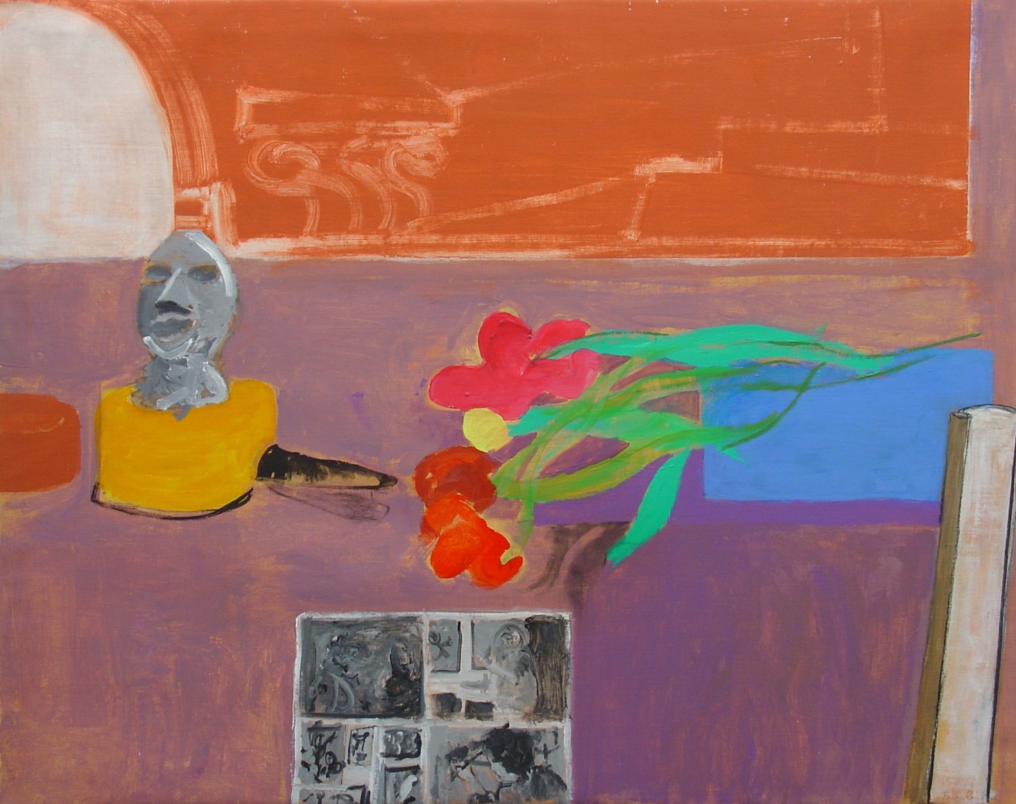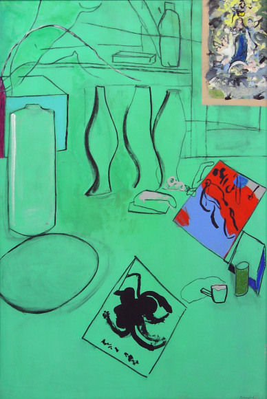 The earliest works on view have at their crux the synthesis of the objects of daily life—fruit on a table, paintings in the studio—with the flattened out, inverted Matissean space and push-pull color Tabachnick investigated in the 1960's and 70's. Over time, Tabachnick's exploration of these compositional principles relaxed to give way to greater emotive feeling. Late works, such as Roseanne and Monica: Blue and Yellow (c. 1993) achieve a near equilibrium between figure and ground, abstraction and figuration, and the prominence of line versus color.