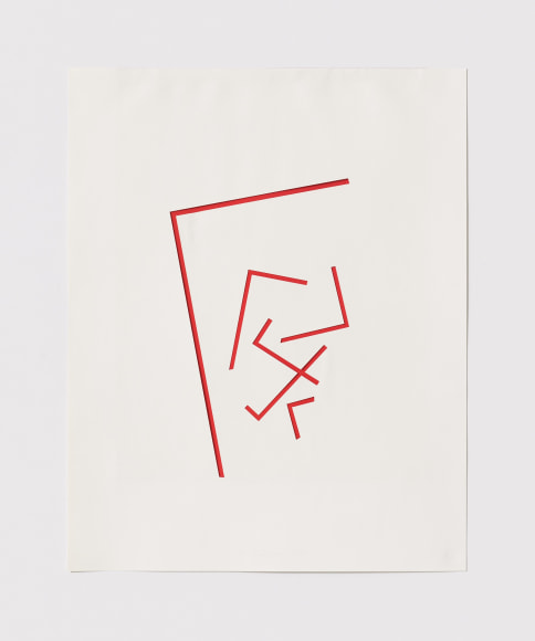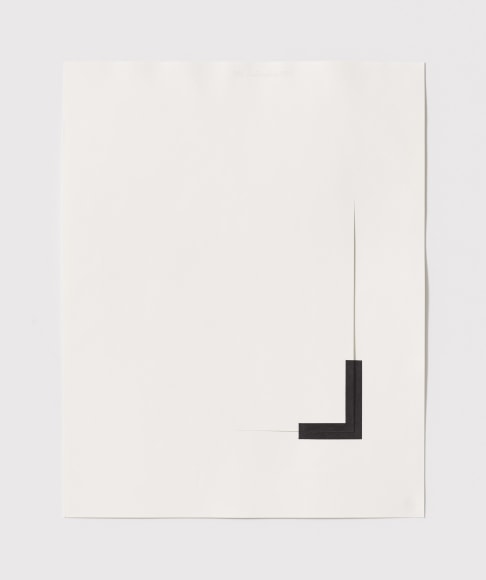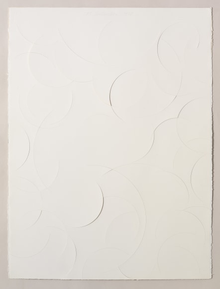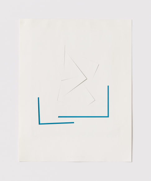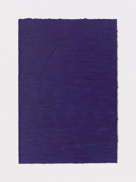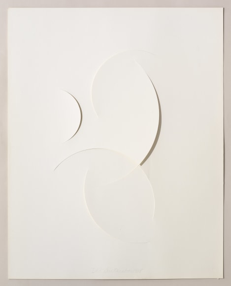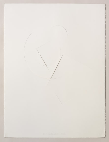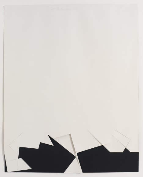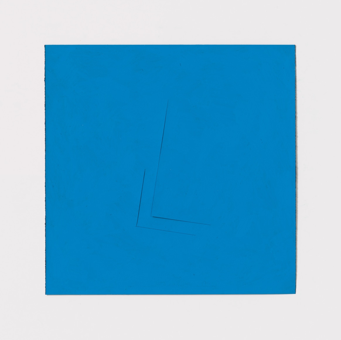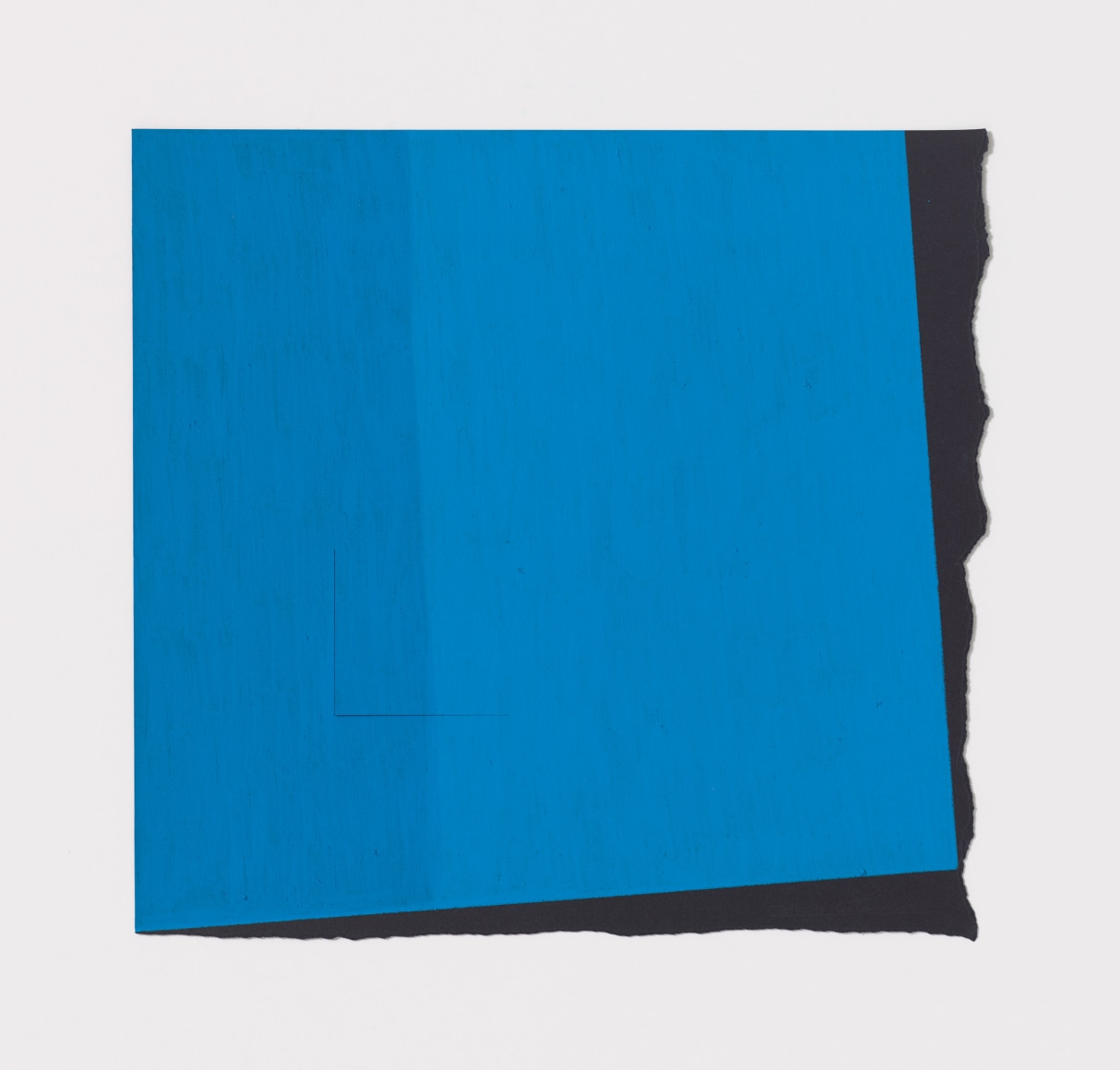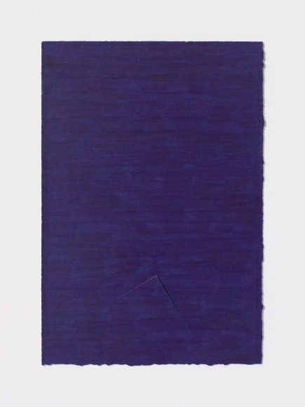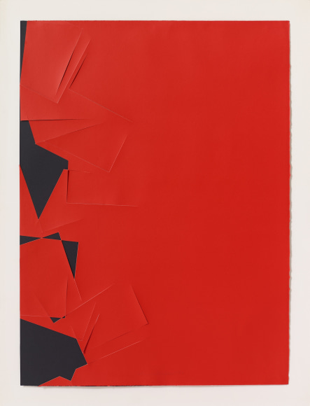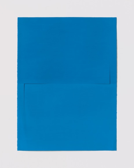 This exhibition includes Cuts of radically different approaches. One series of only two large white sheets has narrow lines cut out and backed with colored paper. A group of five has cuts and colored or black geometric forms that re-define the white spaces. A third, powerful, group of black squares has a different angle every time — every one a “stopper” from an artist known for light and space. Still more variations include bright blue squares on black papers and crackling, cut, white or red sheets layered over black. Finally, from 1978, there are the grand, serene, almost sculptural double-whites.