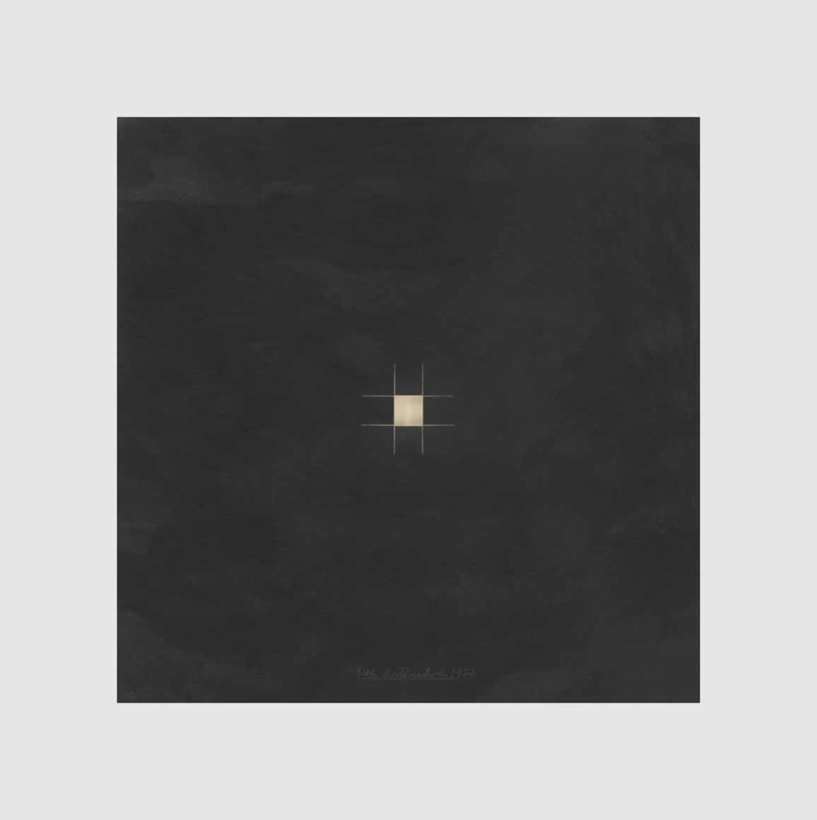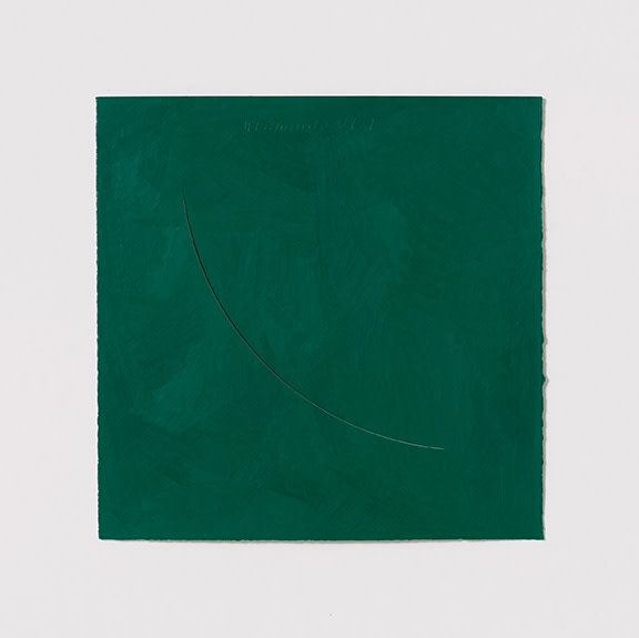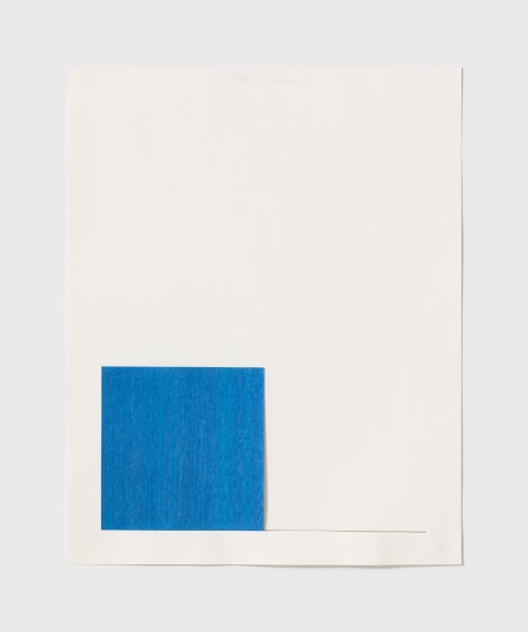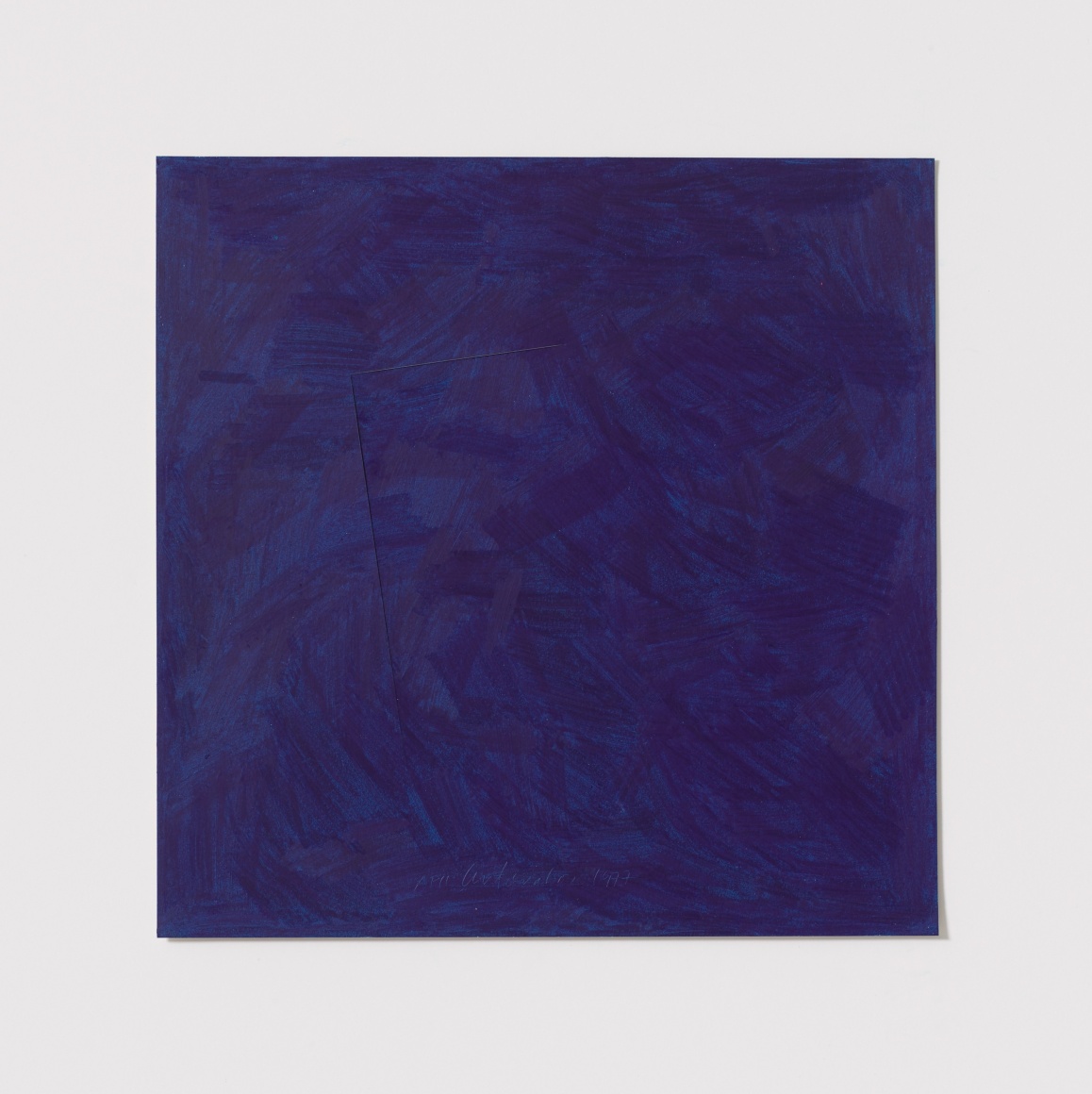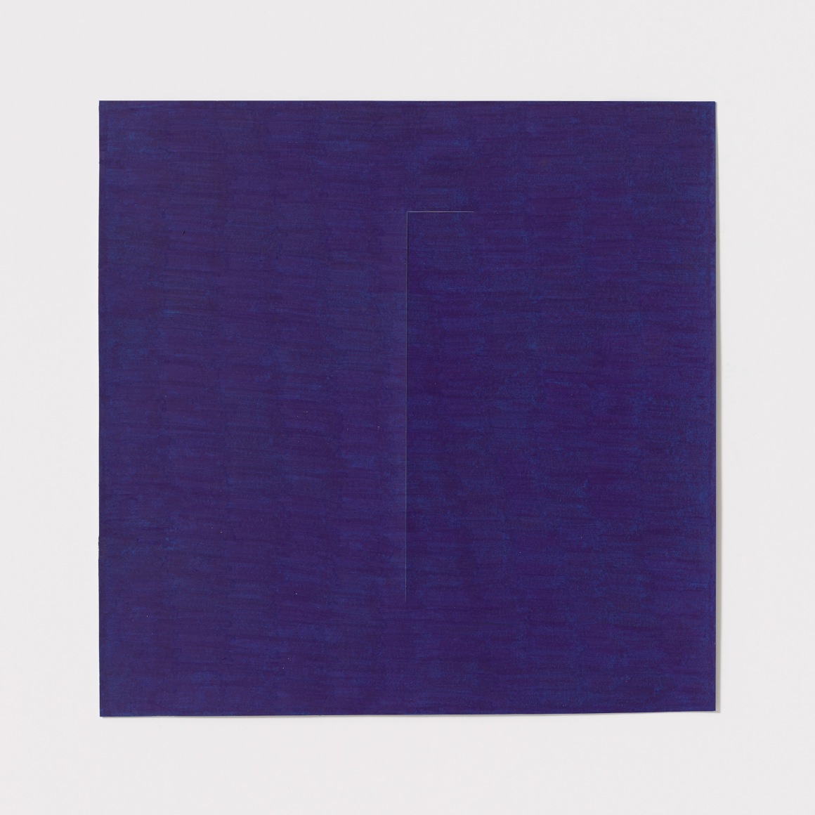 In the summer of 2014 a brilliant group of previously unknown drawings — Cuts — were found in storage. Each surface was thickly covered all over with Antonakos’s characteristic “back-and-forth” color hatching — in deep tones of blue and green, a few red, and one yellow. On some, severe incomplete circles were then cut through the surface; on others, incomplete squares. From still others, incomplete squares were cut from the edges. Each one is marked with the month and year, showing the speed and intensity — apparently the urgency — he felt in covering the surfaces so actively, so more-than-completely. The discovery of this distinct early series adds a lush, concrete chapter to the already rich story of Antonakos’s Cuts from 1977 and 1978. (Antonakos continued with Cuts steadily through 2012 in the forms of drawings, collages, and Artist’s Books — on a range of papers and vellums and gold-leaf on Mylar.)