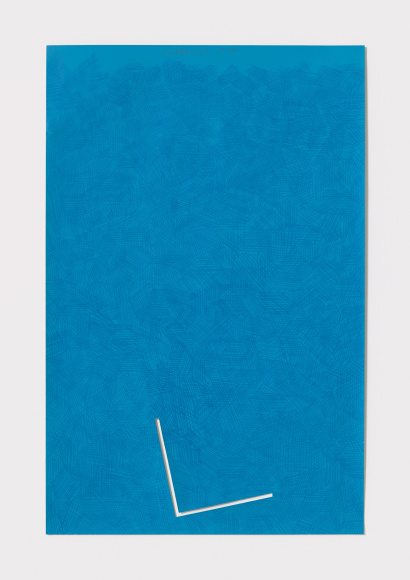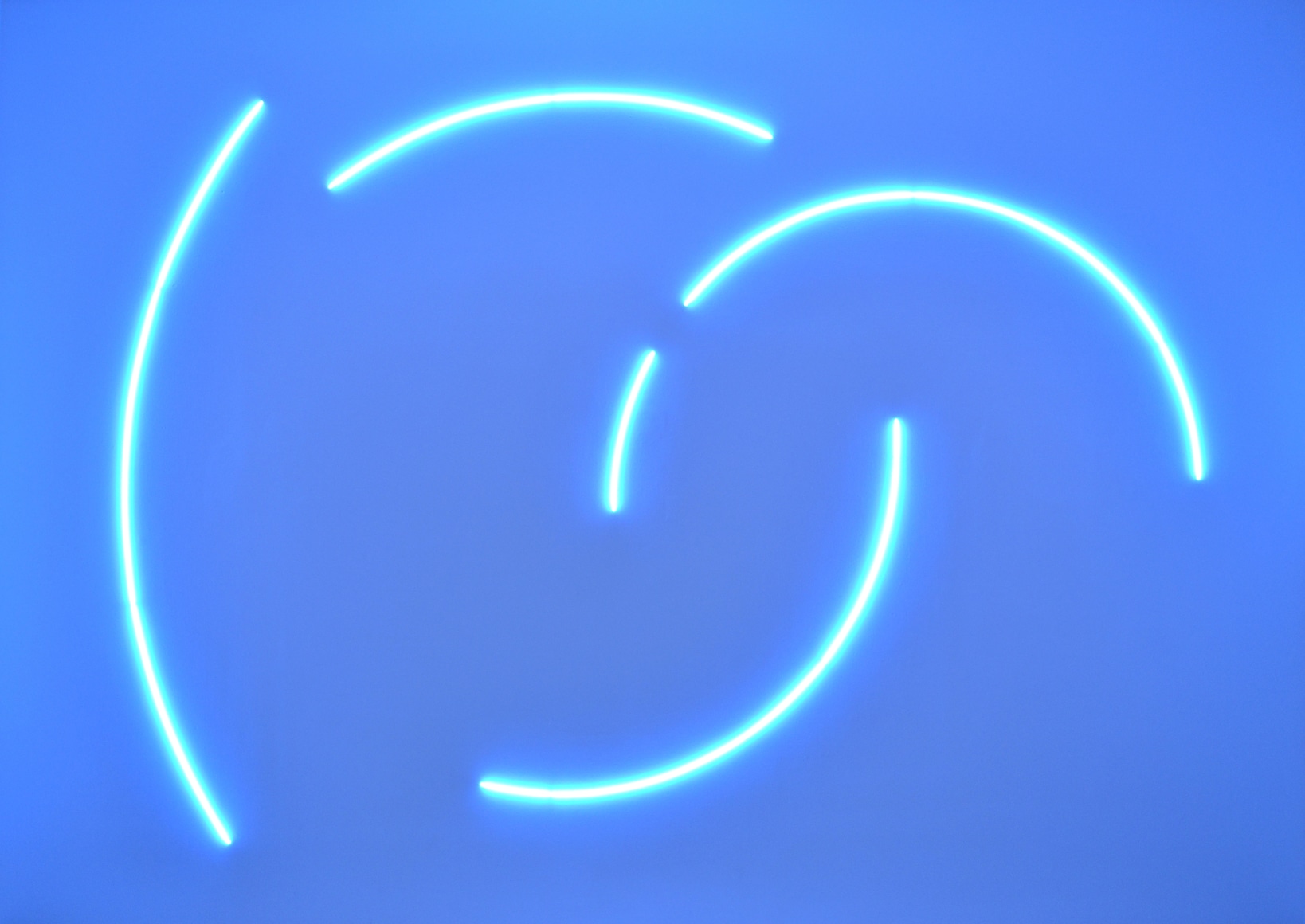 Viewers may remember seeing the 1978 “Blue Incomplete Circle on a Blue and Red Wall” last season in Phong Bui’s important “Come Together: Surviving Sandy, Year 1” mega-show in Industry City, Brooklyn. That work’s two-colored field and its intensely focused neon form contrast greatly with this Wall’s softer color and the gentle, rhythmic overlapping of its potentially-complete blue circles.