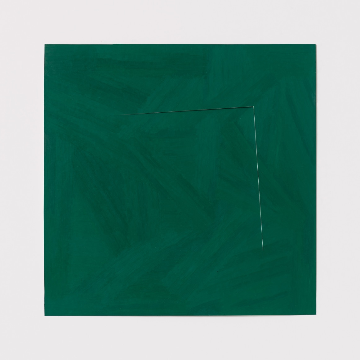 In Antonakos’s Cuts it is rare to see a form removed and placed somewhere else — as in Matisse’s eternally grand, colorful, and sensuous Cut-Outs. Nor did Antonakos’s Cuts effect anything like the “curl back” of Fontana’s elegant singular or repetitive slashes on canvas. With Antonakos we may envision the cut in the surface, the “completed” circle or square it suggests, and even the surface before the cut — perhaps a kind of a multiple-time experience.