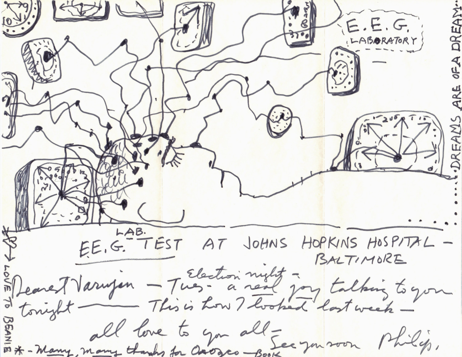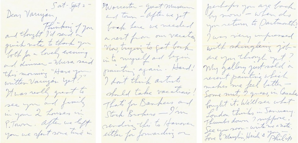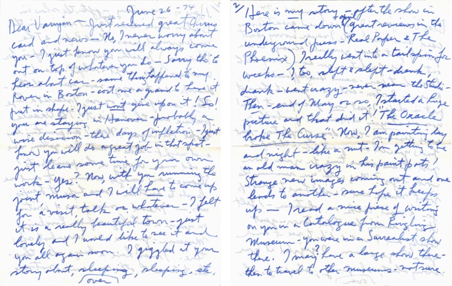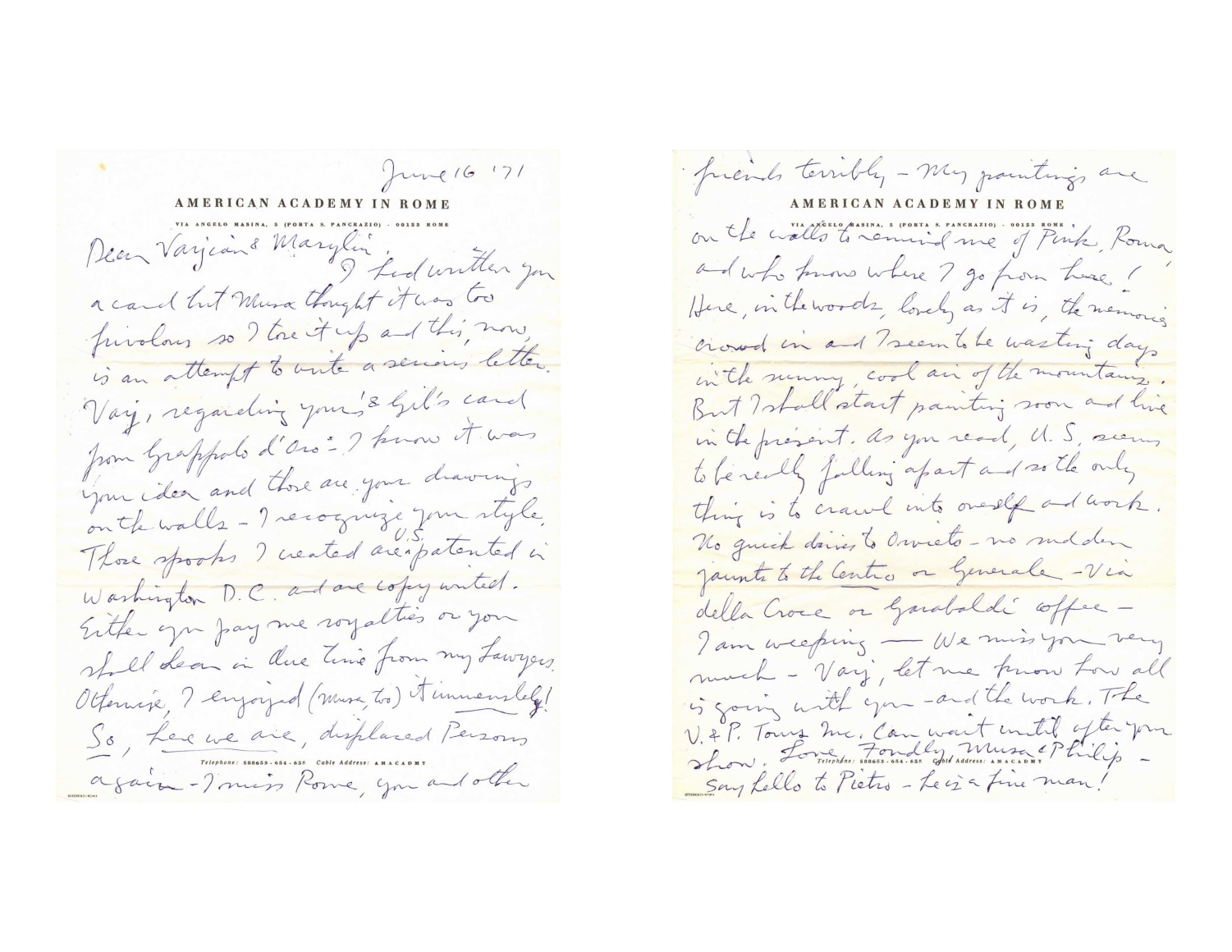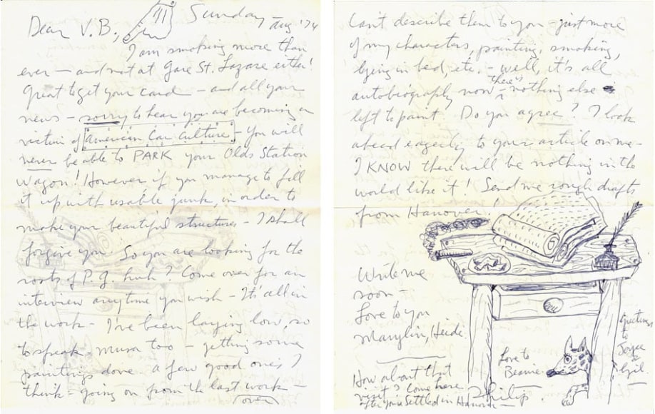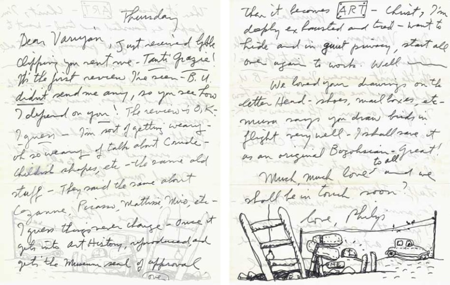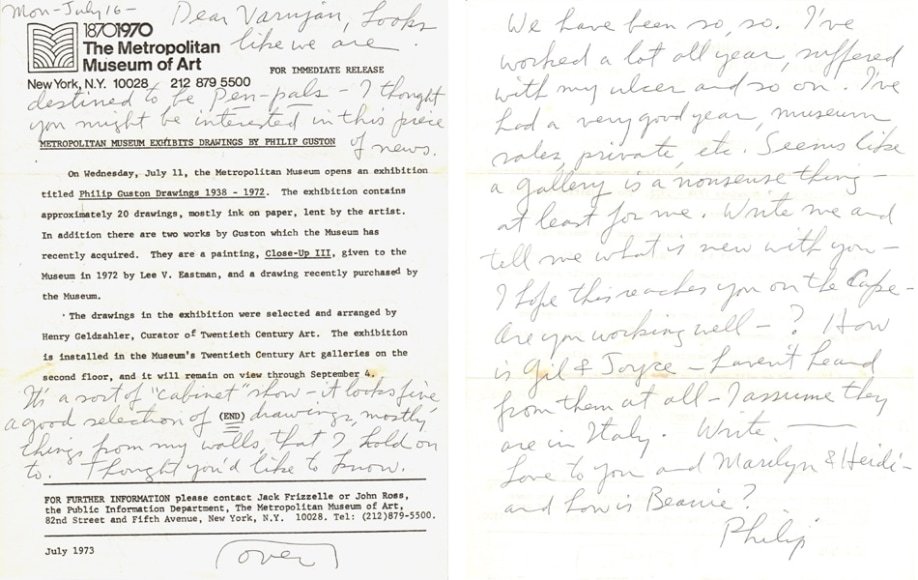 Guston's letters are written and illustrated with an assured and graphic hand. The artist's penmanship, much like the ink strokes of his drawings, inspires sensations of both spontaneity and formal charm. The content of the correspondence, meanwhile, ranges from medical updates to more candid inquires of gallery sales and exhibition news. However, beyond the insuppressible energy and manifest tenderness contained within, these letters point to a relationship centered on mutual respect and shared inspiration.