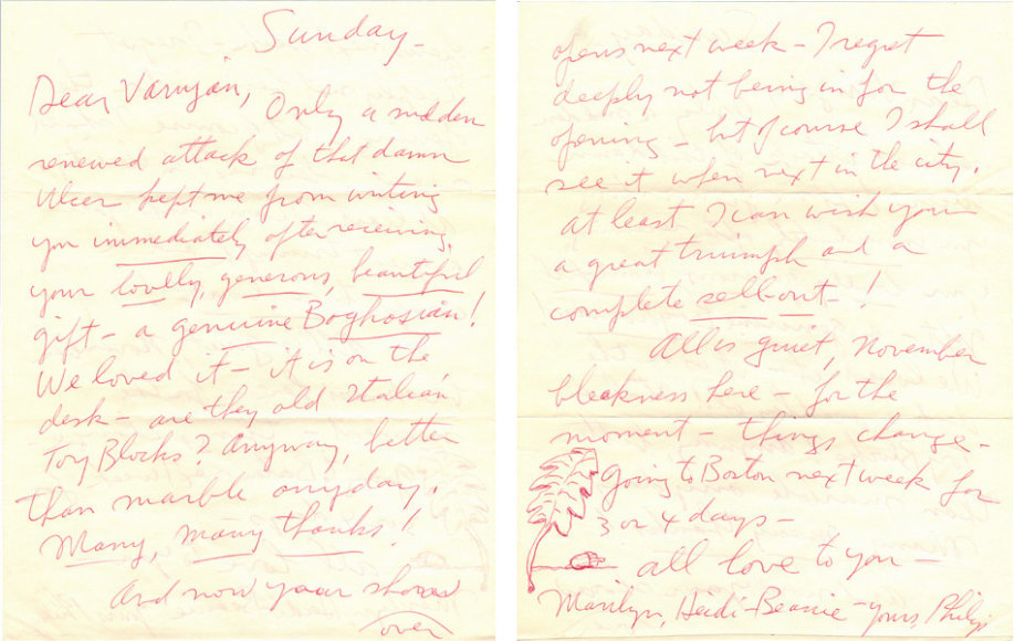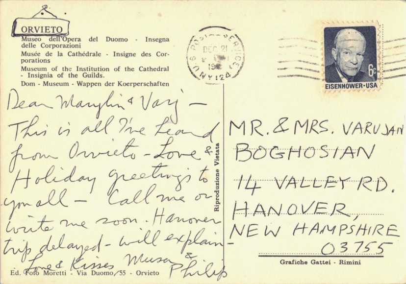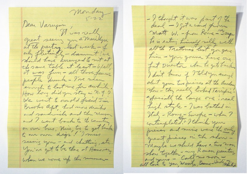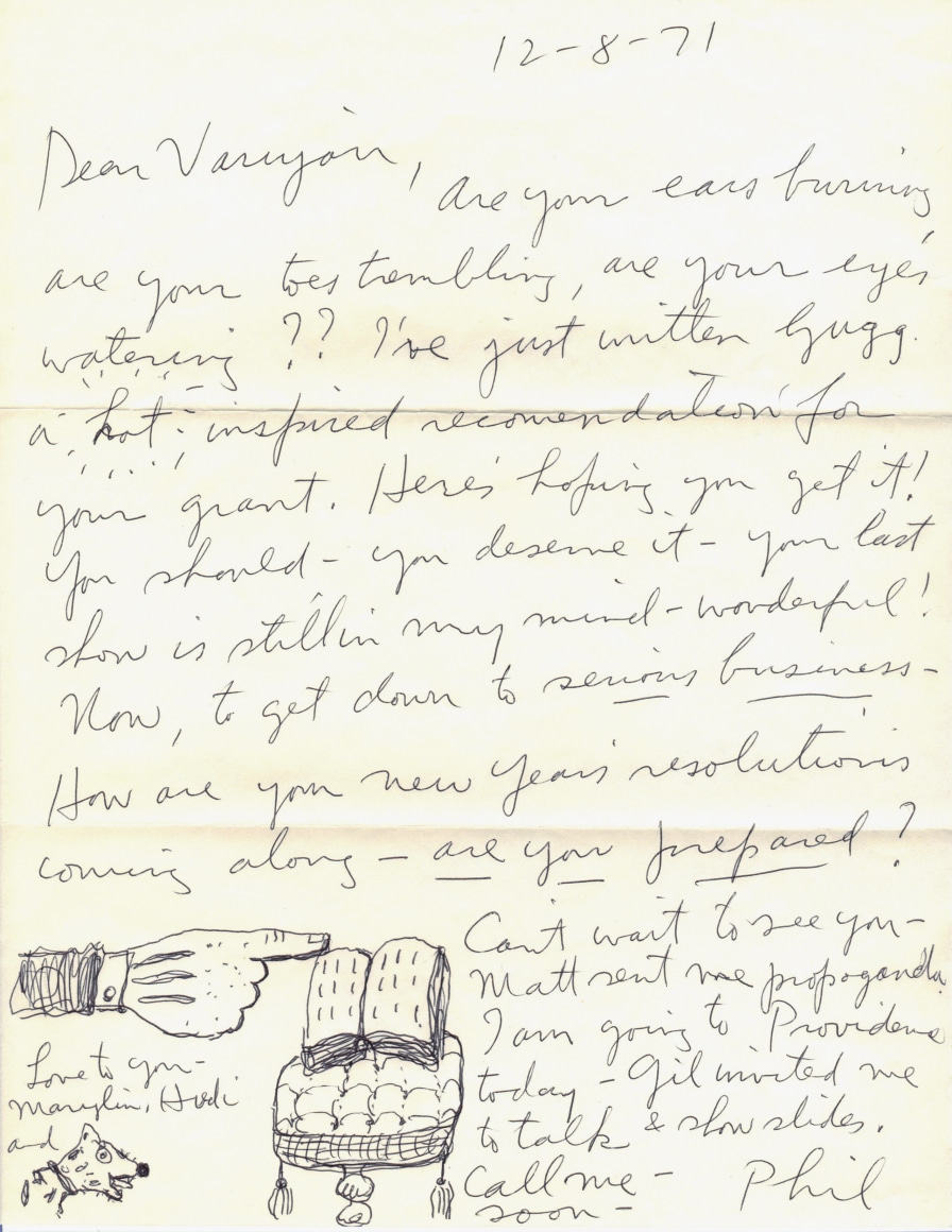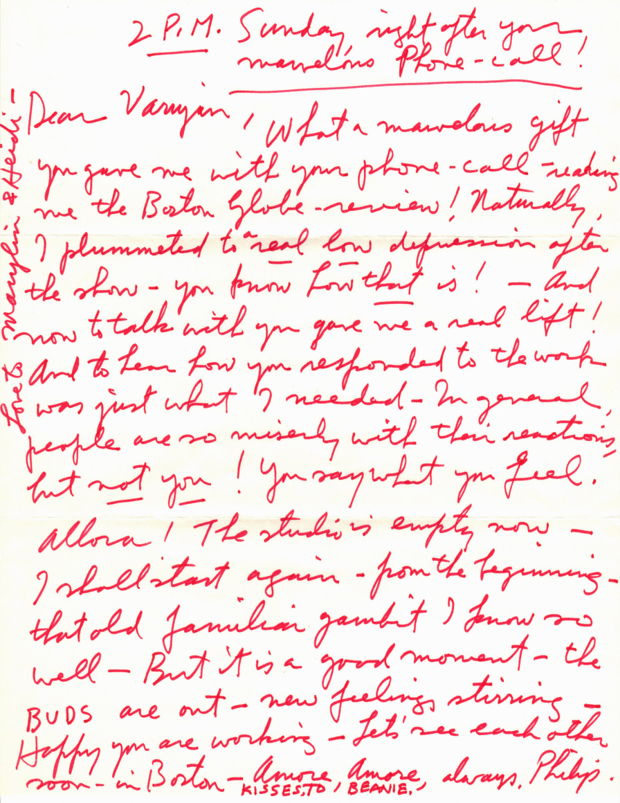 The friendship of Varujan Boghosian and Philip Guston began in 1970, when they first met at the American Academy in Rome, and continued until Guston's death in 1980.  The show tracks a decade of correspondence, bringing together thirteen letters written by Guston to Varujan, along with boxed and free-standing constructions Boghosian made in homage to his late friend.  Six of these letters are illustrated with quintessential Guston motifs, such as the pointed hand and smoking cigar, and address issues of his own impending mortality with the same satire that is so readily apparent in his late oeuvre.
