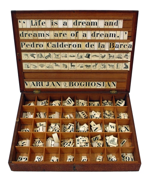 In the years since Guston's death in 1980, Boghosian has looked to the illustrated letters as the animus for a series of works which evoke their spirit and play. A piece titled Life is a Dream, assembled from a children's game, fleshes out a bisected quotation by the poet Pedro Calderon de la Barca. The somber Smoking encases a lonely cigar in a wood box, a water stain serving in place of a puff of smoke—a touching commemoration of Guston's old habits and favored motifs.