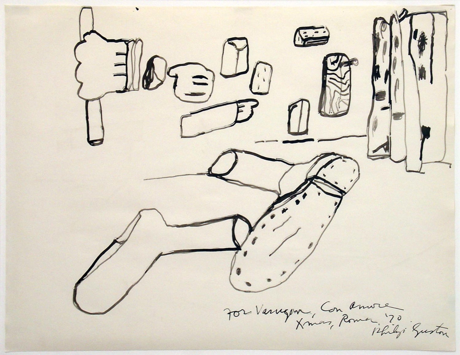 Signed, dated and inscribed LR: "For Varujan, Con Amore / Xmas, Roma '70 / Philip Guston"