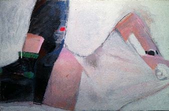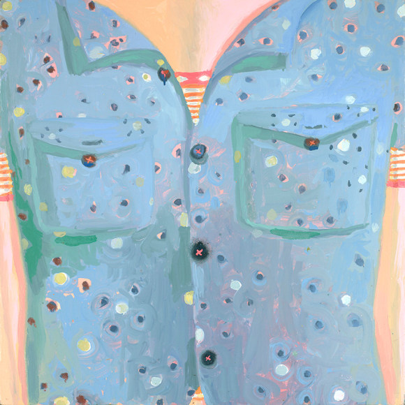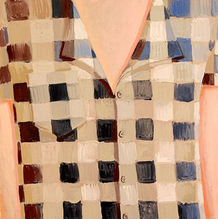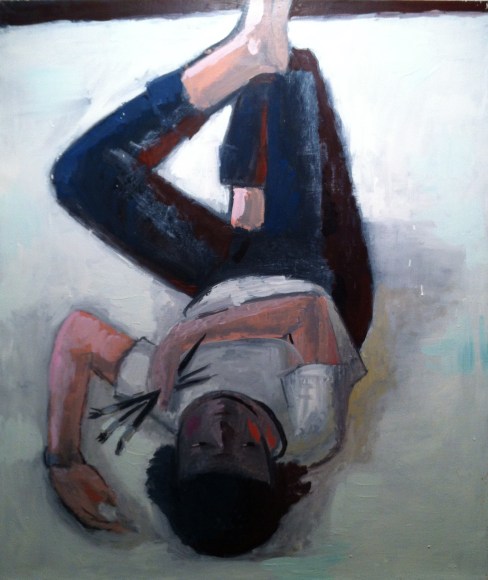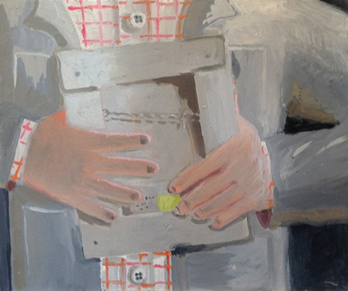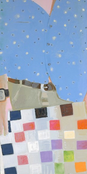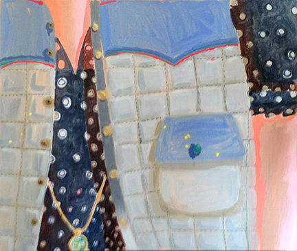 The most recent paintings from this year, however, show an increasingly tighter cropping of the picture plane. The resulting composition, focused on parts of the body rather than the whole, allows for greater preoccupation with design. Planes of pattern and color are distinctively animated, albeit by the pattern of polka-dots on a figure's shirt or the articulated circles of bubble wrap that secure a painting. The resulting compositions are more elusive than before, offering less of a narrative path than an opportunity for the viewer to relate to the physicality of the subject's body and the abstraction of the painting's composition.