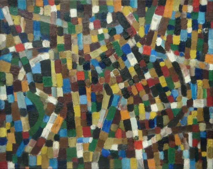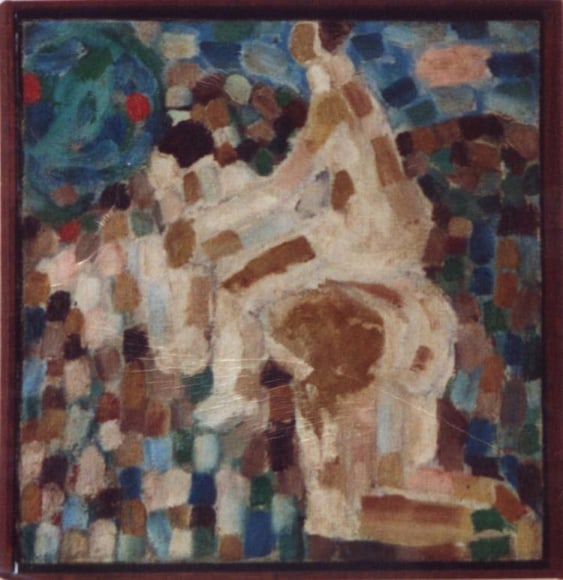 Jan Müller [1922-1958] Untitled (White Nude on a Mosaic Background) 1953 Oil on wood, mounted on wood 7 x 7 ½ inches (LBFA #2513)