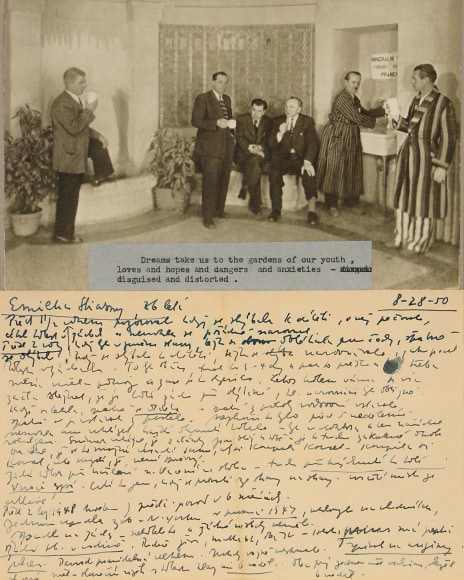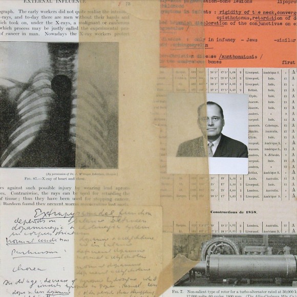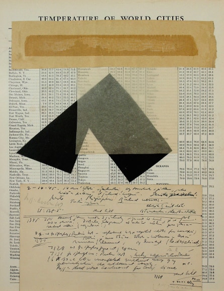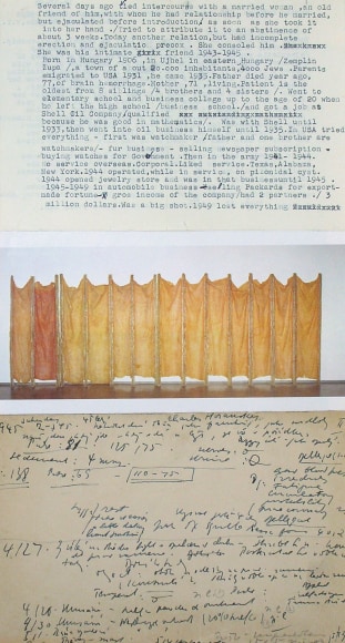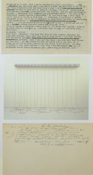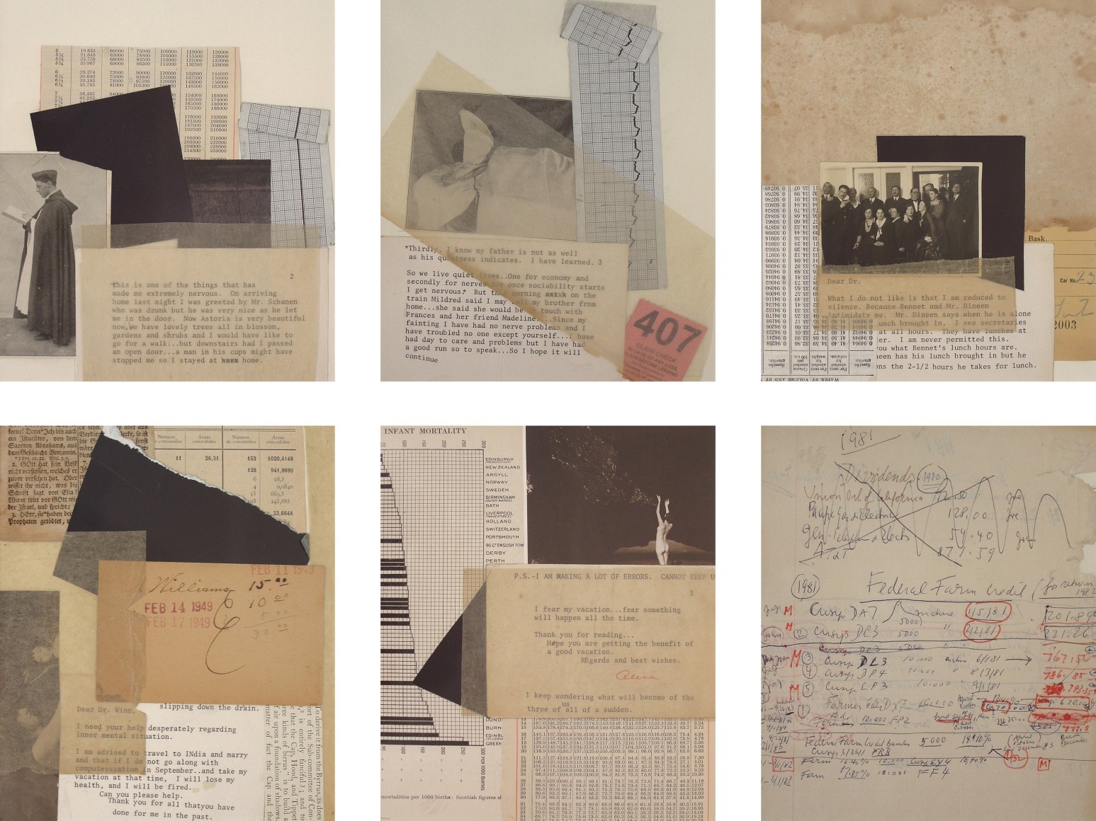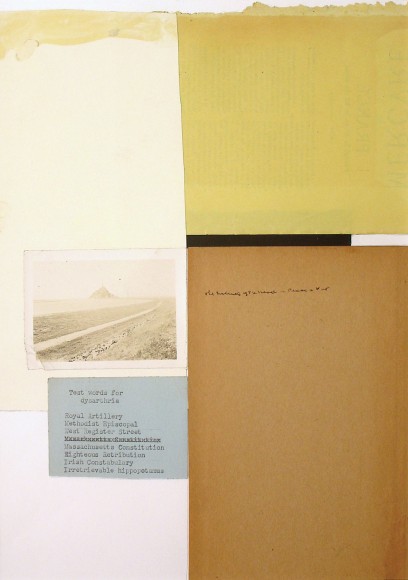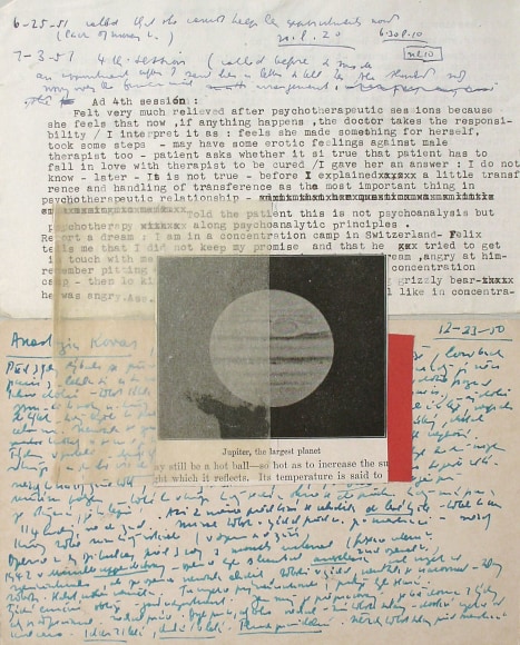 In Free Associations, Malcolm continues her exploration of the aesthetic tradition of Schwitters and the Russian Contructivists, but brings hints of narrative previously present to a new level of explicitness. The collages' source materials of yellowed handwritten and typewritten notes play the dual role of verbal signifier and visual element. The melancholy of once cutting-edge, now antiquated textbooks dovetails with that of the Freudian case studies—which, in Malcolm's words, summon "a period in psychiatry that is as remote from today's practice as the manual typewriter is from the Macintosh computer."