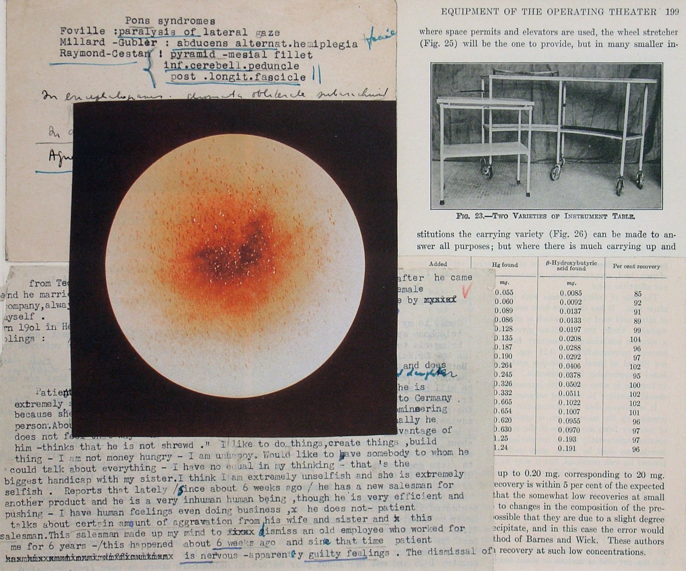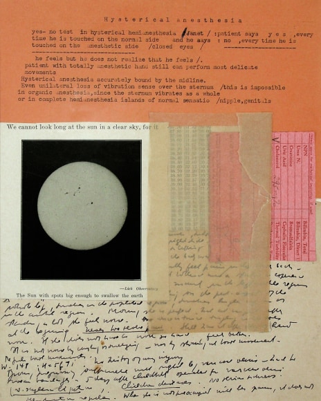 Lori Bookstein Fine Art is pleased to present new collages by Janet Malcolm in Free Associations. This series of collages began to form in the artist's mind when the papers of an émigré psychiatrist who practiced in New York in the late 1940's and 1950's—many of whose patients were themselves émigrés—came into her possession. The extracts from case studies appear in combination with fragments from early 20th century medical, surgical, astronomical and technological texts, as well as appropriations from contemporary art, giving these works the atmosphere of dreams in which vaguely and somewhat disturbingly familiar times and places are evoked.