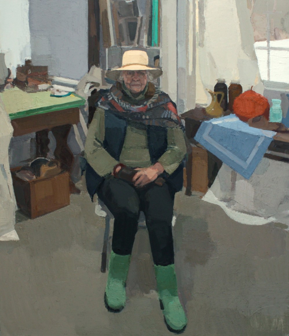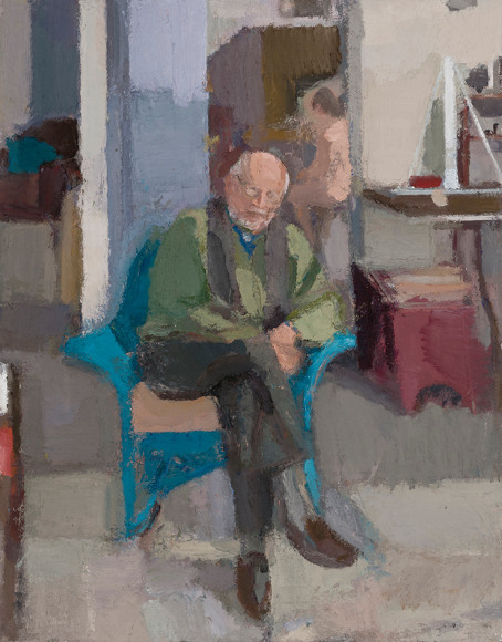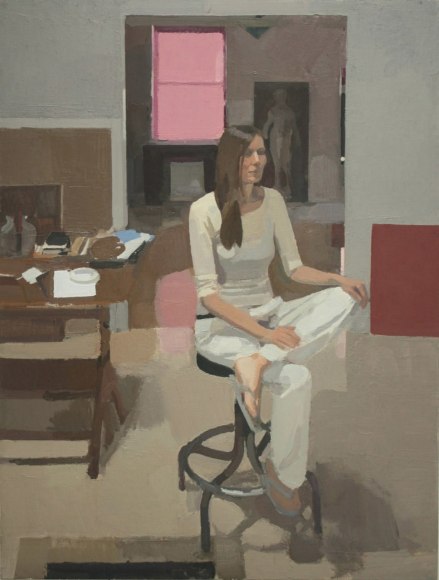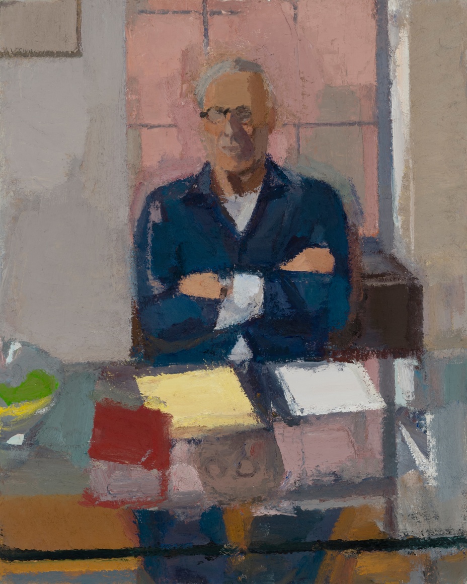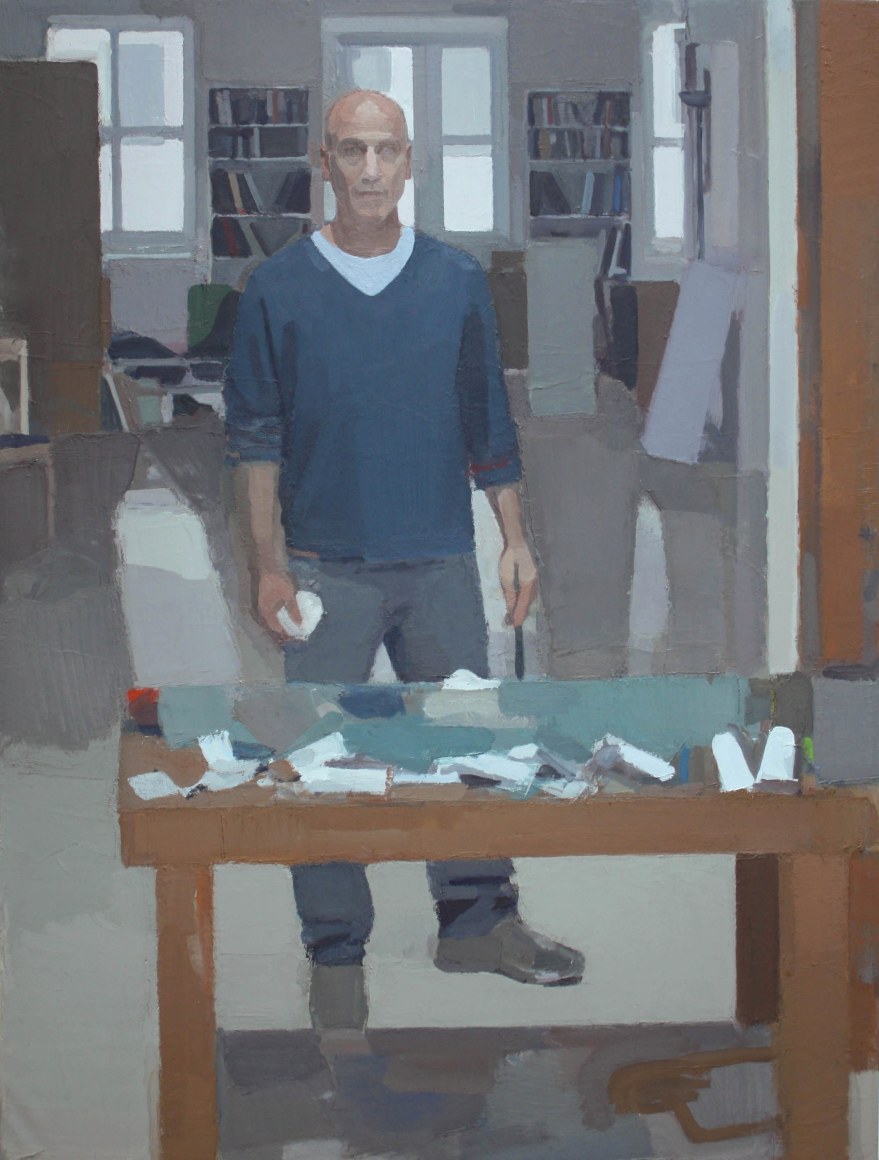 The six portraits in the show (including the painters William Bailey, Tine Lundsfryd and Ruth Miller and the poet Mark Strand) are also amalgams of multiple experiences but in a very different way than the cityscapes. They are painted, at least in part, from life under highly pressurized conditions. Again, time is an essential element, but in these works, time is also characterized by the many days and intimate exchanges with the subjects in their environments. In each portrait, Dubrow finds a formal construction which becomes a metaphor for the sitter’s personality. Interior scale, color, or an oblique angle all stand on their own as formal elements while simultaneously taking on particular significance to the individual.