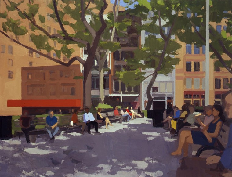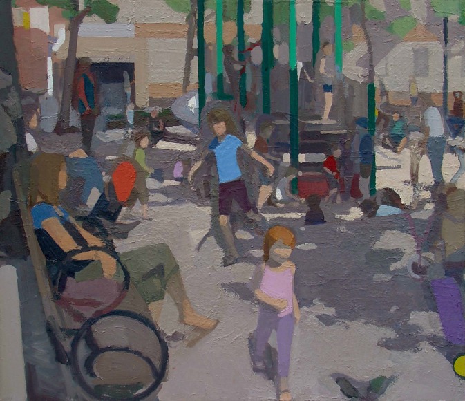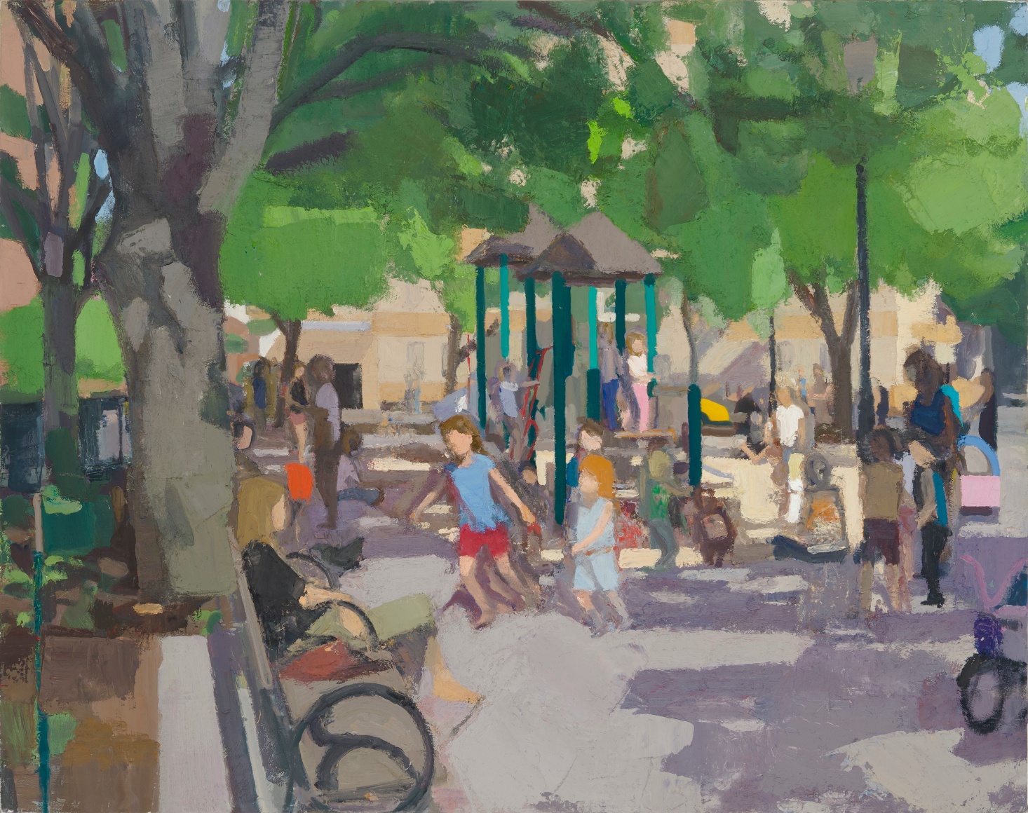 Dubrow’s new Bleecker Playground series re-imagine the pastoral tradition as he continues his two decade-long pictorial investigation of contemporary urban life. These paintings are free-associated in the studio, from onsite notes and the artist’s memory of the motif, without the use of photography. Developed over a period of many months, sometimes years, the compositions are in flux until their completion. This shaping and re-shaping of structural space over a protracted period turn time into an integral element of the paintings; the surfaces seem to hold the memory of the history of their making.