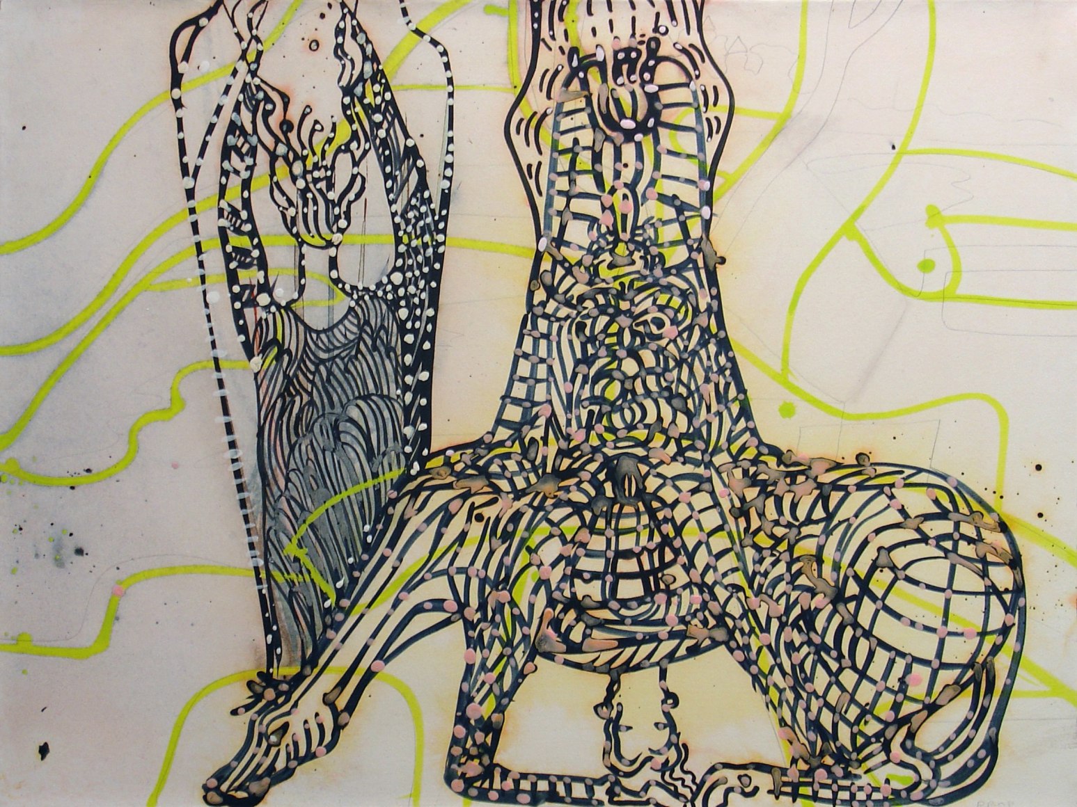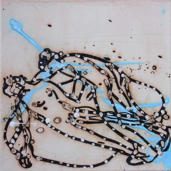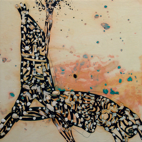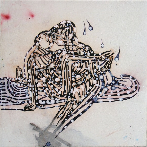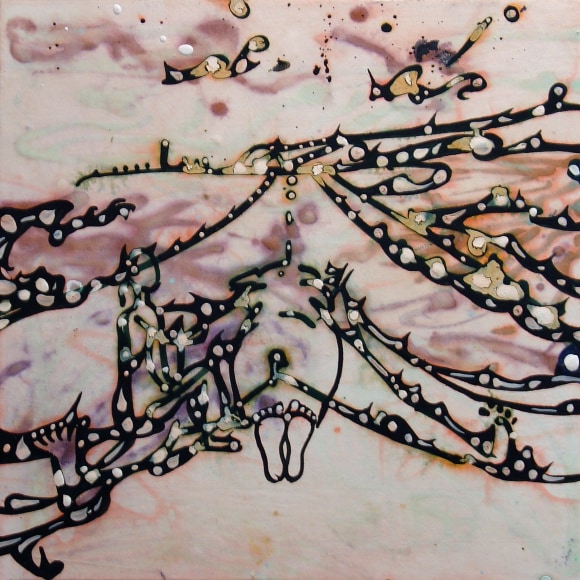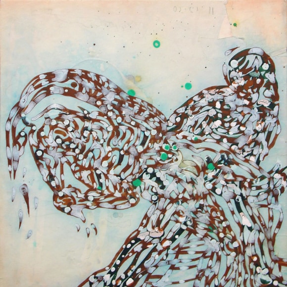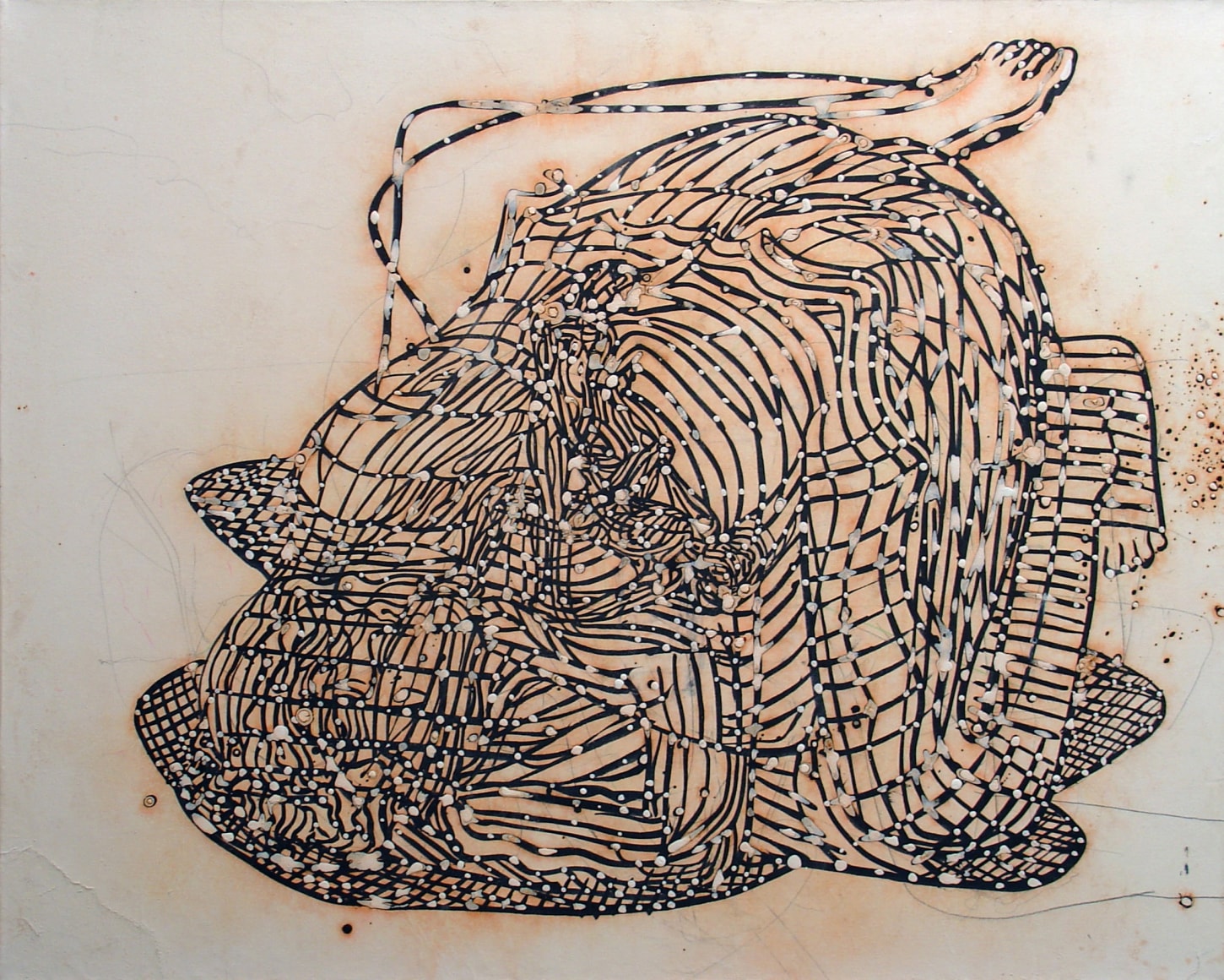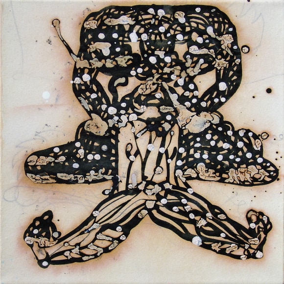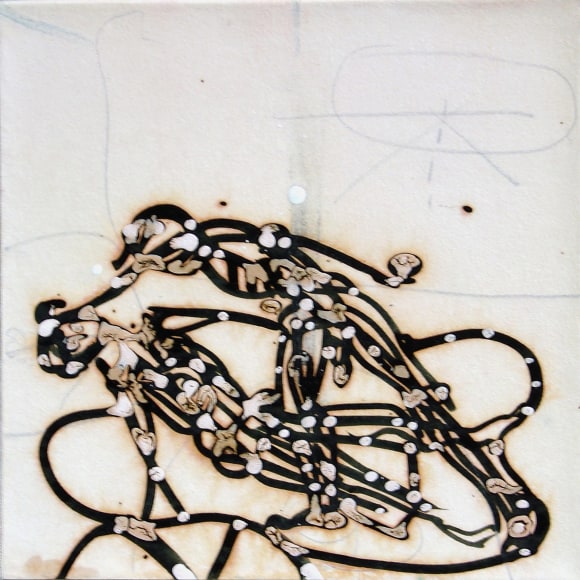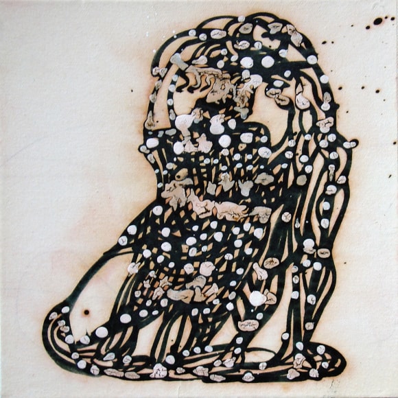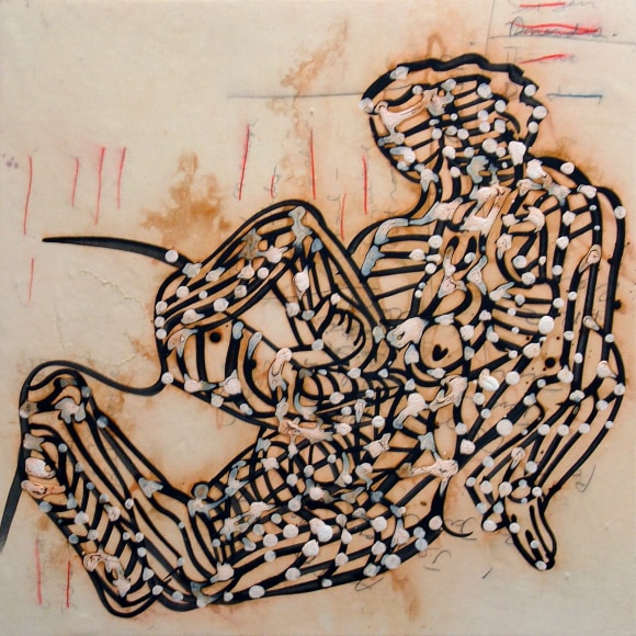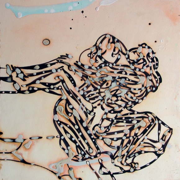 The Lovelife series, inspired by an array of seemingly unconnected sources – ancient maps, human and equine forms, ceramics, and vintage Japanese erotic prints – navigate the entangled forms of lovers at play. Often suspended in constellational webs, the works are composed of the artist’s vocabulary of intertwining lines and pocked by trademark drops. The paintings chart a wide range of human emotion and thought, and are at times a treatise on the wholeness of a human being, at others an exploration of questions of mortality, sex, and the constant chemical and biological transformations that are the basis of human existence. The viewer may look into and through human forms into a map of the stars, giving the paintings a rhythmic energy and articulating the connections between forms and the spaces they inhabit. Slowly, figure grows into ground and ground into figure, until one isn't sure whether one is inside or outside, above or below.