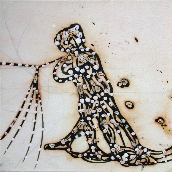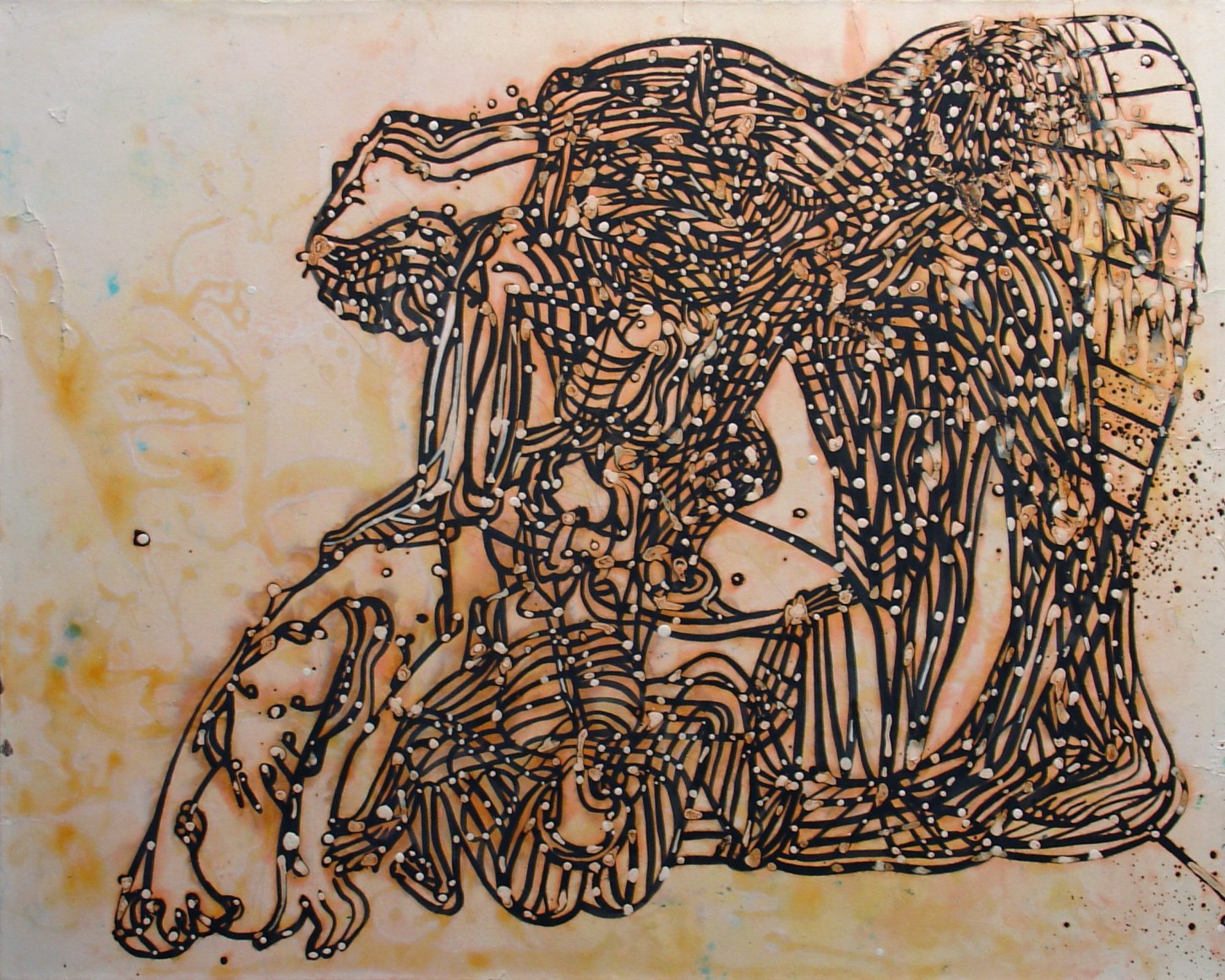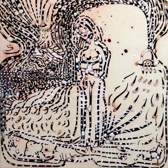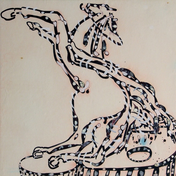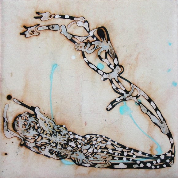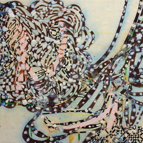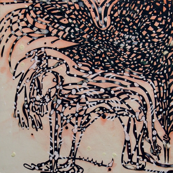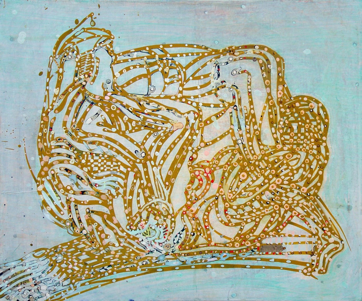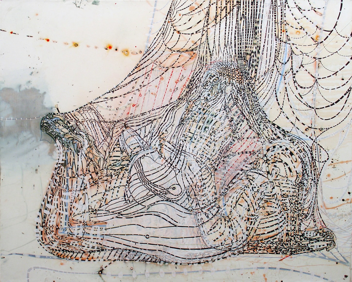 The Lovelife series, inspired by an array of seemingly unconnected sources – ancient maps, human and equine forms, ceramics, and vintage Japanese erotic prints – navigate the entangled forms of lovers at play. Often suspended in constellational webs, the works are composed of the artist’s vocabulary of intertwining lines and pocked by trademark drops. The paintings chart a wide range of human emotion and thought, and are at times a treatise on the wholeness of a human being, at others an exploration of questions of mortality, sex, and the constant chemical and biological transformations that are the basis of human existence. The viewer may look into and through human forms into a map of the stars, giving the paintings a rhythmic energy and articulating the connections between forms and the spaces they inhabit. Slowly, figure grows into ground and ground into figure, until one isn't sure whether one is inside or outside, above or below.