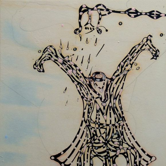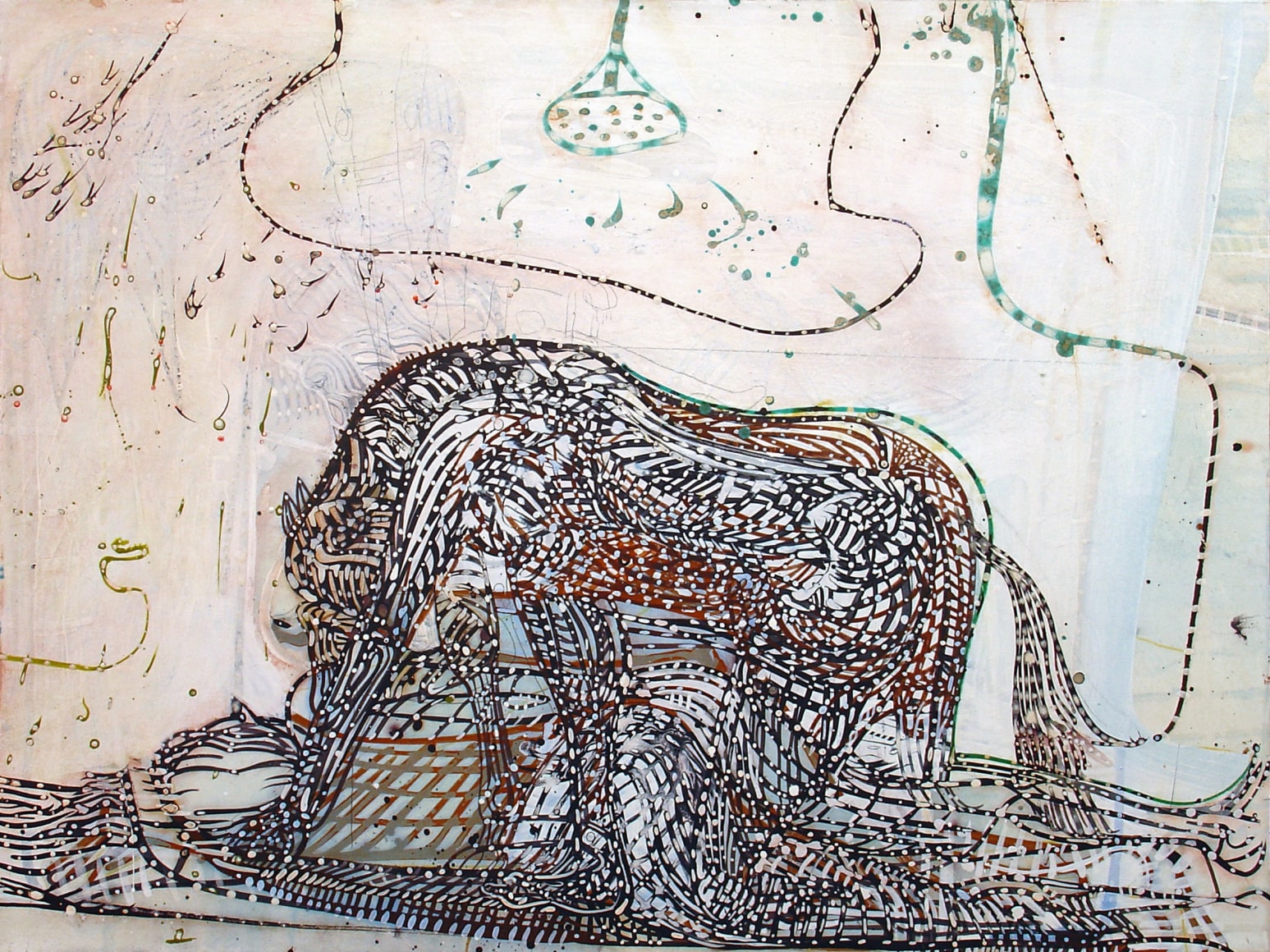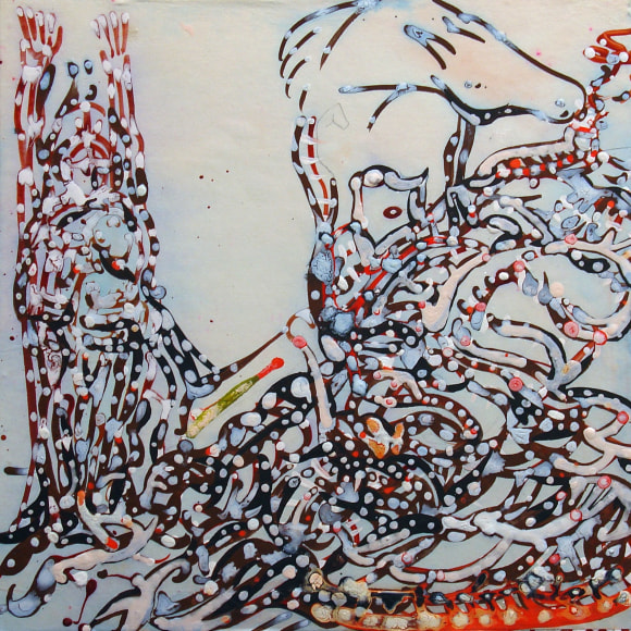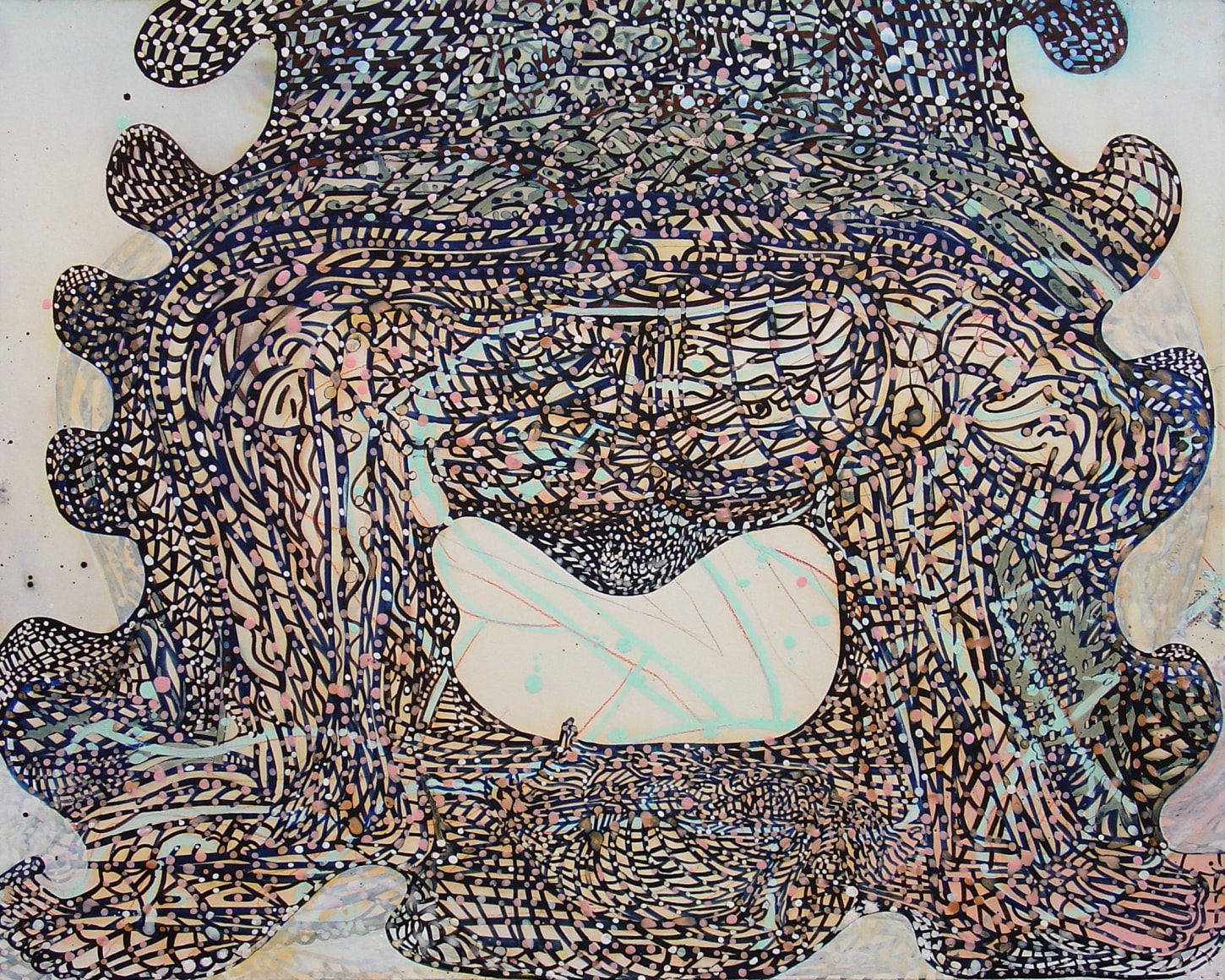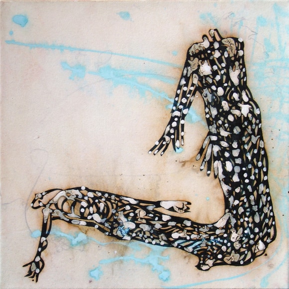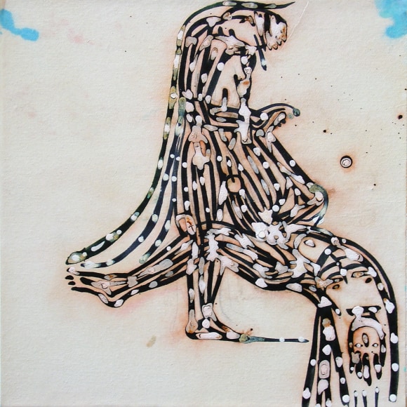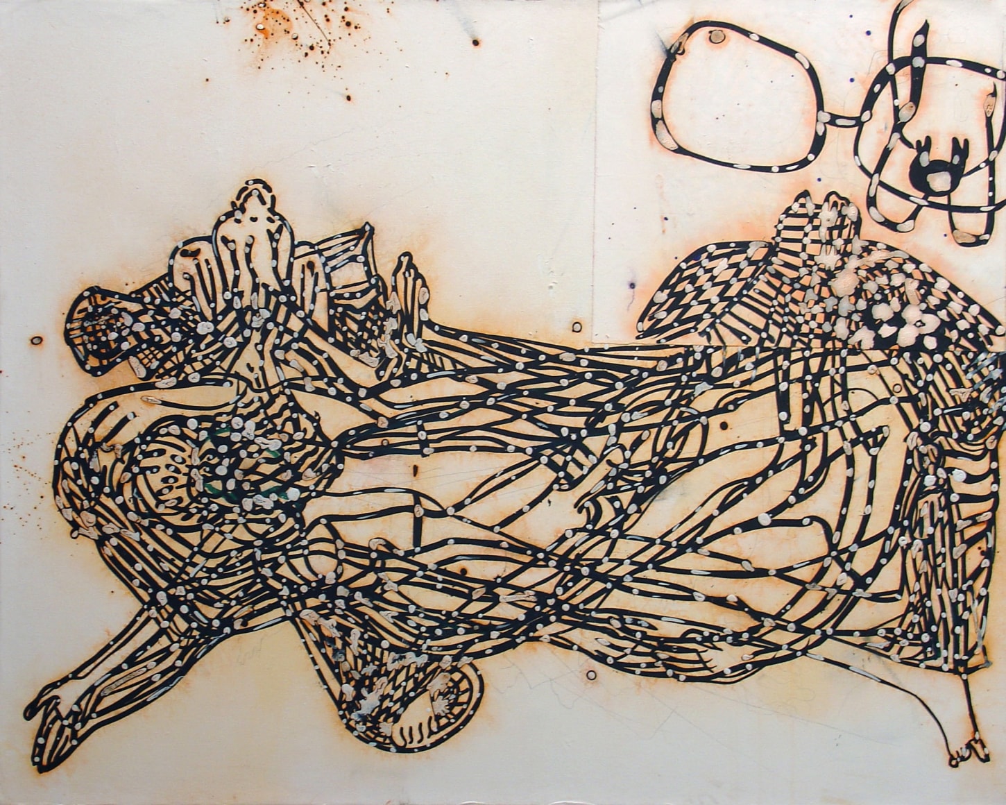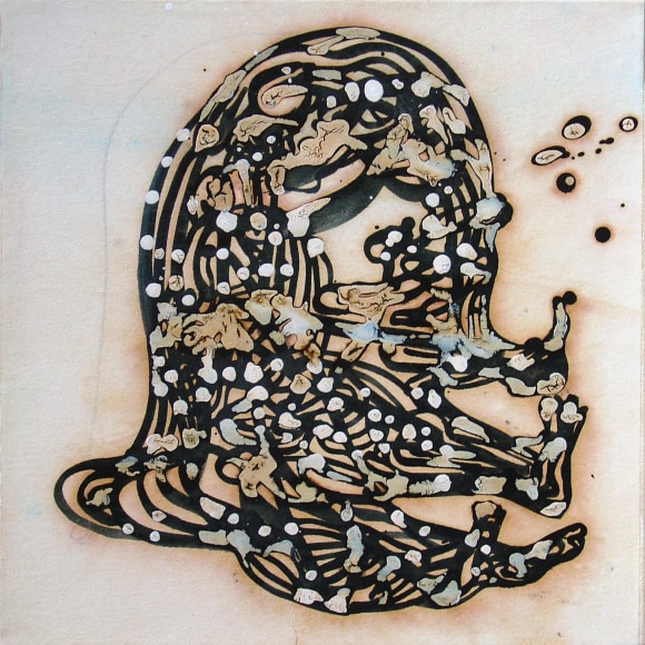 The Lovelife series, inspired by an array of seemingly unconnected sources – ancient maps, human and equine forms, ceramics, and vintage Japanese erotic prints – navigate the entangled forms of lovers at play. Often suspended in constellational webs, the works are composed of the artist’s vocabulary of intertwining lines and pocked by trademark drops. The paintings chart a wide range of human emotion and thought, and are at times a treatise on the wholeness of a human being, at others an exploration of questions of mortality, sex, and the constant chemical and biological transformations that are the basis of human existence. The viewer may look into and through human forms into a map of the stars, giving the paintings a rhythmic energy and articulating the connections between forms and the spaces they inhabit. Slowly, figure grows into ground and ground into figure, until one isn't sure whether one is inside or outside, above or below.