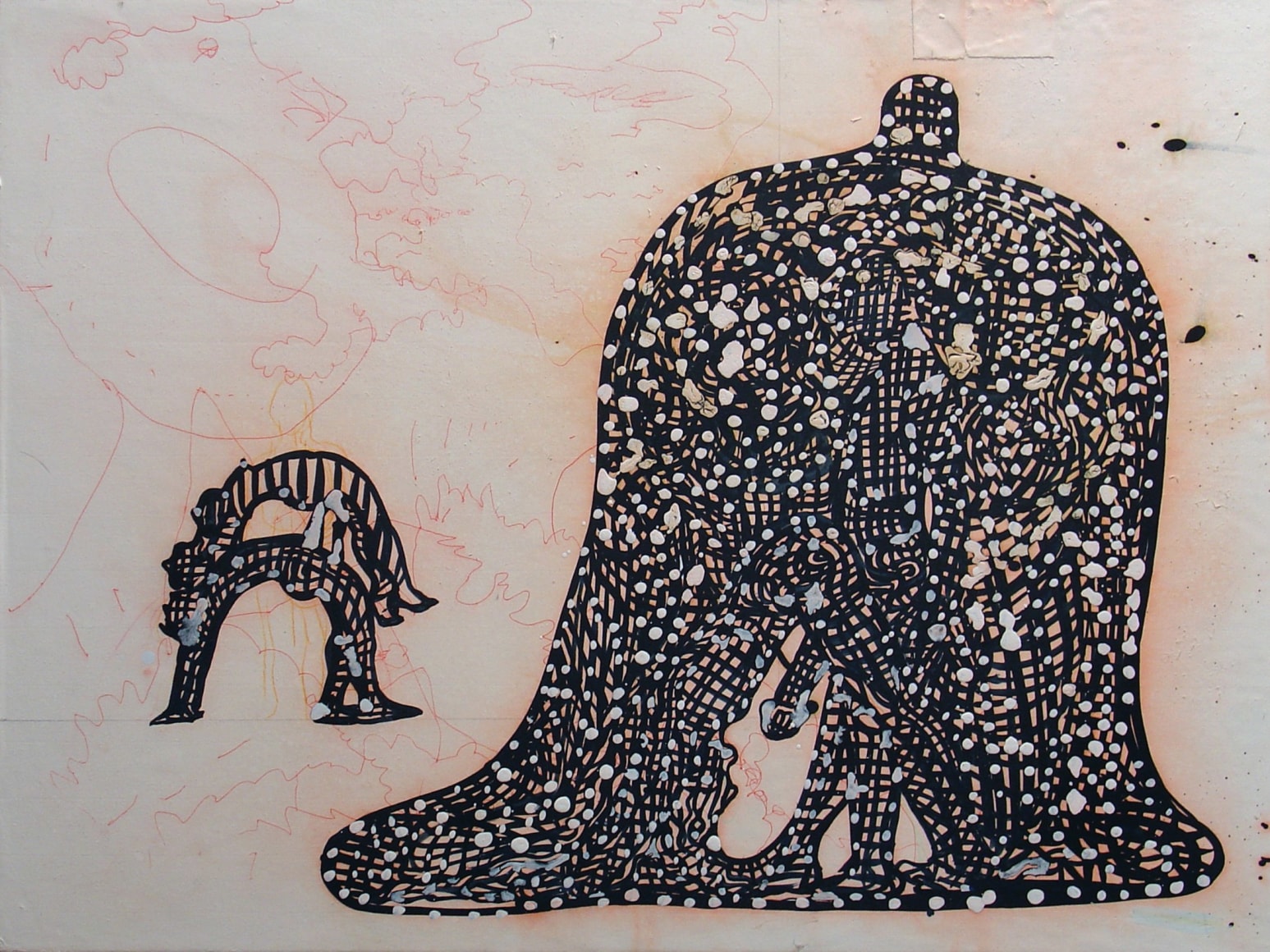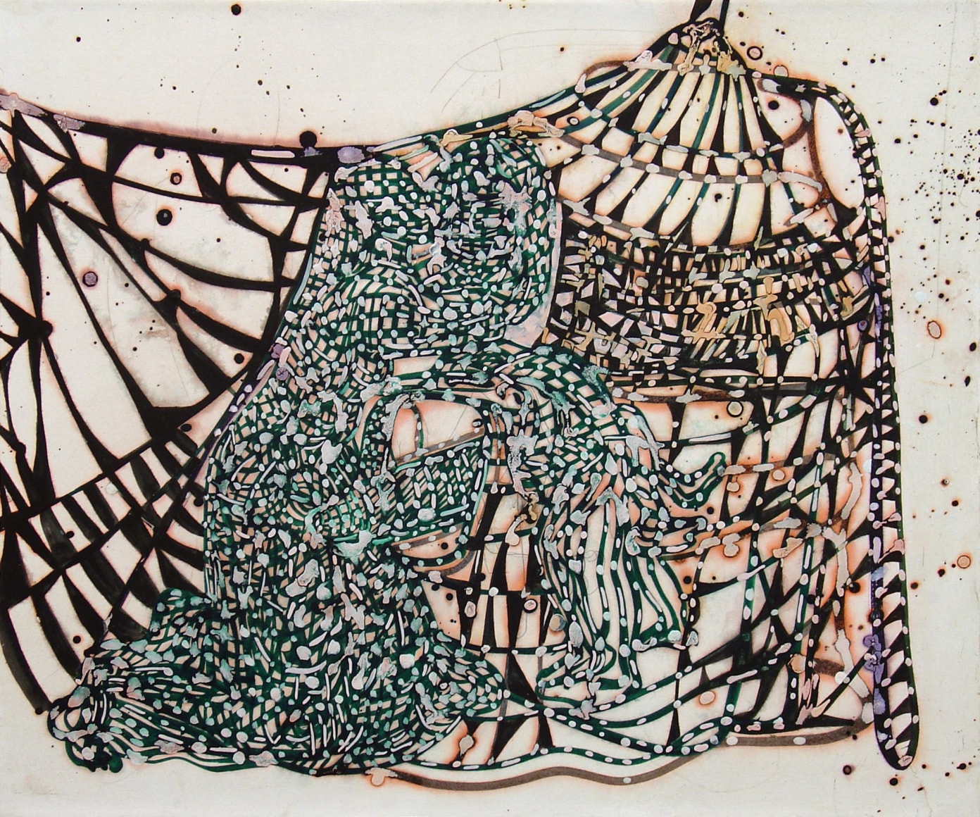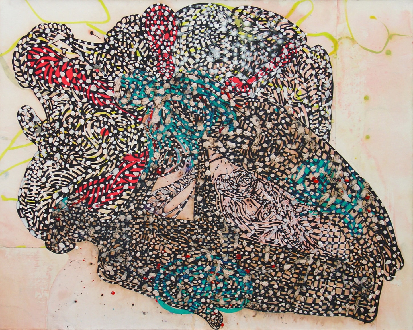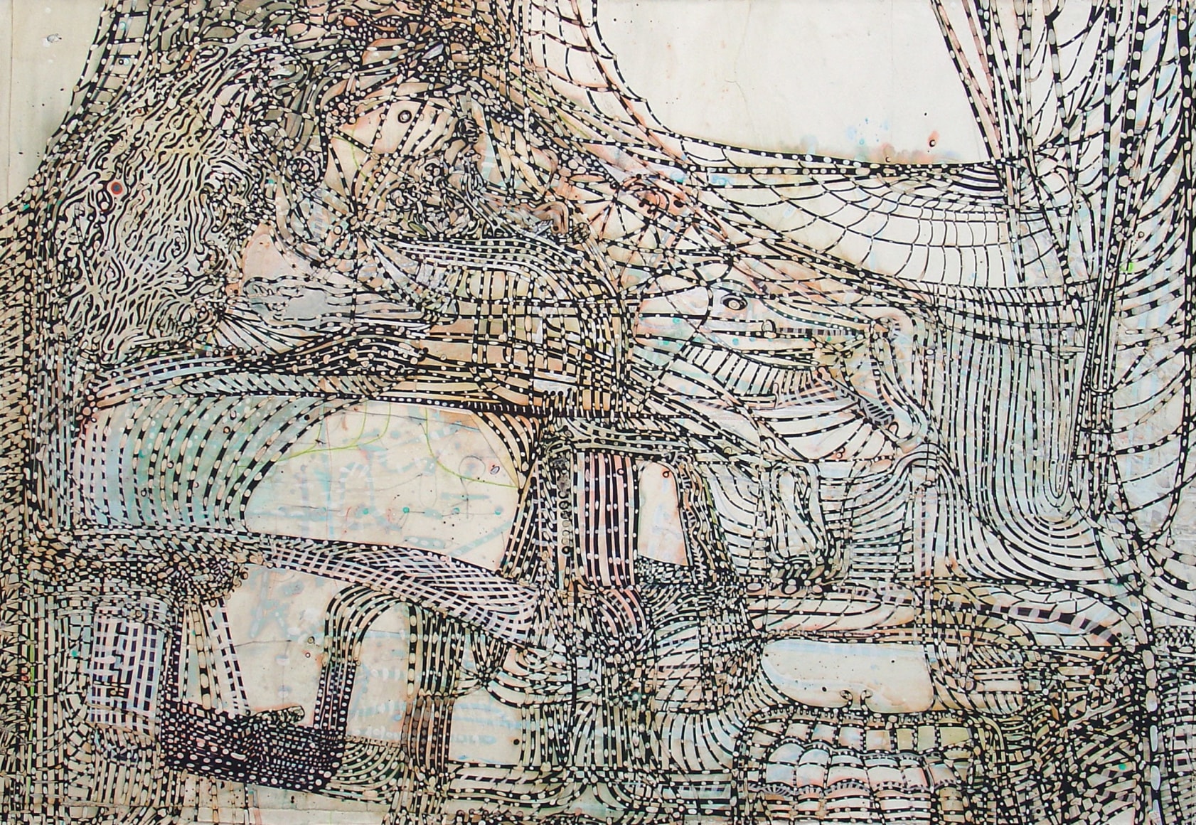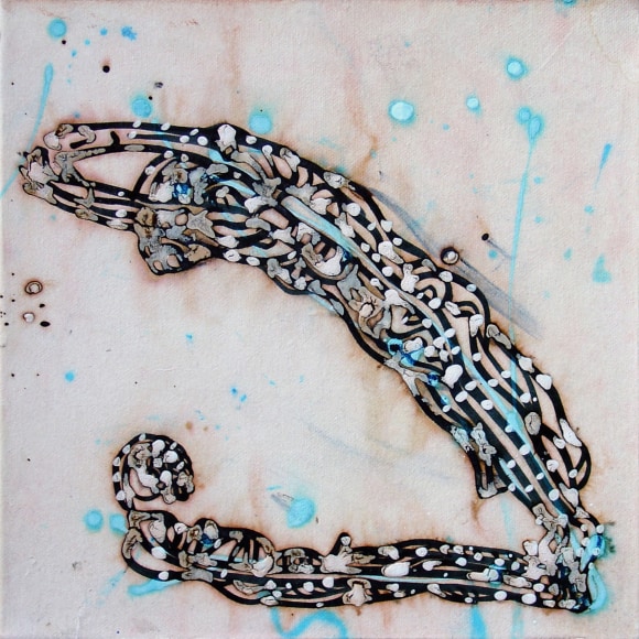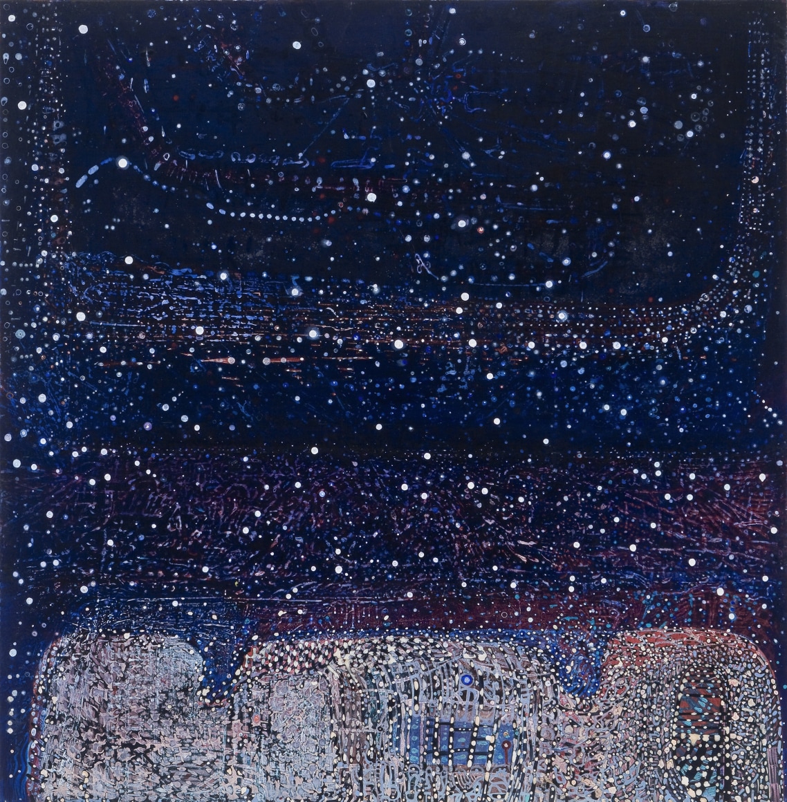 The Lovelife series, inspired by an array of seemingly unconnected sources – ancient maps, human and equine forms, ceramics, and vintage Japanese erotic prints – navigate the entangled forms of lovers at play. Often suspended in constellational webs, the works are composed of the artist’s vocabulary of intertwining lines and pocked by trademark drops. The paintings chart a wide range of human emotion and thought, and are at times a treatise on the wholeness of a human being, at others an exploration of questions of mortality, sex, and the constant chemical and biological transformations that are the basis of human existence. The viewer may look into and through human forms into a map of the stars, giving the paintings a rhythmic energy and articulating the connections between forms and the spaces they inhabit. Slowly, figure grows into ground and ground into figure, until one isn't sure whether one is inside or outside, above or below.