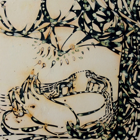 Horvath, both of whose parents worked with ceramics, emphasizes the tactile qualities that paint shares with glazed ceramics, alluding also to fresco painting and parchment. Horvath works the paper surfaces like a painting, allowing pigments and washes to build up (once the image is complete, the paper is mounted to a canvas or wood support). The transformation of material substance which seems to take place during Horvath’s creative process likewise reflects the essence of her subject. Whether playfully overt or obfuscatory, these tightly-knit lovers seem caught in the very midst of physical and psychic transformation.