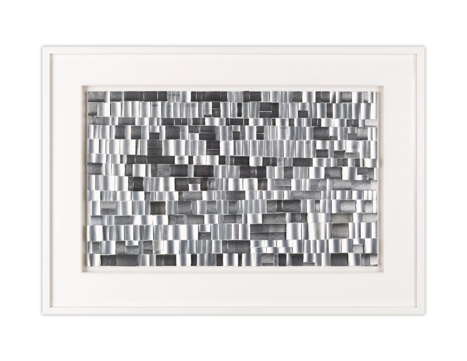Providing an arguably mechanical coldness and a uniform composition, the piece Green Aluminum Circuit expertly repurposes the interiors of aluminum cans to simulate a matrix of computer circuitry and code, a language that many of us overlook despite our well-established reliance and familiarity with modern technology. The incorporation of technology and it’s blending with language extends to Magee’s Apostrophe, a work which uses a screenshot of punctuation the artist texted himself as the basis for an oil painting on panel that further shows the limitless ways we converse. Magee explains, “making a painting of the screenshot has evolved into another way of expressing a language of emotion, which is what punctuation is. It adds the dynamic to written word.”
