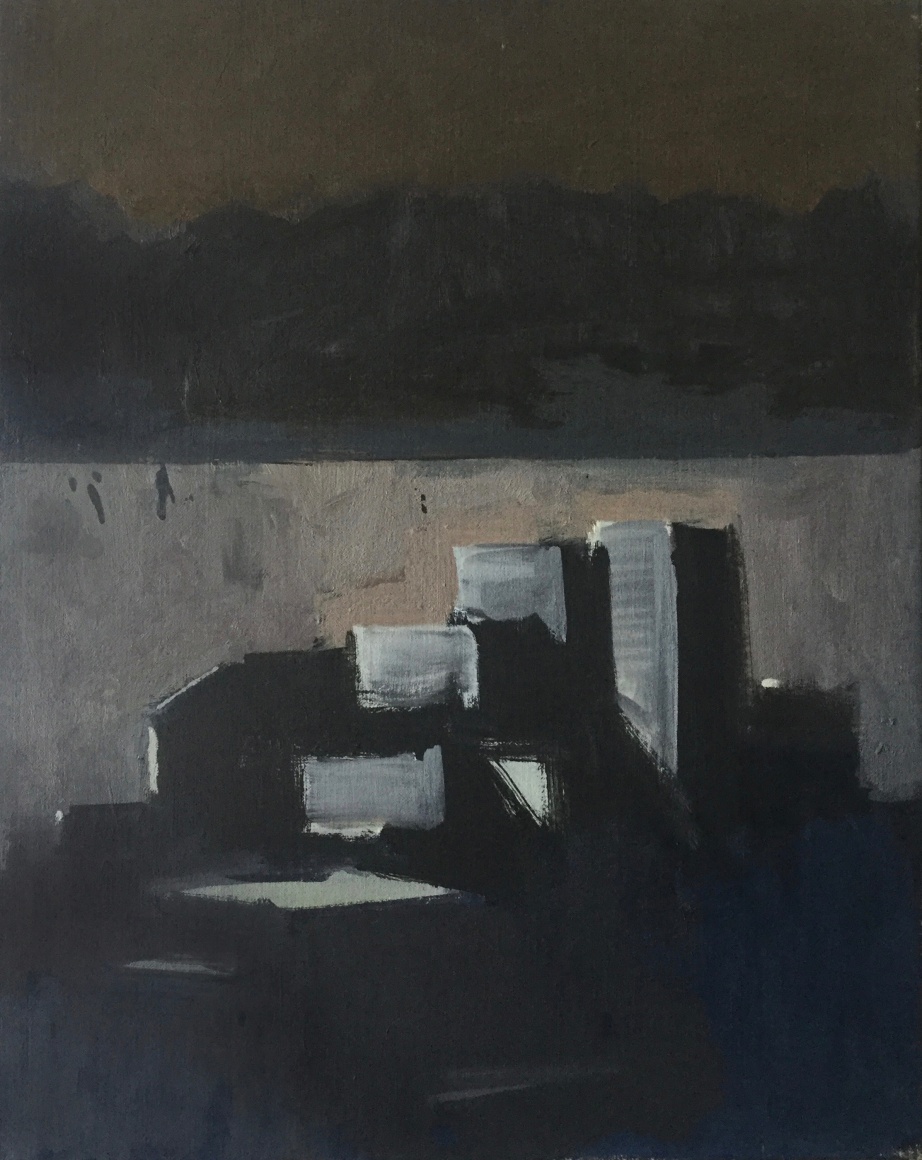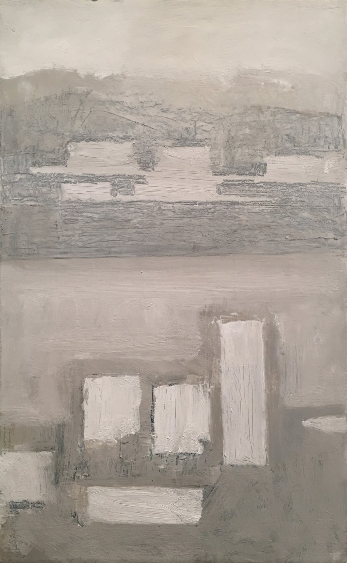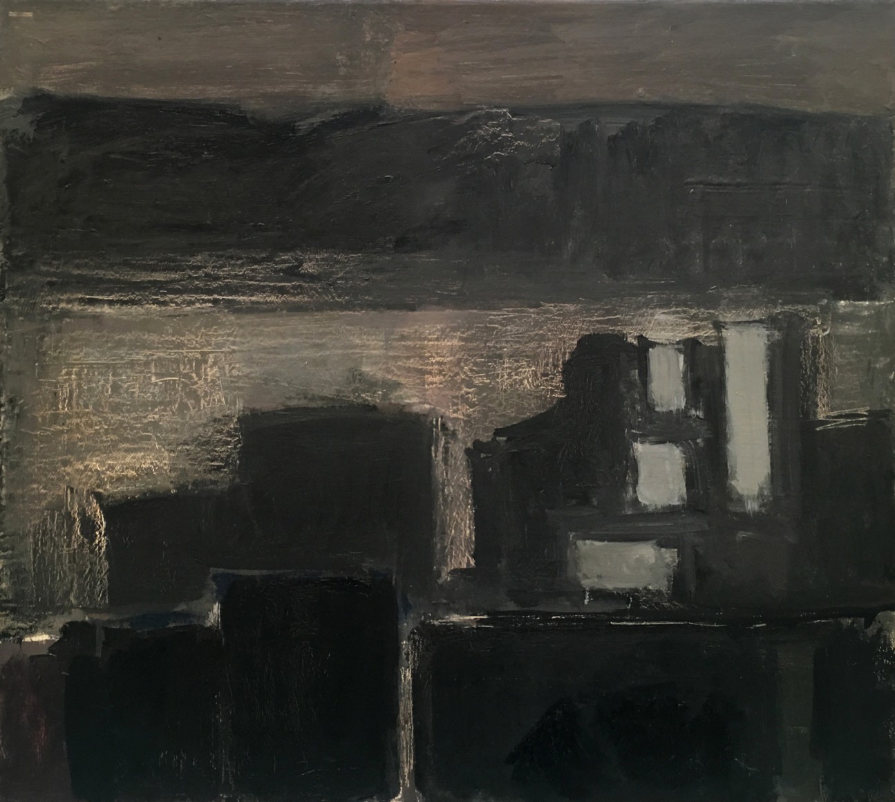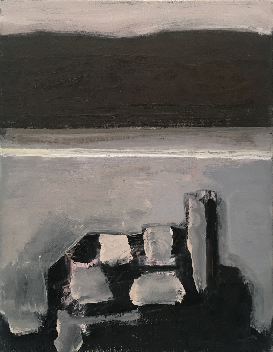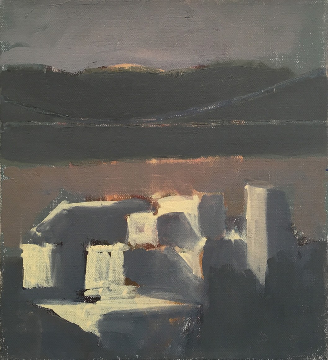 This latest body of work continues Phillips exploration of variations on single themes. The motif for the paintings in this exhibition is drawn from the view of the Hudson River as seen from the artist’s studio in Washington Heights. Abstracted views of rooftops frame the lower margin of the composition, while bands of broken color define the Hudson River, New Jersey and sky above it. Occasionally, the George Washington Bridge makes an appearance. Painted in an infinite lexicon of blacks, greys and taupes, there is a rich coloration that sits just beneath the surface of her paintings. Cool pinks, buttery yellows and prismatic blues reveal themselves beneath her seemingly monochromatic palette, adding a rich complexity to what may otherwise be described as austere.