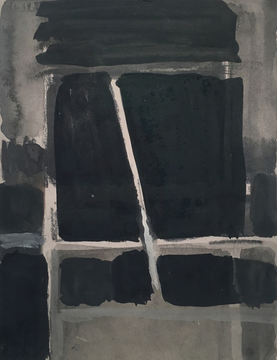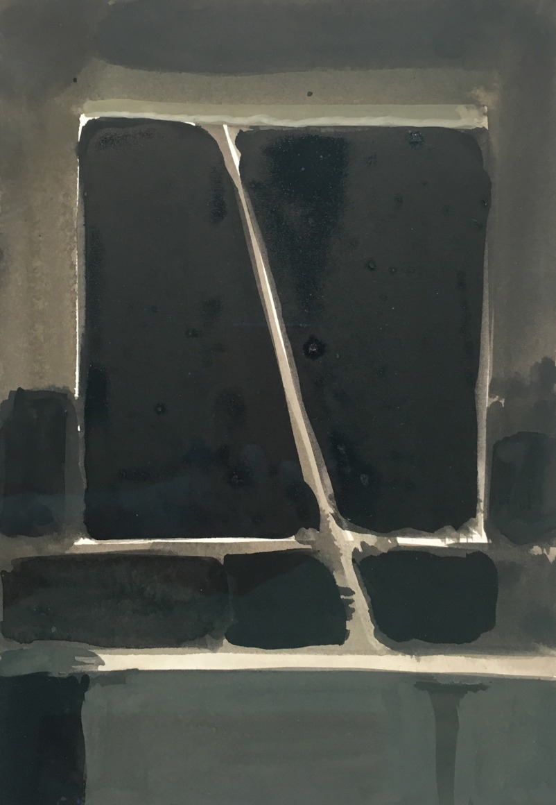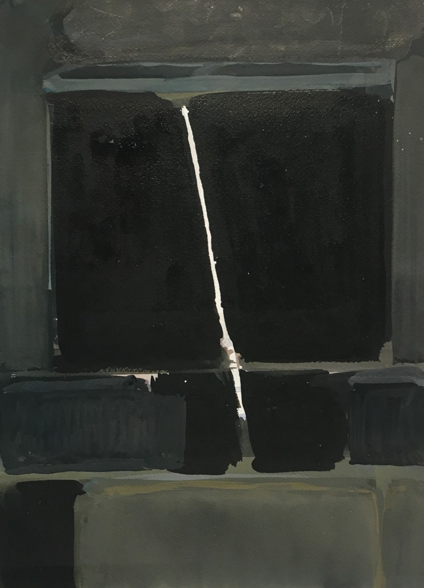The works on paper in this exhibition will also mark the debut of another new interior motif. It is constructed almost exclusively of squares and rectangles stacked one on top of the other. While this composition could easily be read as pure abstraction, its inspiration comes from a wood-paneled wall of bookshelves and an interior window in the artist’s family camp on Cape Cod. Sometimes, a stick props open the window at the center of the composition, bisecting the staid grid of rectangles behind it.