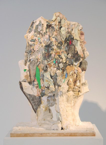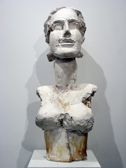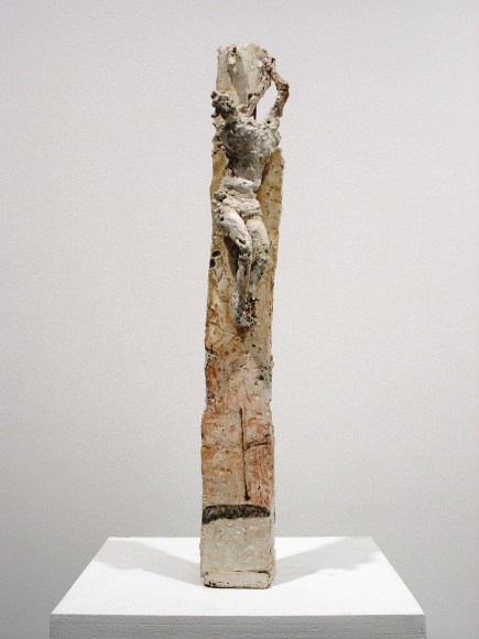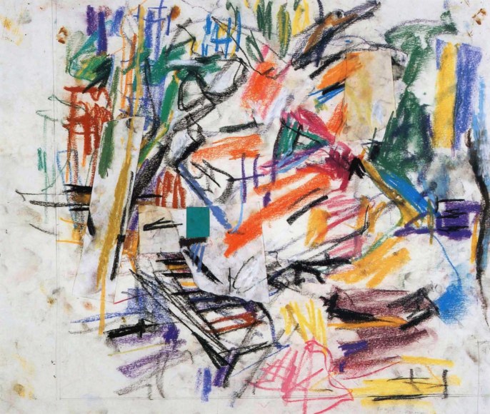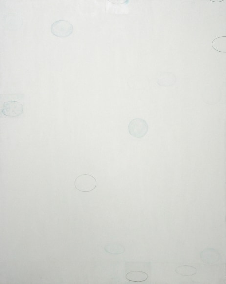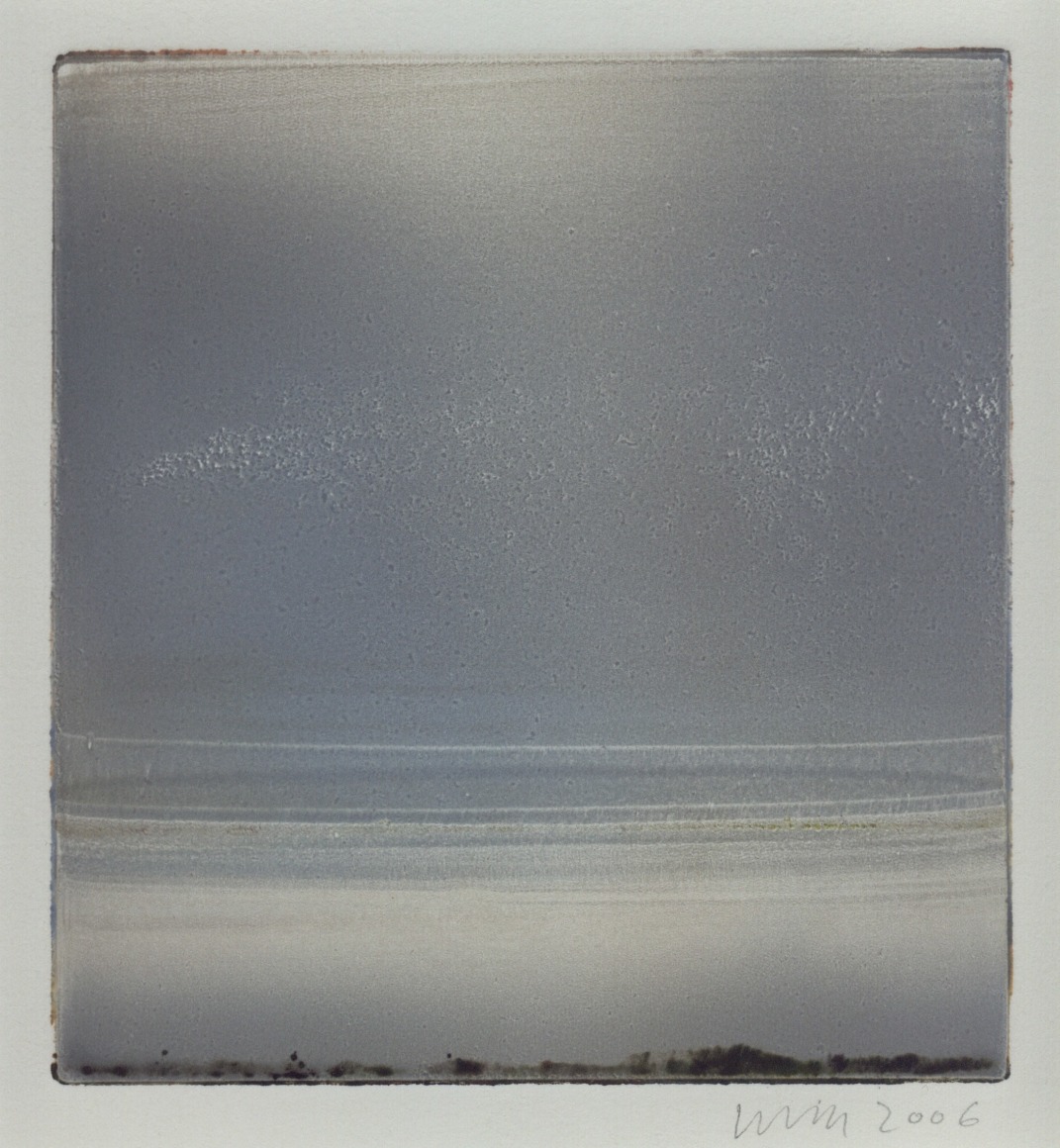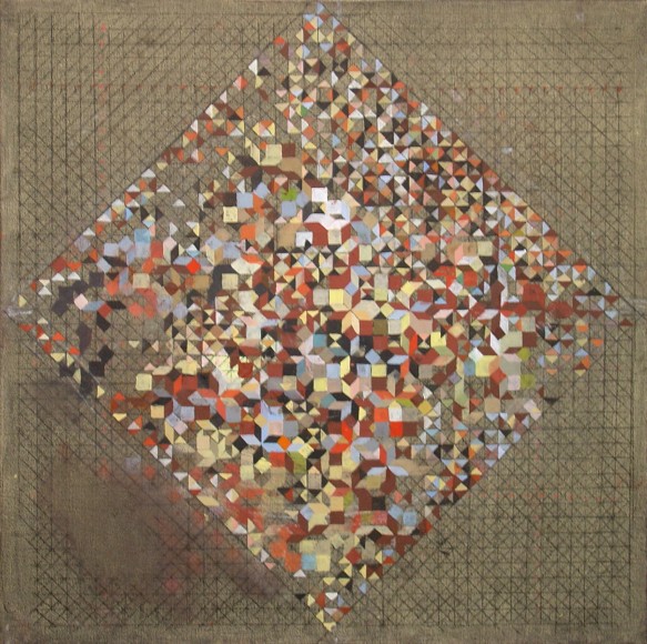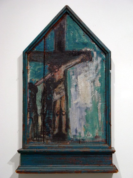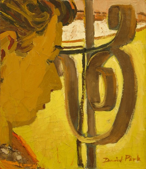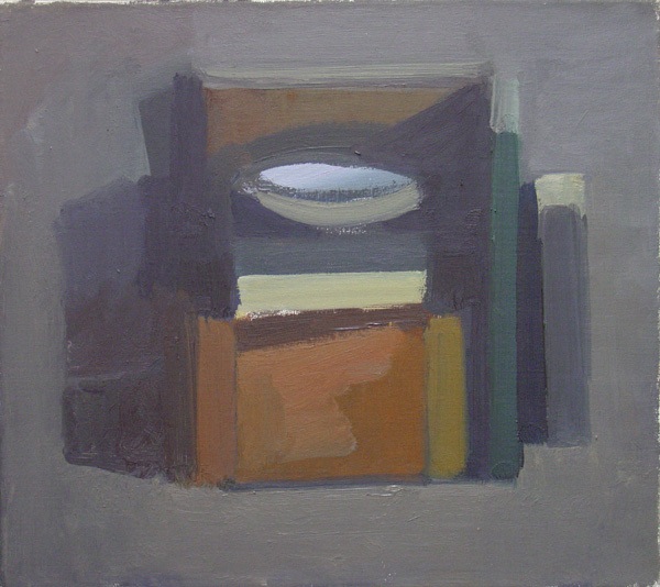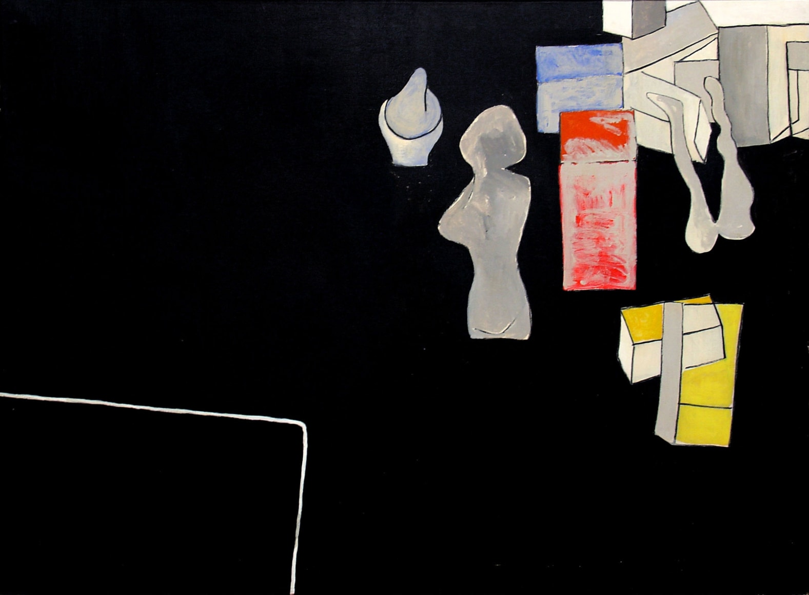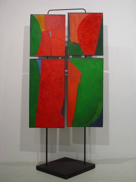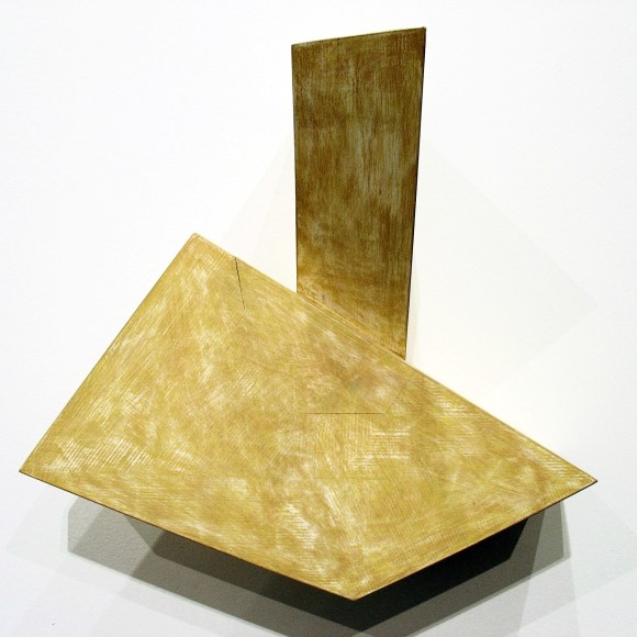 Oil, tape and sand on canvas, laid down on board, wood and metal
