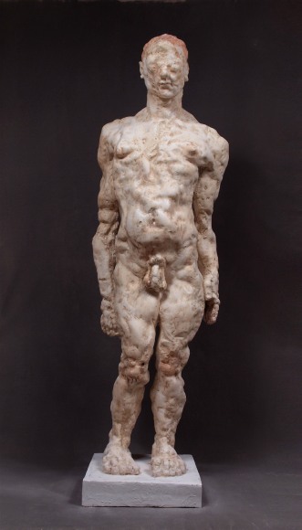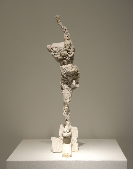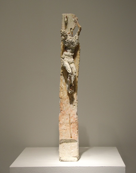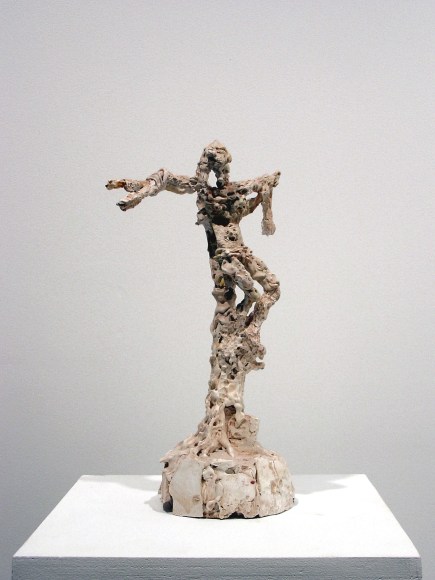 On exhibit are a group of life-size figures, the largest Gagnier has made to date, and selected mid-size sculptures, small heads and mounted cruciform figures. The ten human-scale works, ranging from five to six feet in height and made of cast hydrocal plaster, represent a marked departure from Gagnier’s last body of work. Whereas the Otom/Otoma series (2001-06), stressed formal coherence over individual psychology, the figures of Incarnate are more so their own persons than ever, a fact emphasized by each piece’s given title: Emma, Louis and Mrs. Petit, to name a few.