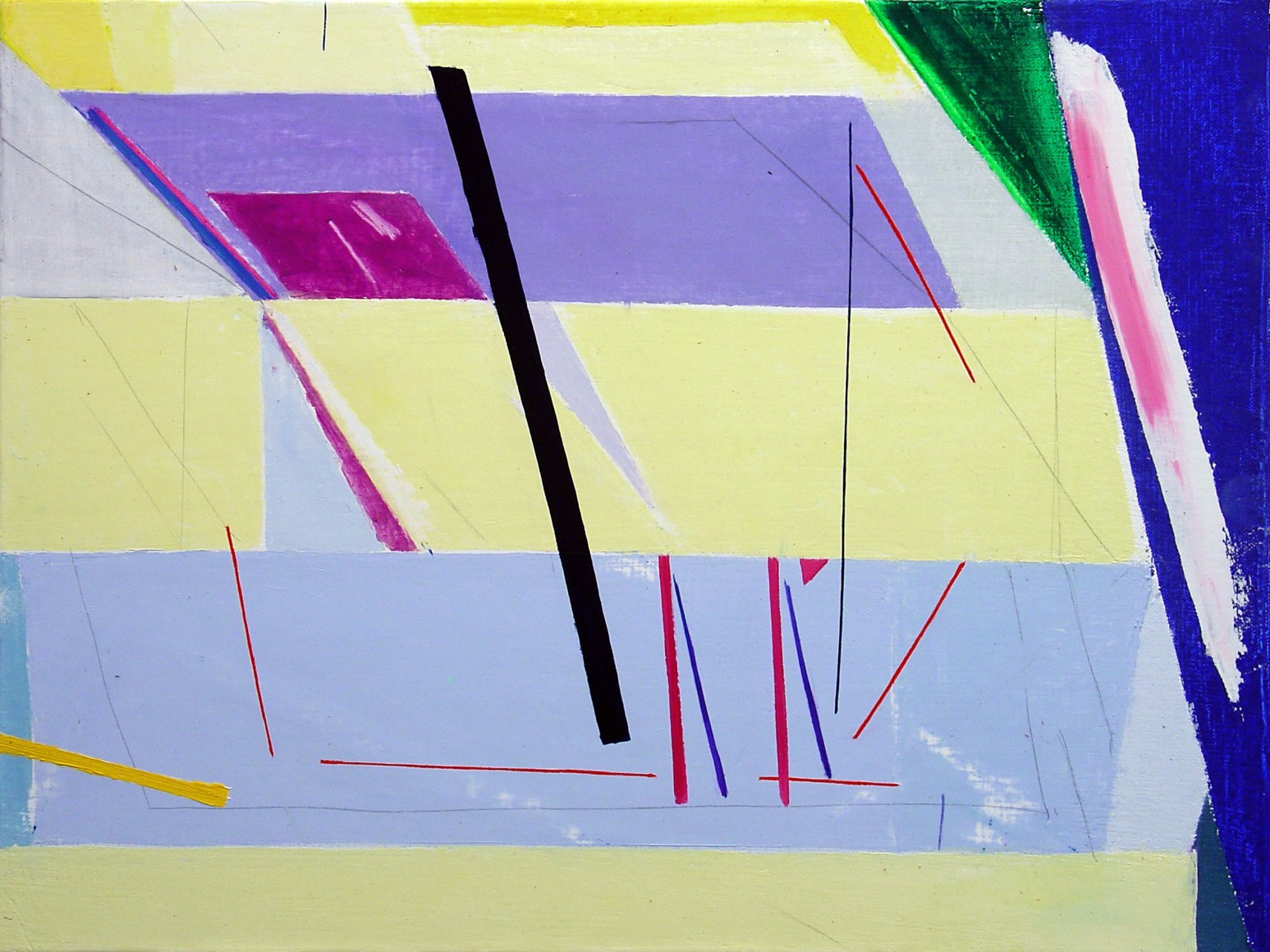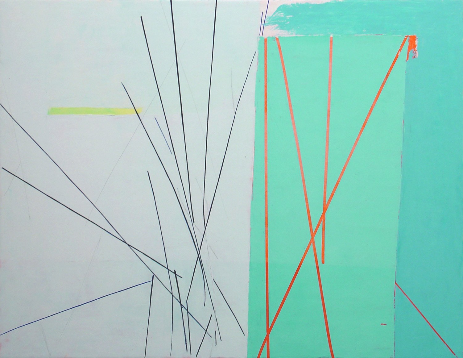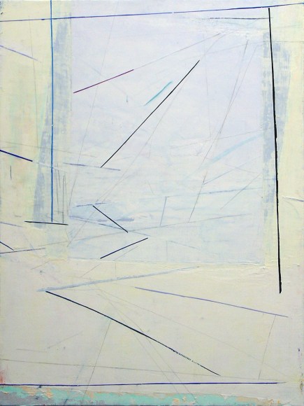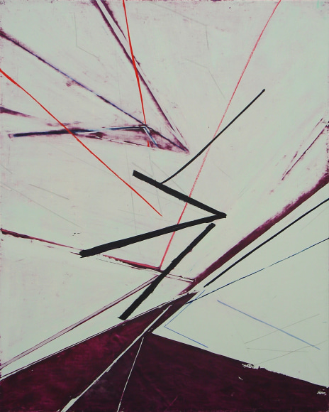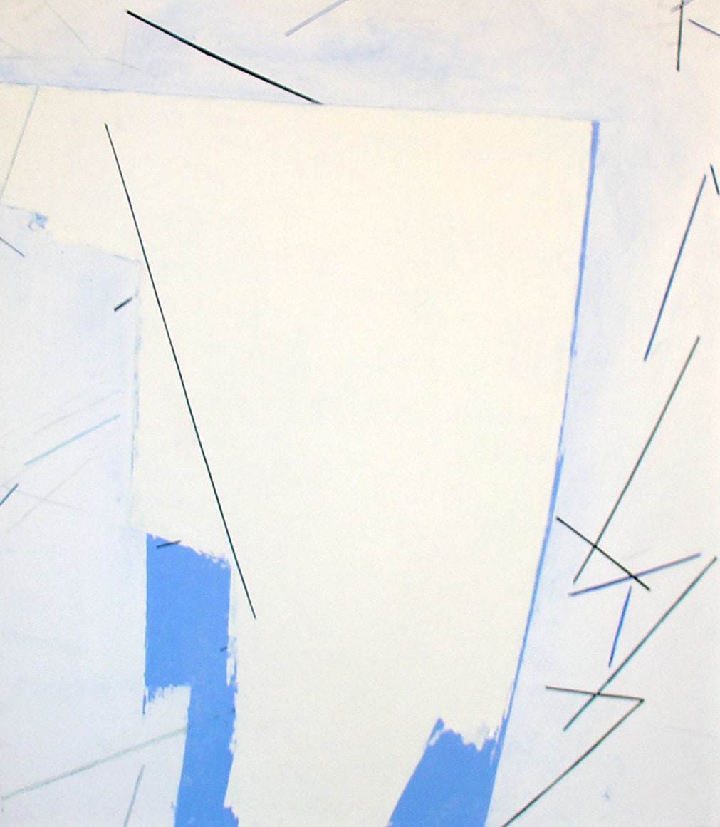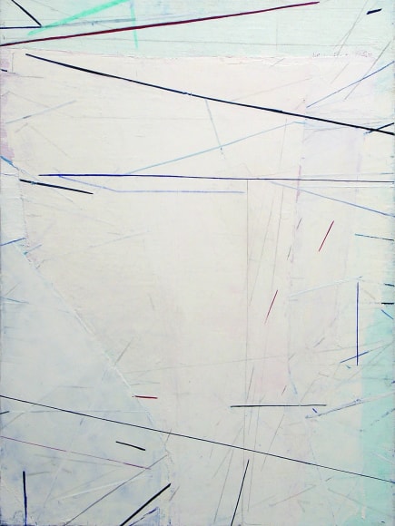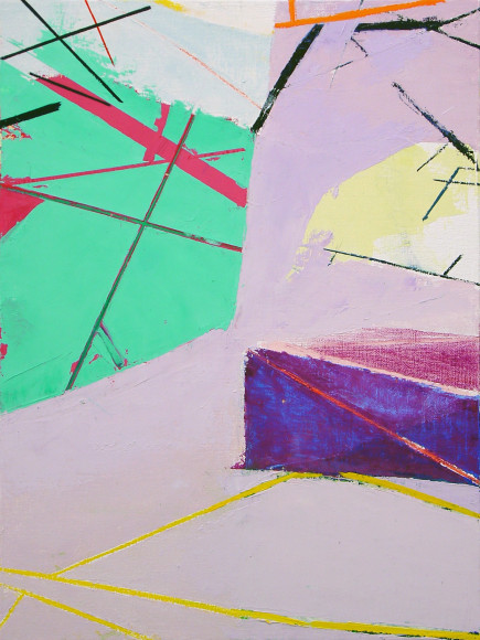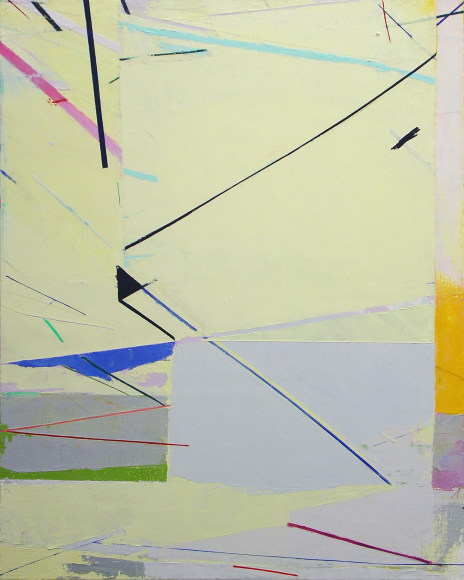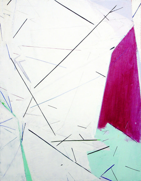 Color planes engage linear networks that seem to be in a state of motion. Everything coheres, comes apart, and reconfigures. Subtle drawing contrasts with bold swaths of color. The painting is a contested ground in which the artist contrasts, intersects, and overlaps different kinds of spaces. Expansive, fractured, and compressed spaces and planes meet, as if in a heated debate.