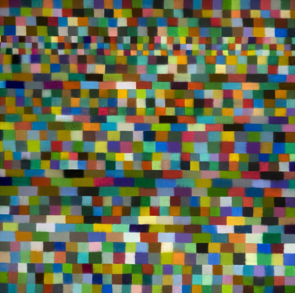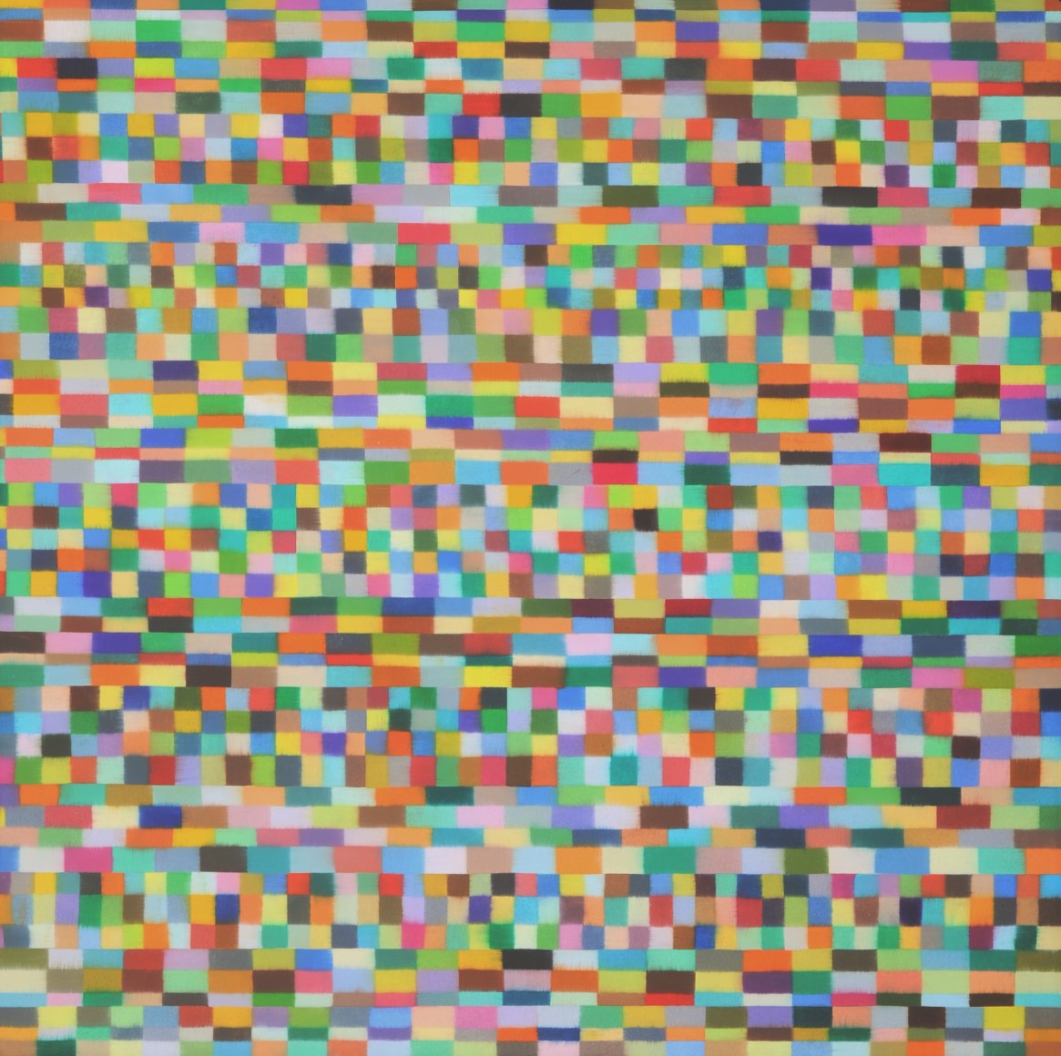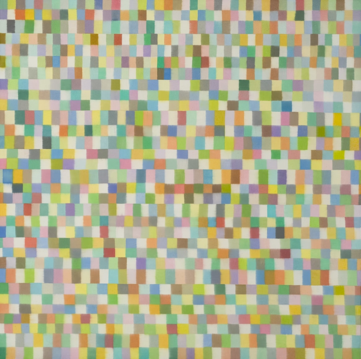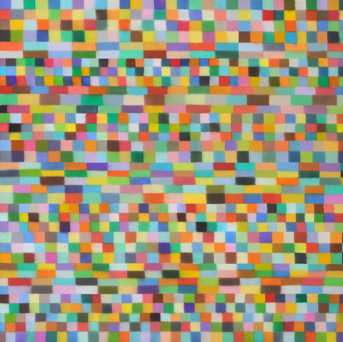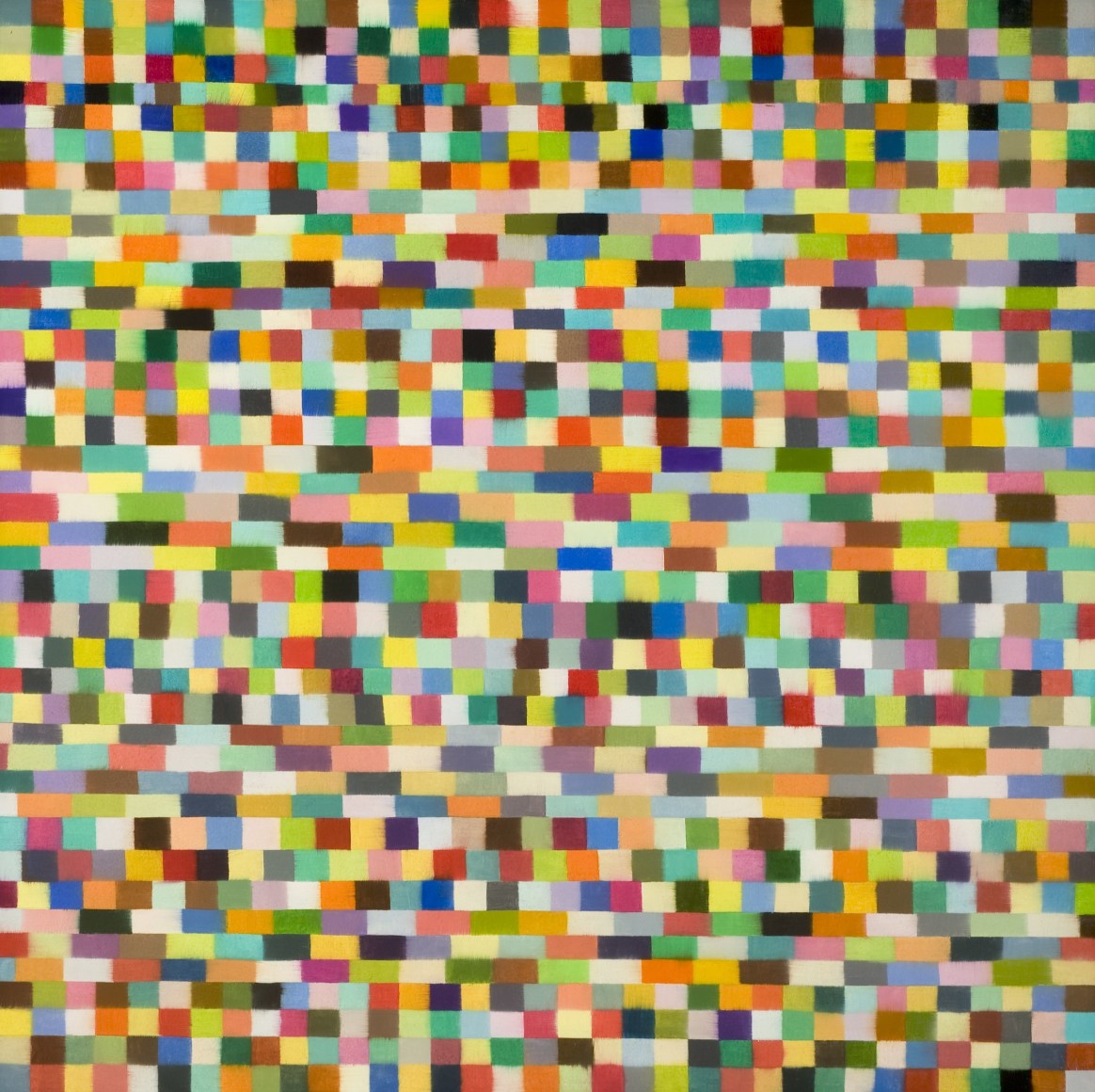 The paint is applied meditatively, not gesturally or obsessively. Mistakes, when they occur, are allowed and left to be seen. No two colors are alike, and each one is chosen in a casual, unconscious way. Each one represents a journal of many hours, marked in a method that slowed time for the artist as she worked to cover the surface, painting it from top to bottom, one color after another.