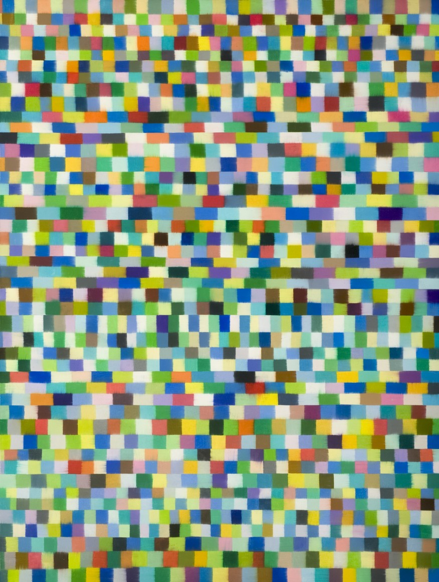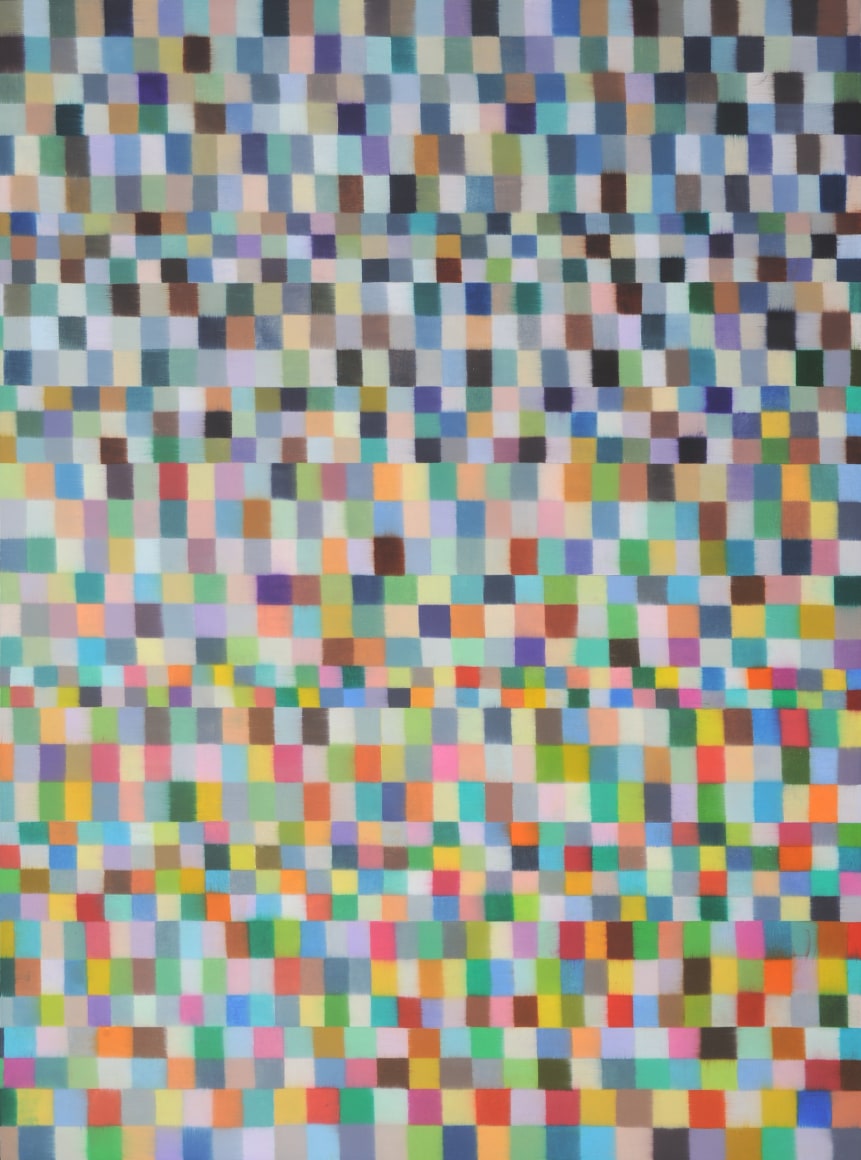 The eight non-representational paintings that make up this show were done over the last three years. They represent an obvious progression from her previous series, but are considerably more detailed, each panel being covered by a myriad of rectangles which blanket the surface in an unbroken array. Their plurality is reminiscent of the multiplicity which meets the eye whenever we are in nature, surrounded by its uncountable repetitions. Many years of painting landscape from life, as well as the artist's early exposure to the art of the Bauhaus movement have greatly influenced this most recent work. The profusion of color can also bring to mind the mosaic murals that the artist first saw in Ravenna, in the 1970s, which are made of millions of tiny, shimmering glass tiles.