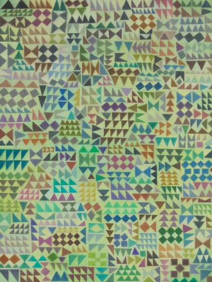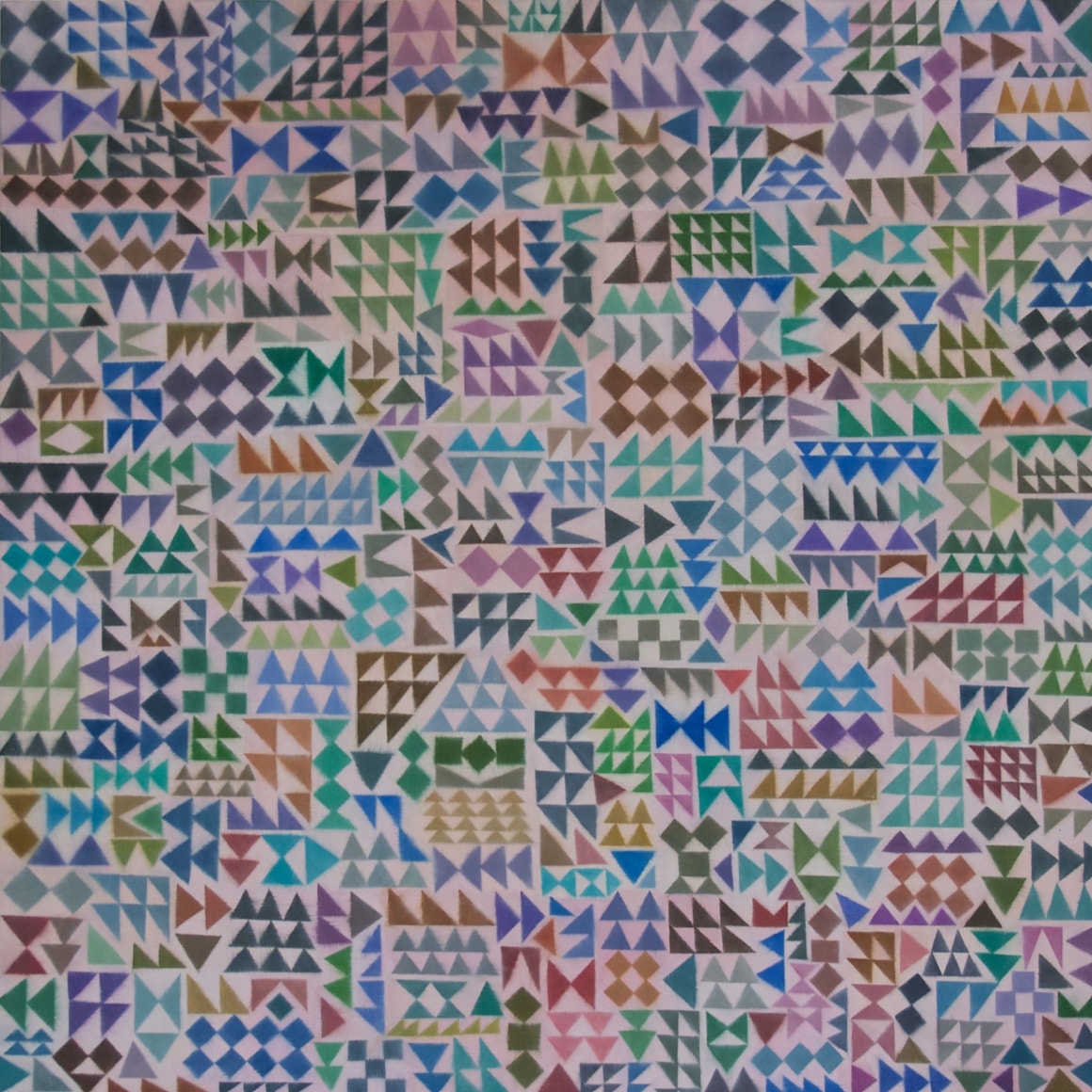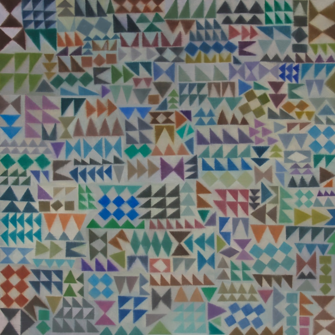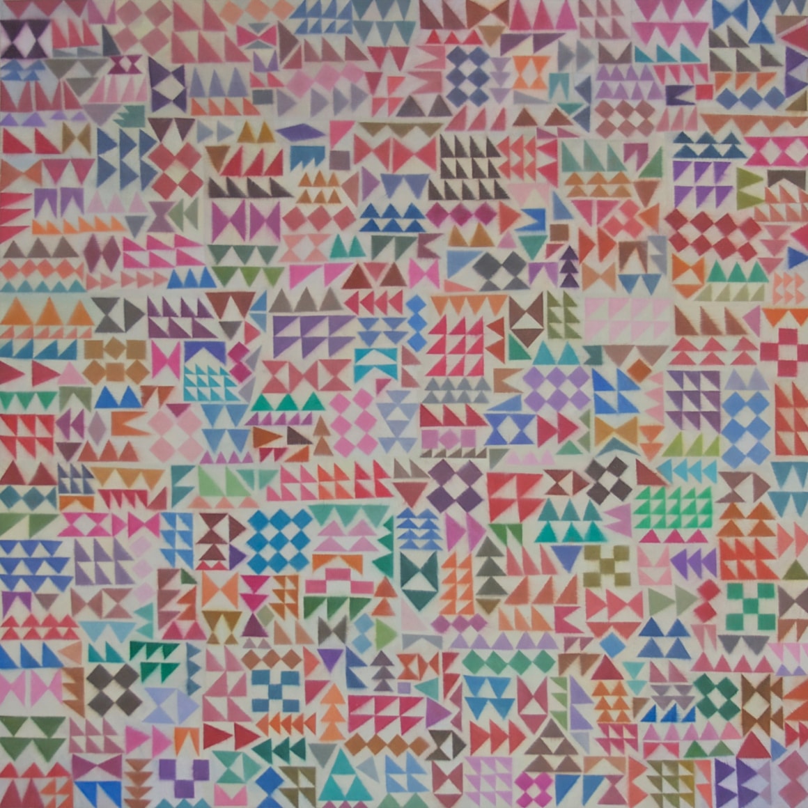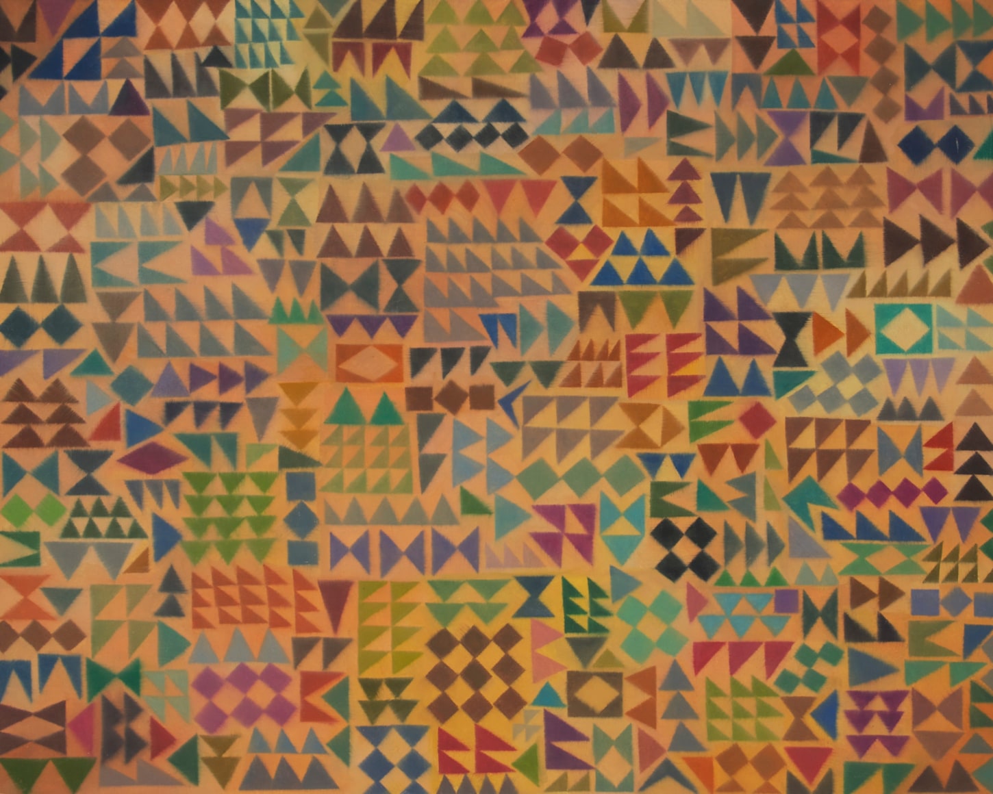 They resemble and are inspired in part by the sparkling patterns of hand-sewn quilts, softened by use, the often inexact repetitions found in primitive textiles like Kuba clothes, woven in raffia in the Democratic Republic of Congo, and Cuneiform, an ancient script which exists on the cusp of pictographs and letters, written with symbols as delicate as birdsong or the tracks of animals in wet earth.