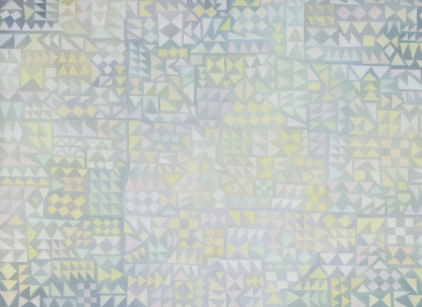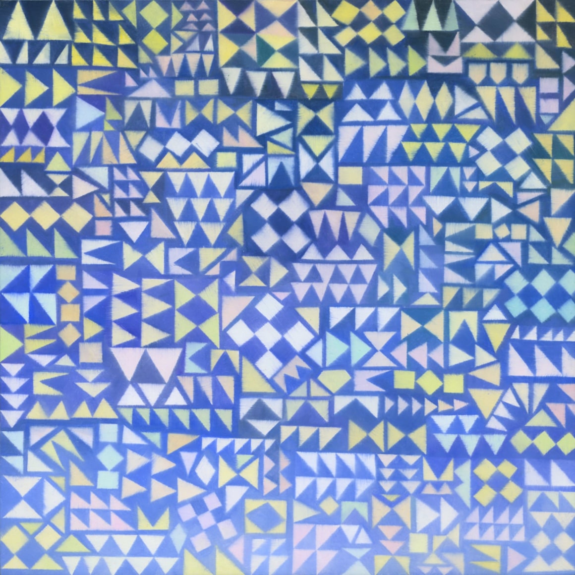 The liveliness that results from her freehand application of paint references the natural world and adds an organic quality to these paintings in which geometric icons are arrayed over fields of shifting color.