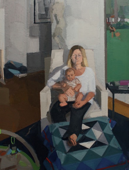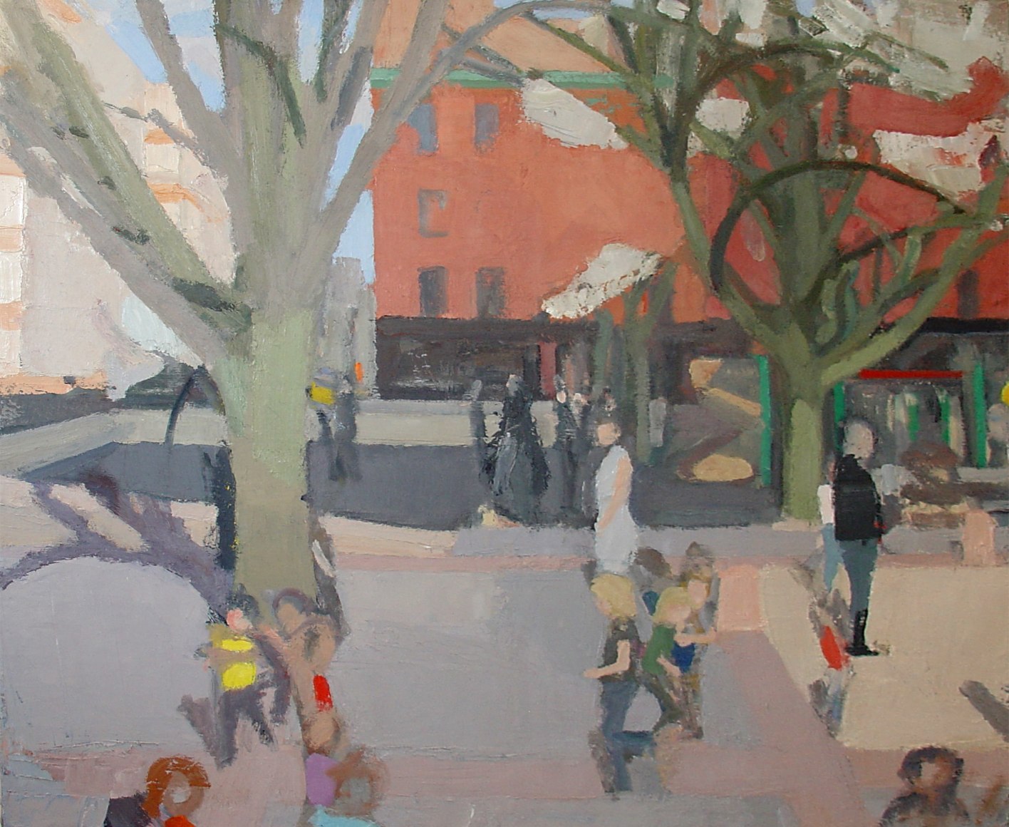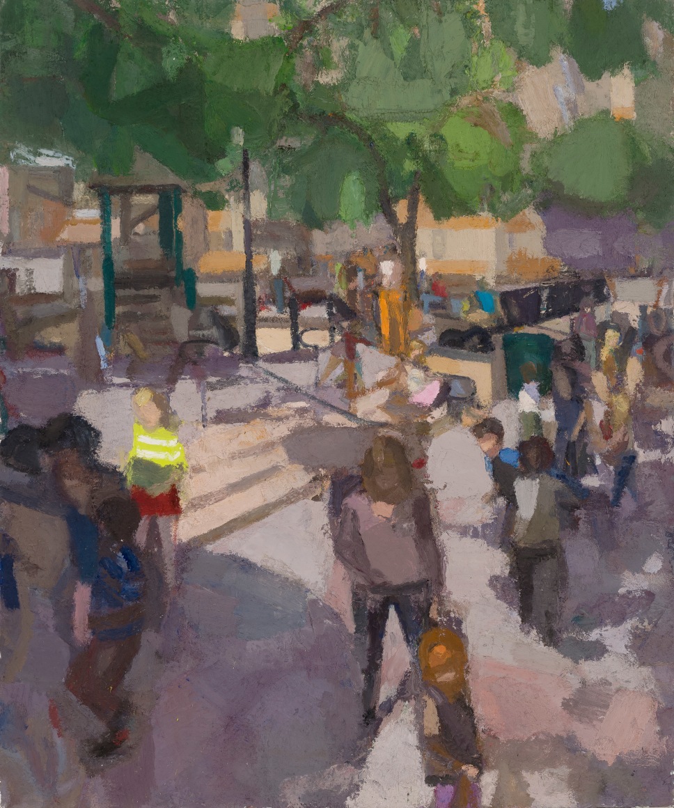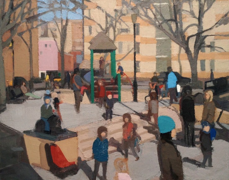 There is also a noticeably greater preoccupation in the recent work with the ways in which subjects and forms interact. (The artist's oeuvre has predominately consisted mostly of singular portraits as well as urban and rural landscape.) The playground paintings, in particular, offer a varied scale of subject matter - from child to adolescent to adult - in states of varied interaction and awareness. Likewise, his portraits, all of two or more people, exhibit a tangible awareness between the subjects. The presence of these additional subjects in the portraits attests to the ways in which we comport ourselves in the presence of others and the degree to which we do so. Thus, the interaction between artist and patron is markedly different than that between mother and child and even more so than the innocently oblivious interactions between children on the playground.