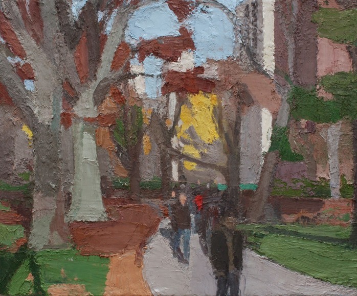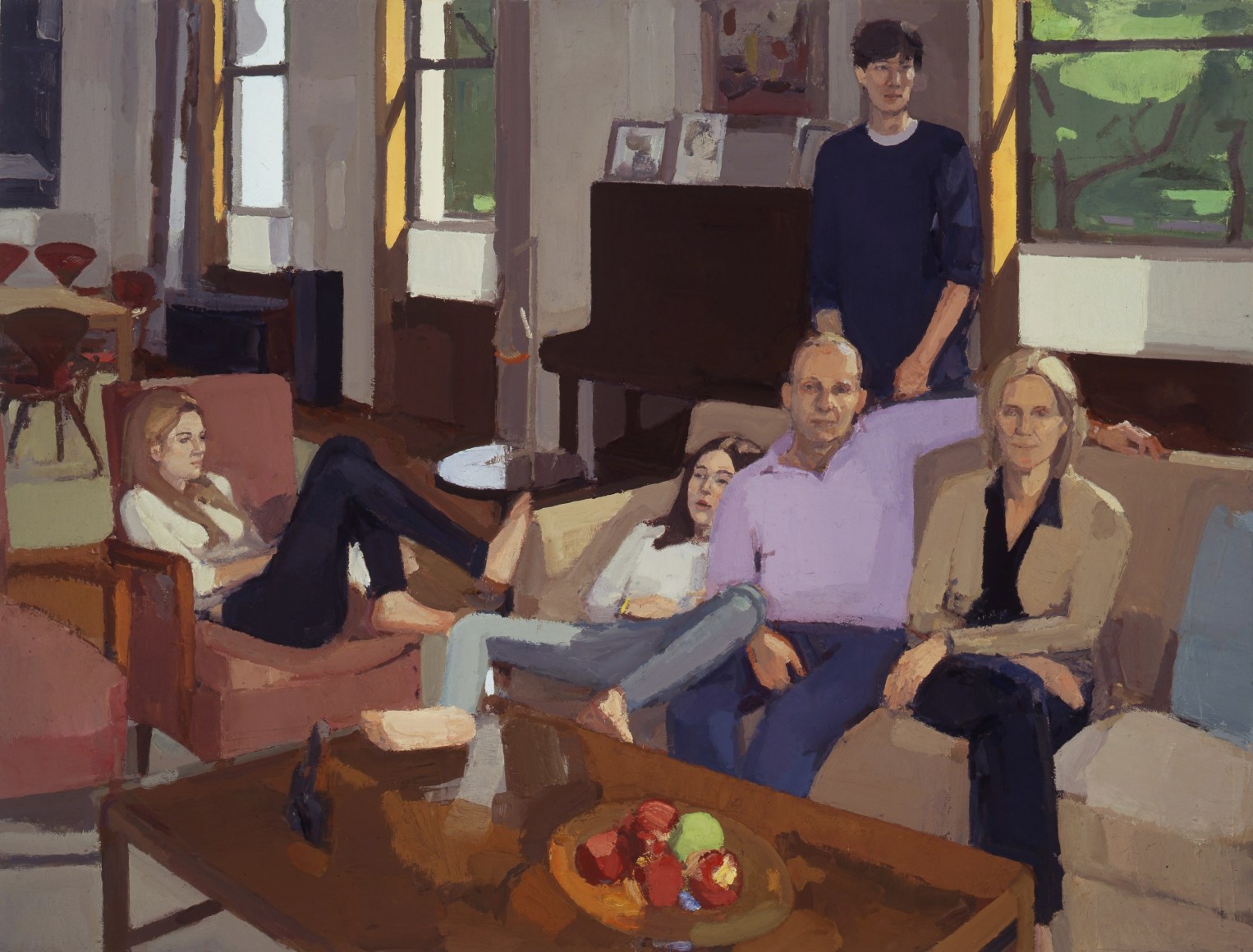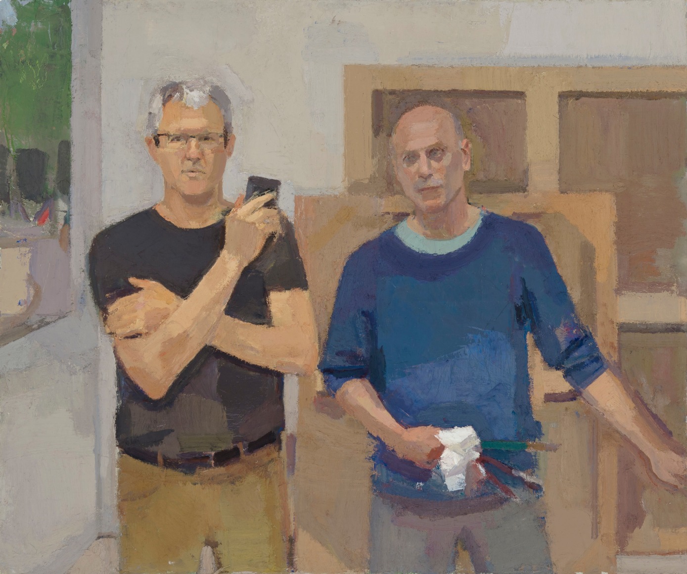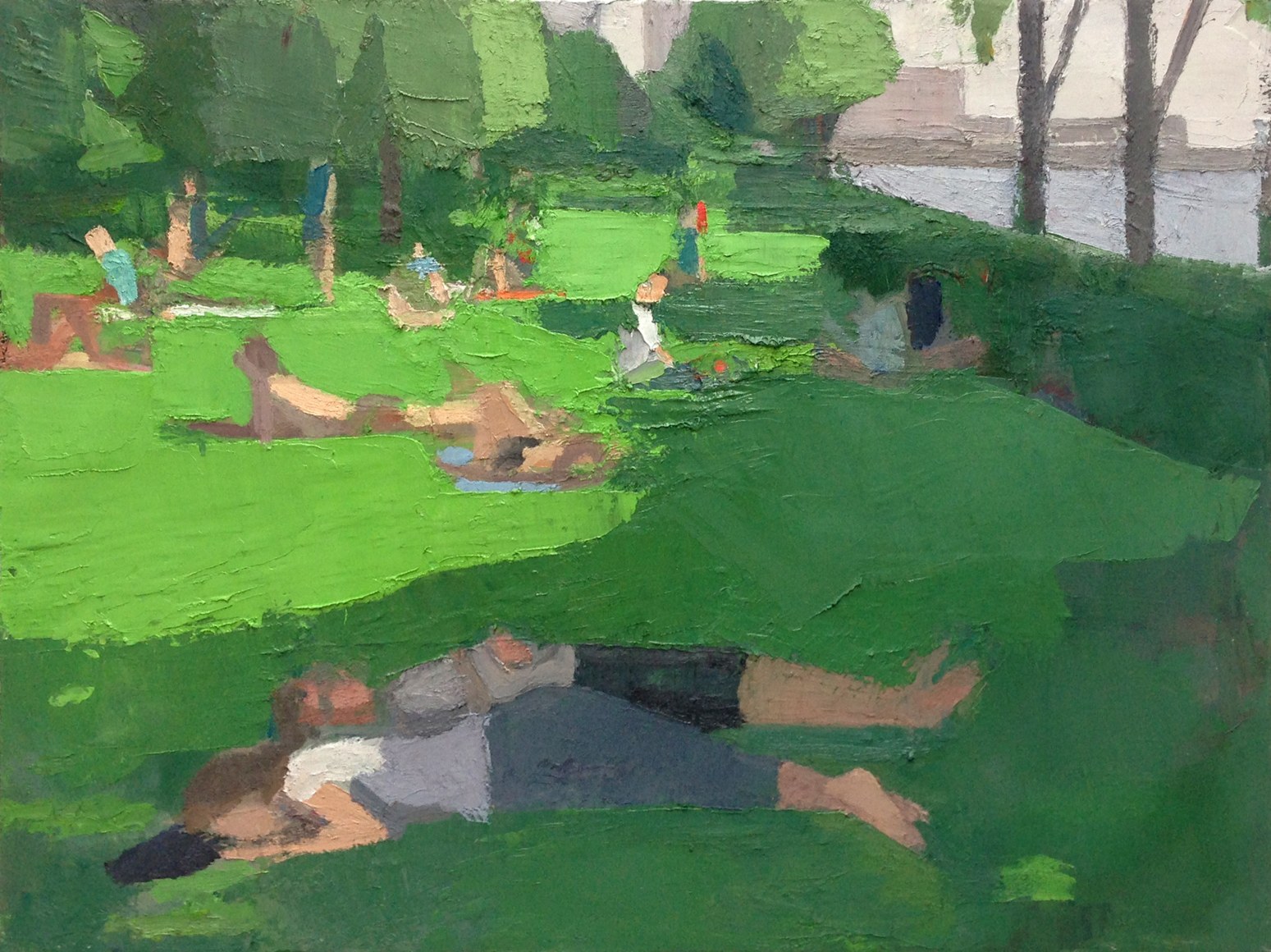 There is also a noticeably greater preoccupation in the recent work with the ways in which subjects and forms interact. (The artist's oeuvre has predominately consisted mostly of singular portraits as well as urban and rural landscape.) The playground paintings, in particular, offer a varied scale of subject matter - from child to adolescent to adult - in states of varied interaction and awareness. Likewise, his portraits, all of two or more people, exhibit a tangible awareness between the subjects. The presence of these additional subjects in the portraits attests to the ways in which we comport ourselves in the presence of others and the degree to which we do so. Thus, the interaction between artist and patron is markedly different than that between mother and child and even more so than the innocently oblivious interactions between children on the playground.