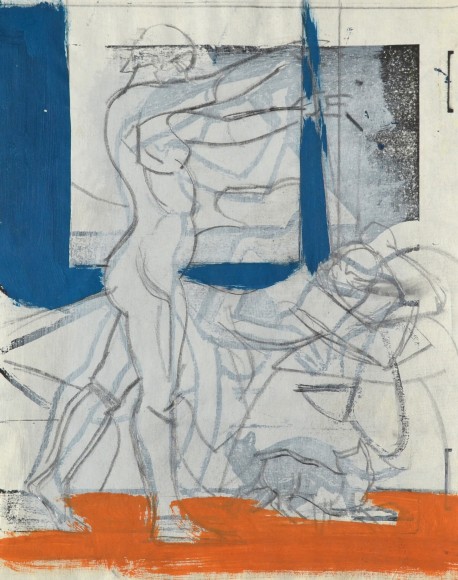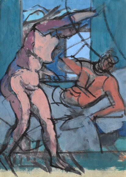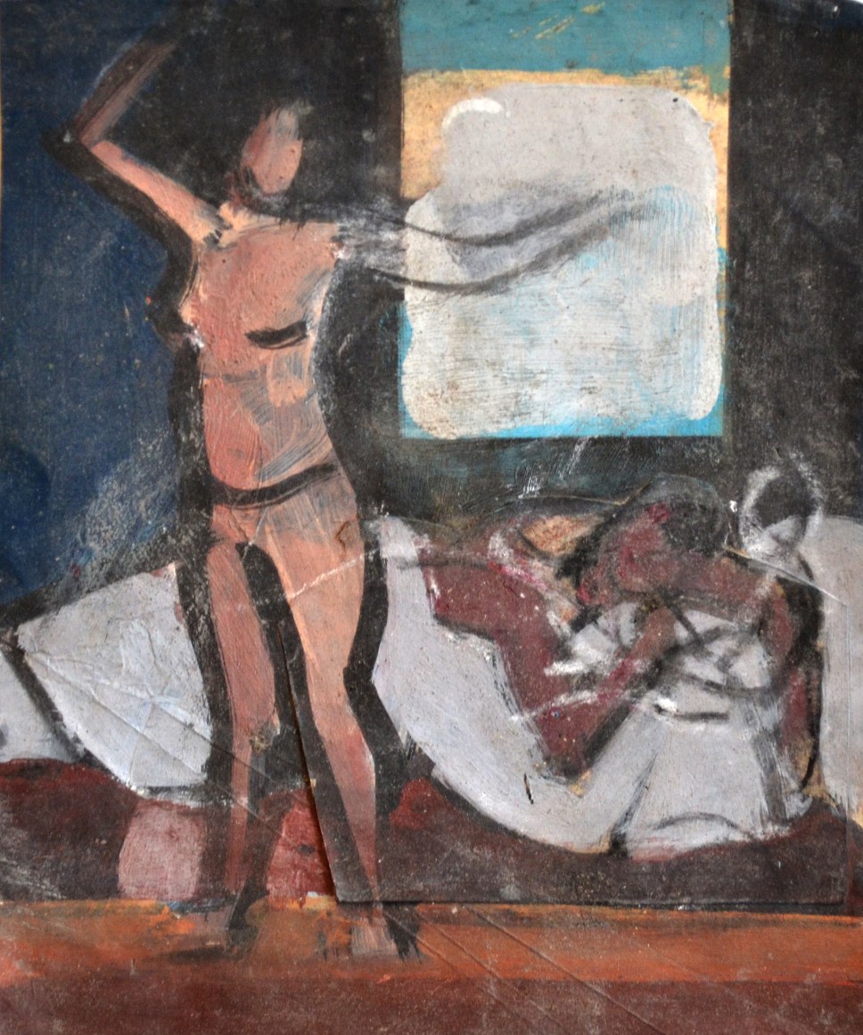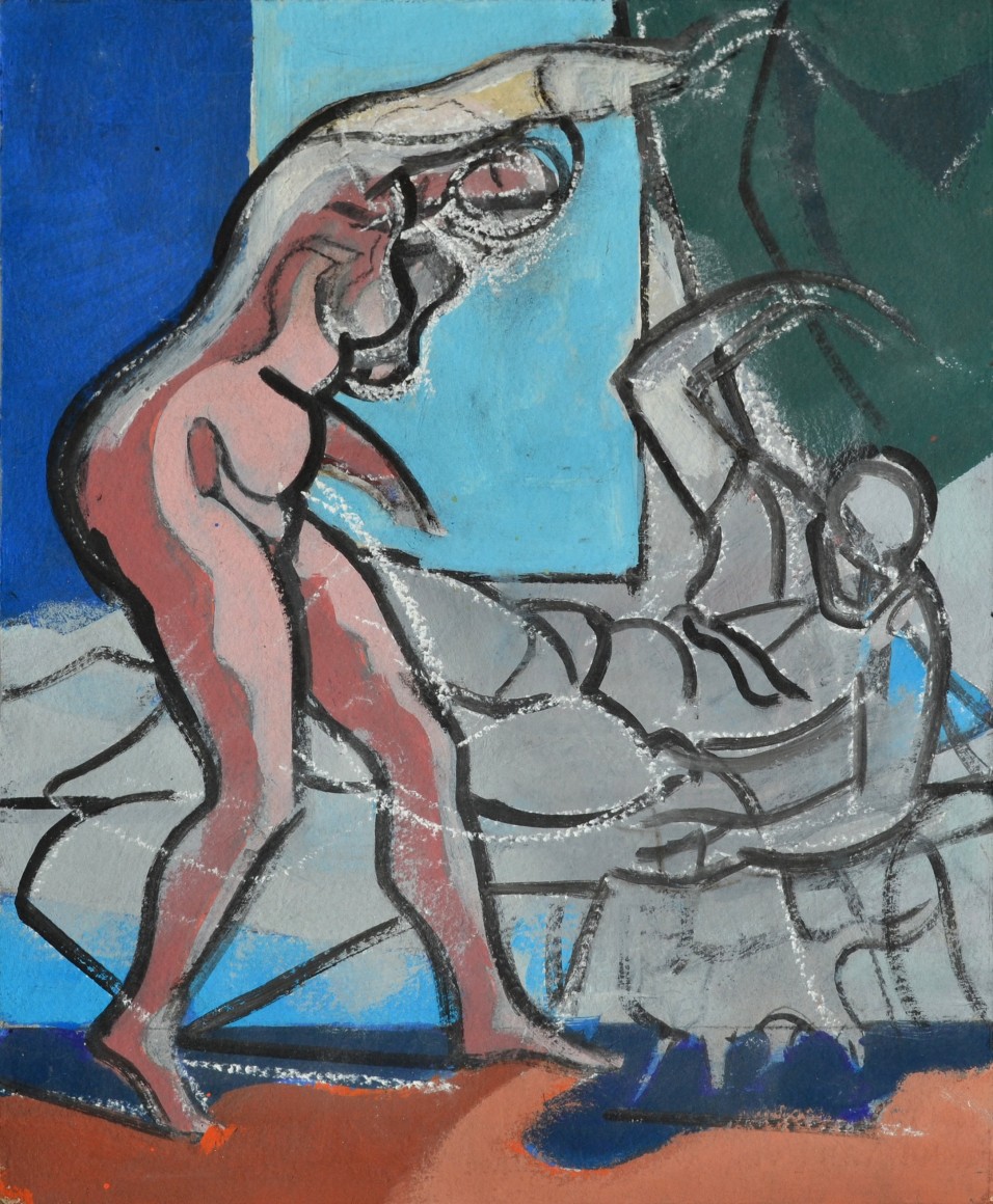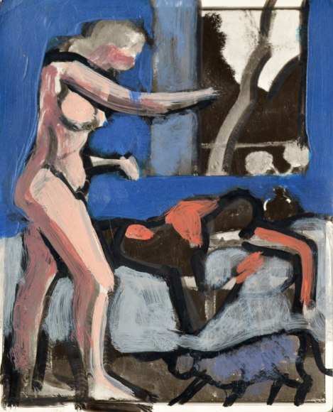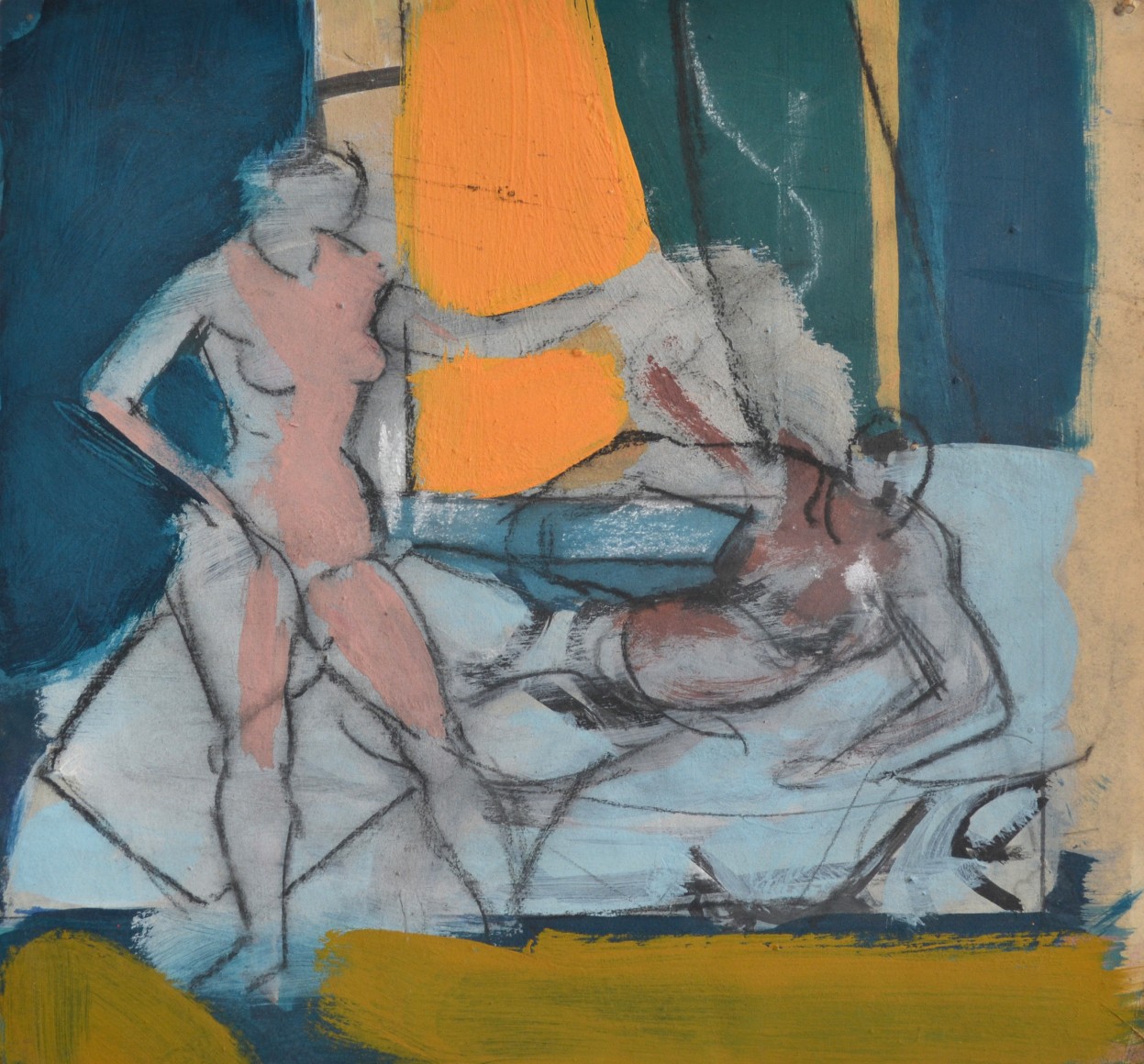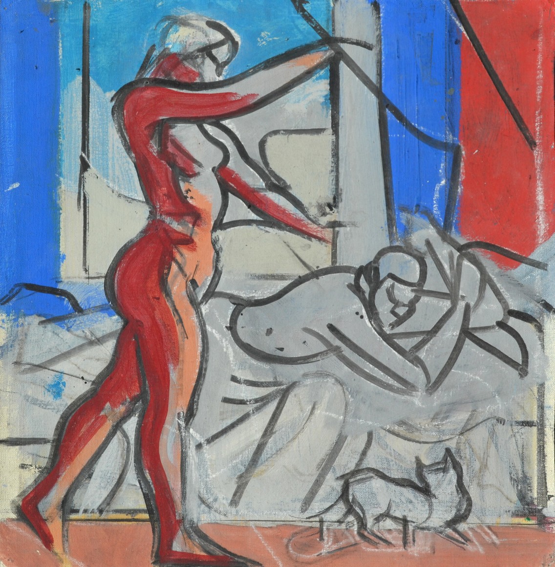 The Morning Series, a collection of work on paper and work on canvas, highlights Bell’s longstanding preoccupation with variations on a theme. In each work, the composition is the same. A man, rising from sleep, sits up in his bed while a female figure looms over him. At times, the couple is joined by a cat that seems to both surprise and intrigue them. In every instance, Bell provides just enough information to suggest narrative without telling it.
