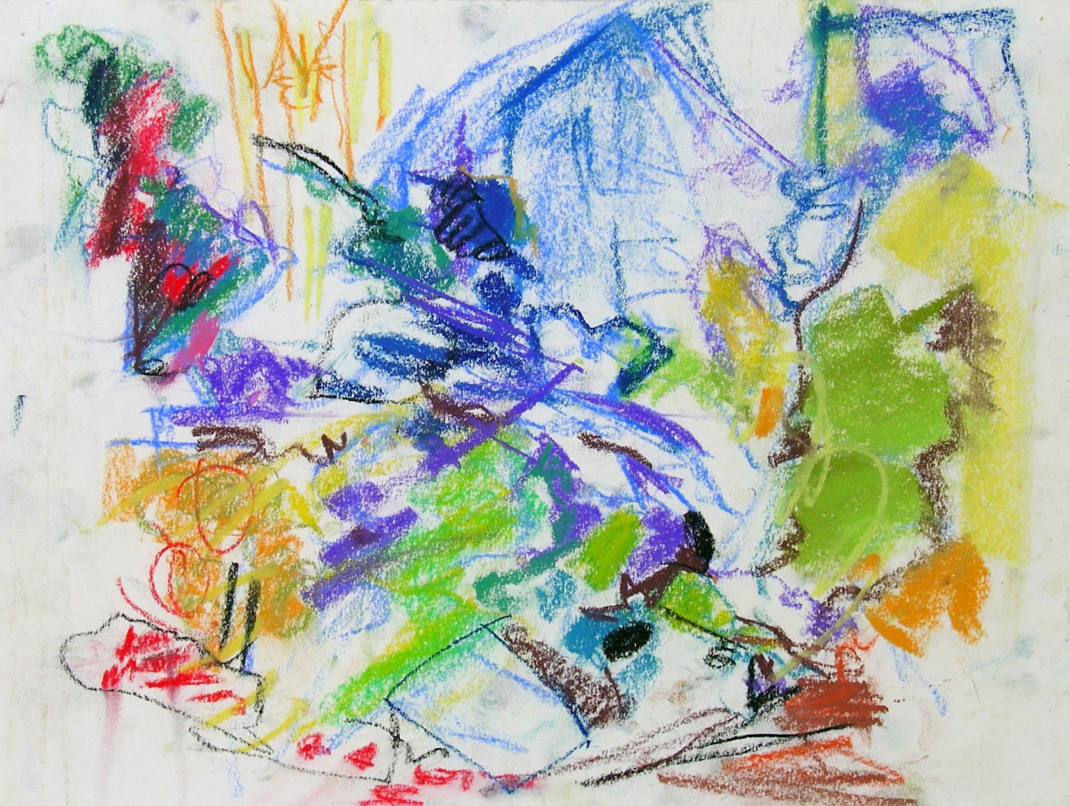 Louis Finkelstein [1923-2000] Untitled (Shapey Tree with Blue House) c. 1995 Pastel on paper 11 x 12 inches (LBFA #337)