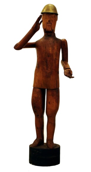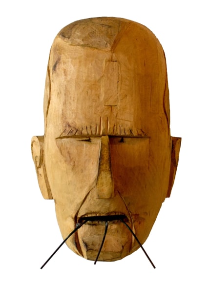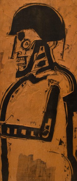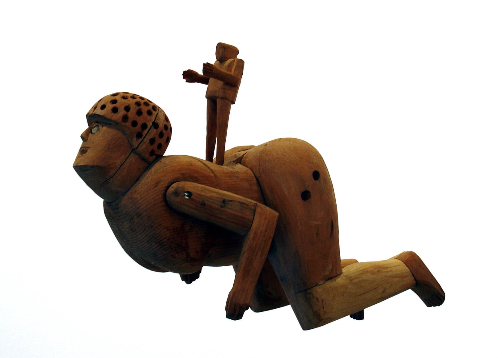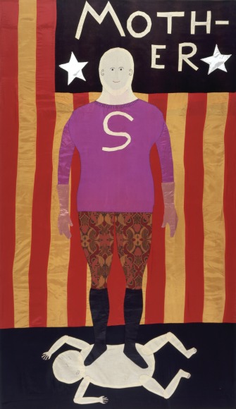 In contrast to her direct and subversive fabric pieces, Kruger’s wood sculptures are ambiguous and open to interpretation. For example, the sculpture Fighting/Hugging Men (c. 1980) features two simplified figures locked together in a questionable stance: are they embracing in harmony or struggling in a stalemate? This sculpture comments on the ways in which humans interact, letting the viewer read the two figures in their own way. In the large scale sculpture Hand (c. 1965), the simple gesture of one finger pointing upward evokes many different interpretations. Could it be Uncle Sam’s hand choosing you for the army or the gesticulation of a politican during a speech? These ambiguous wood works allow the viewer moments of introspection in contrast to the fabric works that confront the viewer more directly.