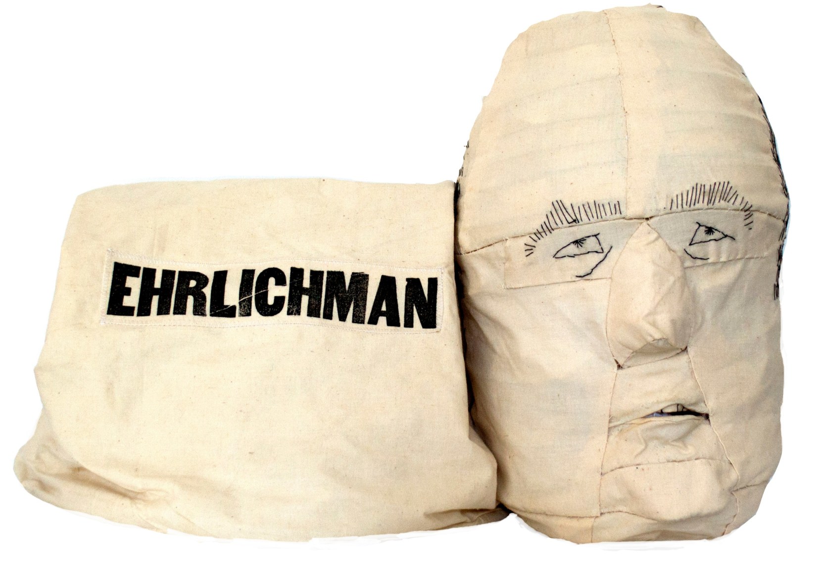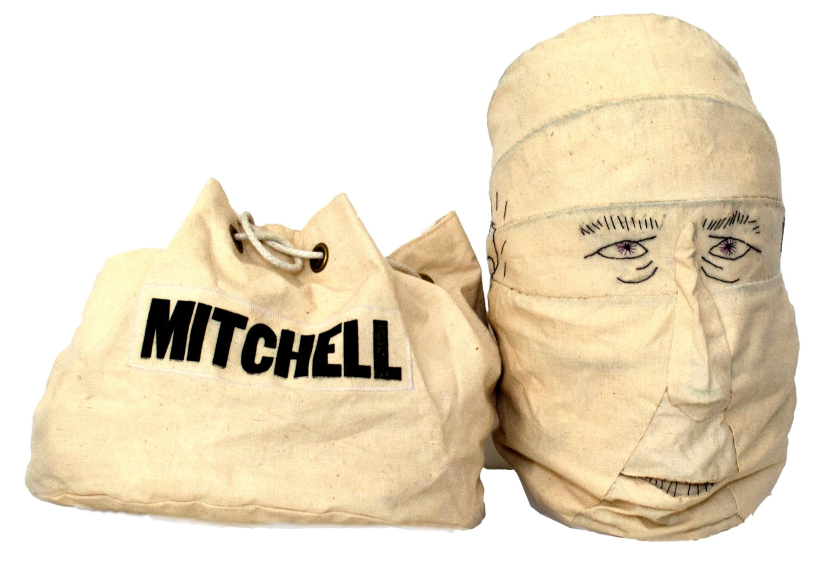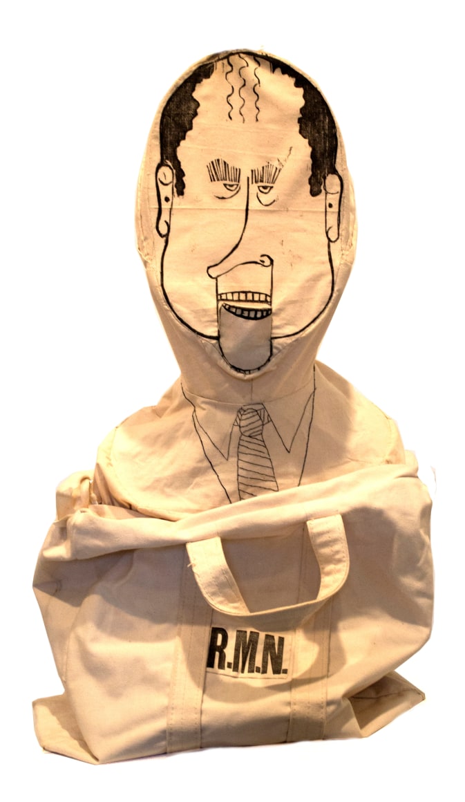 This exhibition is comprised of politically-charged works that encompass a wide range of US history, from the Founding Fathers to the Nixon and Bush administrations. Kruger maintained a radically-liberal point of view throughout her lifetime, which effected not only her voting habits but the company she kept and the artwork she produced. Indeed, in the political turbulence of the 1940s, Kruger developed lifelong friendships with kindred spirits such as city planner Jane Jacobs, and fellow artists Antonio Frasconi and Stan Kaplan, as well as folk singer and social activist Pete Seeger, sharing both political and creative ideas. In a similar way to his music, Kruger manifested her ideals in the artwork she created. More often than not, her political satire was humorous, albeit cunning, as evidenced in soft-sculptures like Nixon, Ehrlichman and Mitchell (all c. 1974-75). The works feature caricature-like effigies of the aforementioned politicians emerging from bags like hand-puppets or jack-in-the-boxes. This kind of topical, social commentary can be seen as a continuation of the great tradition of artist as social commentator.