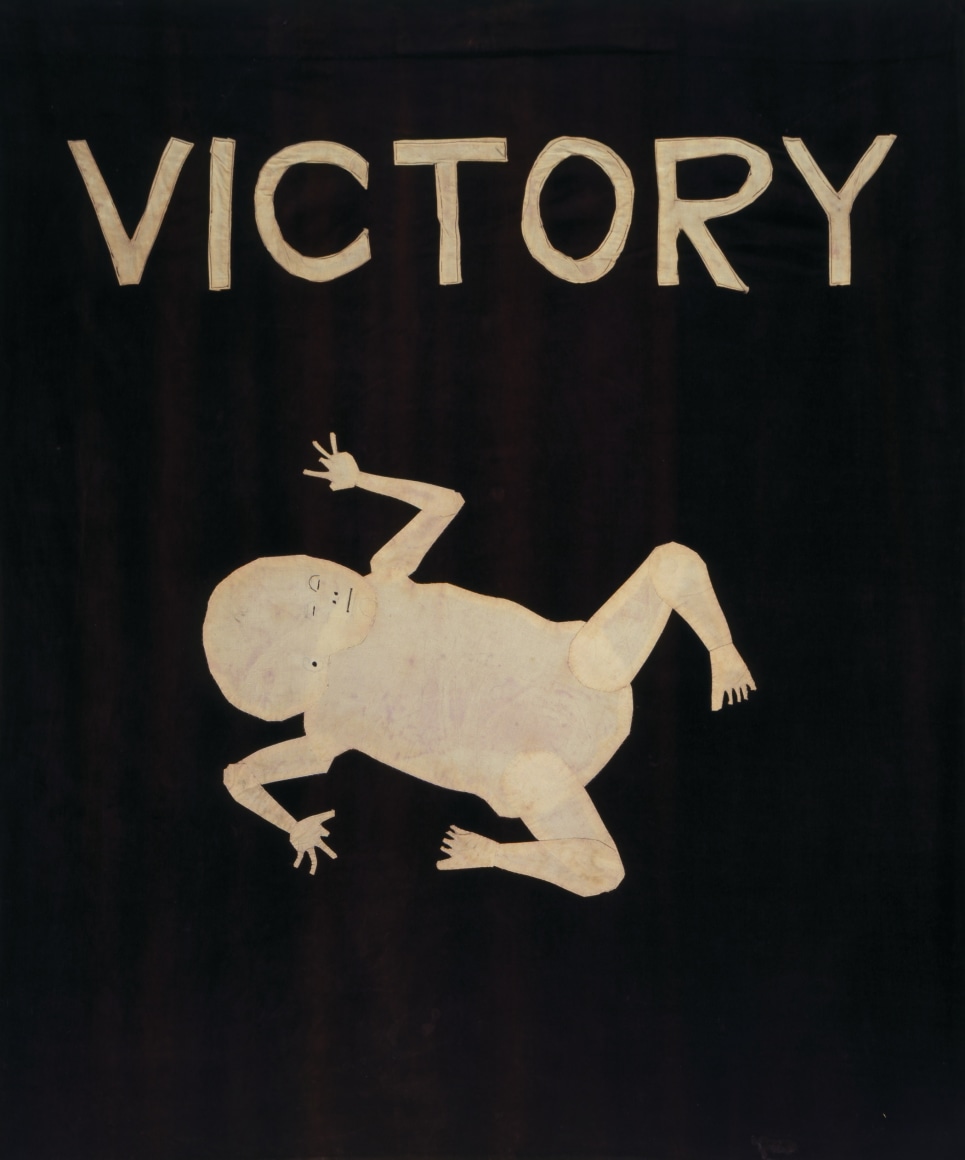 Some of the artist's most direct and difficult political works are her textiles, otherwise regarded as a “craft” traditionally associated with women, Kruger was able to use such simple materials as fabric, scissors and needlework as a vehicle for her own cunning political critique. For example, the embroidered fabric work Untitled (Soldier) (c. 1969) is a direct response to the artist’s feelings on the hyper-patriotism during the Vietnam War. Instead of the glorified depiction of a soldier, Kruger presents a man with skeletal legs in a military uniform carrying an American flag and a sword. Through this piece, the artist mirrors propagandist aesthetics akin to the “I Want You” posters. The skeletal legs on this figure show a man already halfway to death who refuses to accept the vanity of his patriotism. In another fabric work, Untitled (Victory) (c. 1973), the word VICTORY is emblazened above an emaciated fetus. Dated to the same year of the historic Roe v Wade Supreme Court case, Kruger boldly, even unapologetically, states what the ruling means for her and her leftist comrades.