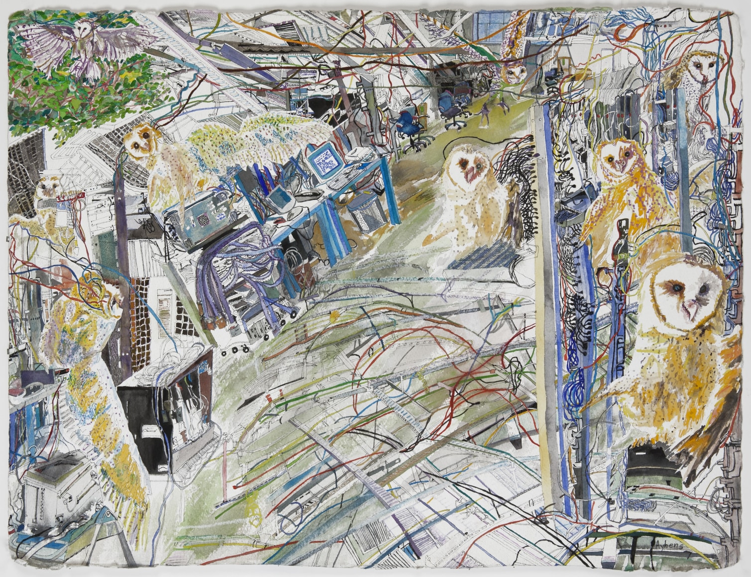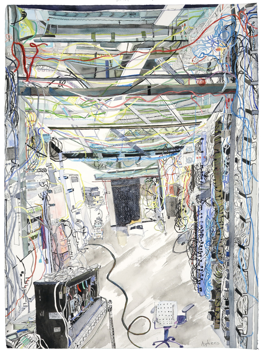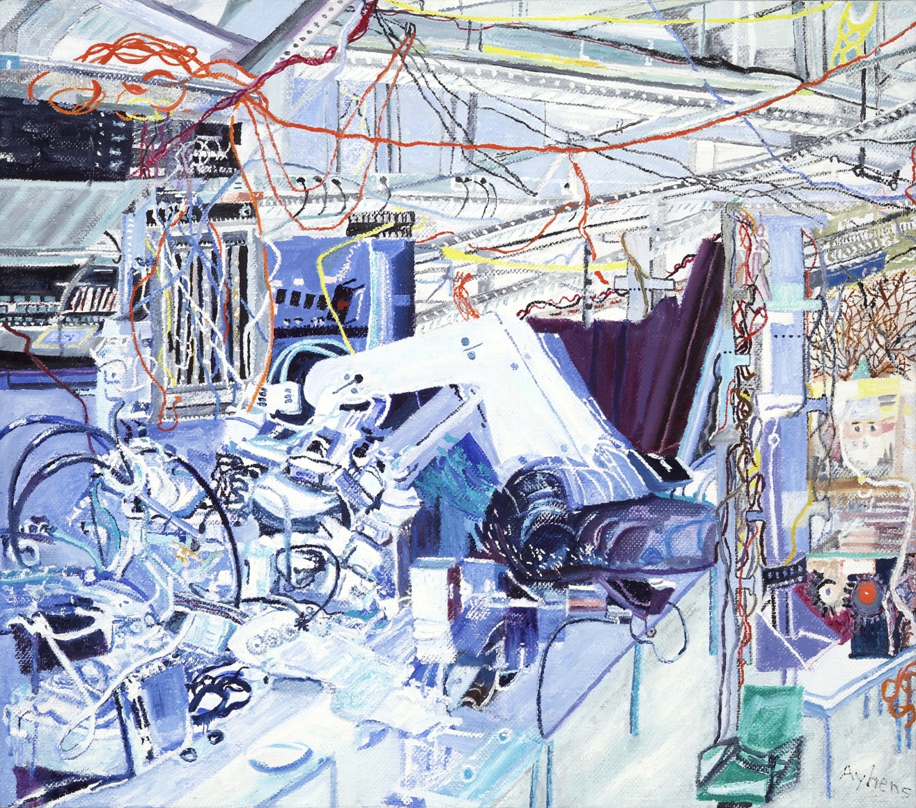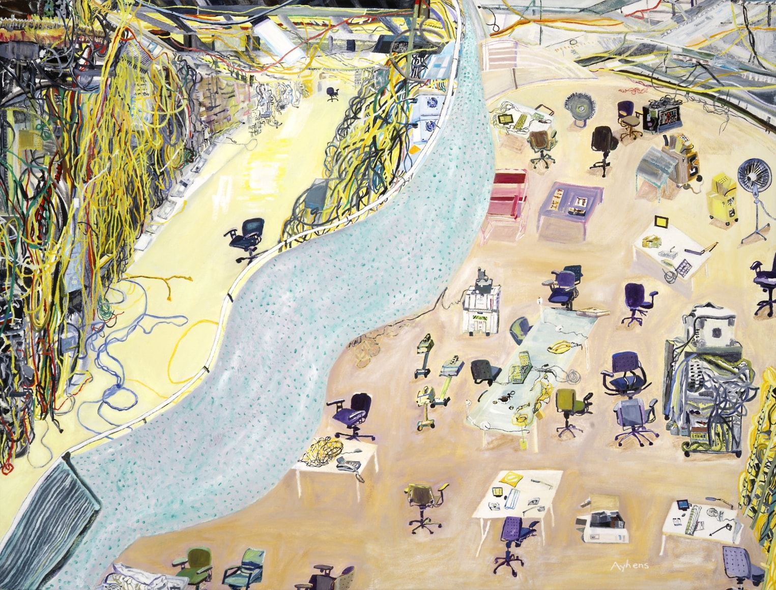 Ayhens found inspiration for the works in “Electronic Labyrinth” while visiting a friend at a scientific laboratory, where a complex universe of wires, equipment and robots, framed within the setting of a mundane office environment, appeared to morph into an organism unto itself. Divorced from the scientific objectives of this unfamiliar world, Ayhens applied her distinct sense of color and space to highlight the seemingly endless chaos of the scenes before her. The artist, who has also put views of the National Parks and the urban landscape through this lens, continues to embrace a cheerful collision of external reality with interior vision.