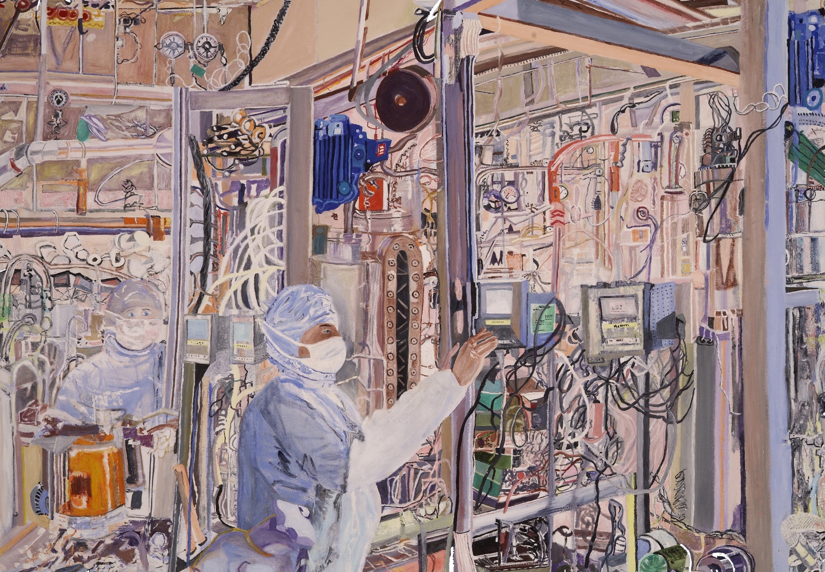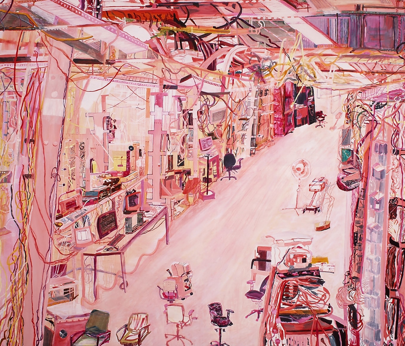 In Ayhens’ exuberant worldview, lifeless cords and cables are infused with pulsating rhythms, while industrious scientists become peculiar, white-masked creatures. Floors turn up on themselves and function more like massive arterial highways than stable supports. Further upending any kind of conventional pictorial logic, Ayhens is unafraid to cast entire compositions in fantastically-colored glows, such as the intestinal pink and red hues of Computer Lab. Juxtaposing clinical microcosms with the organic world of the flesh, the painting leaves the viewer guessing at the order in this disorder. And are the inanimate objects, suddenly infused with life, animal or vegetal? Are we in it all or observing from above?