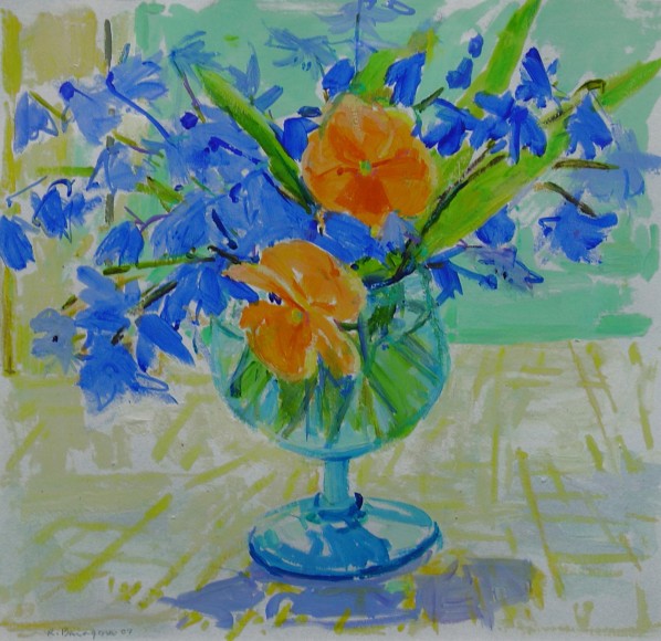 Blue Scilla and Orange Pansies