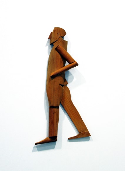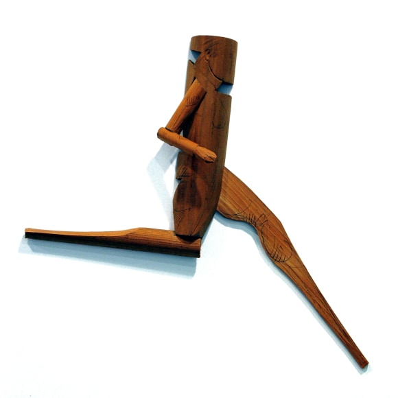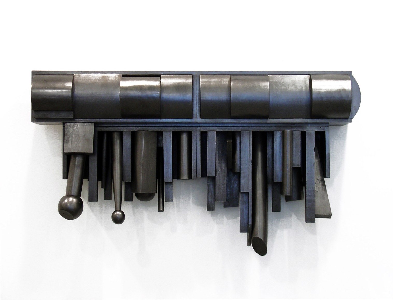 Willard Boepple frequently uses the wall as the support for his abstract, yet vaguely utilitarian-feeling sculpture. Working within a human-sized or slightly oversize scale, he distills man-made and machine-inspired forms to their ergonomic essence. Built from wood and metal, his pieces exploit the physical structures of his materials but often obscure their organic properties.