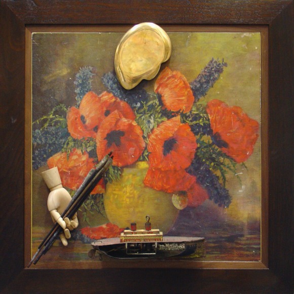 Varujan Boghosian has explored mixed media collage and construction since the 1950s. An inveterate collector, he amasses antique children’s toys and unusual detritus, recombining them in his playful and surreal assemblage works, and bringing the art of collage into high relief. Classical history, legend, and narrative are woven throughout, assigning specific but sometimes mysterious meanings to his constructions.