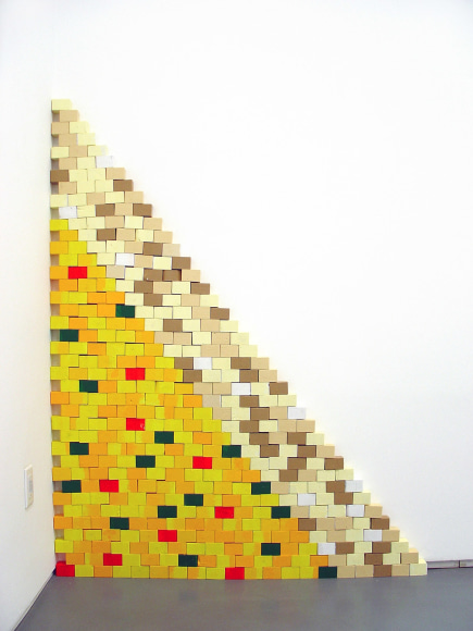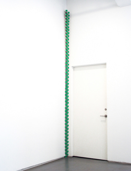 Cordy Ryman uses small, discrete components made from mundane materials to build human-scaled installations in which his interest in painting and sculpture converge. The works are not necessarily site-specific, relying on the wall for support but not dependent on a particular site; indeed, the aggregate nature of the pieces allow them to be disassembled, rebuilt, and adapted.