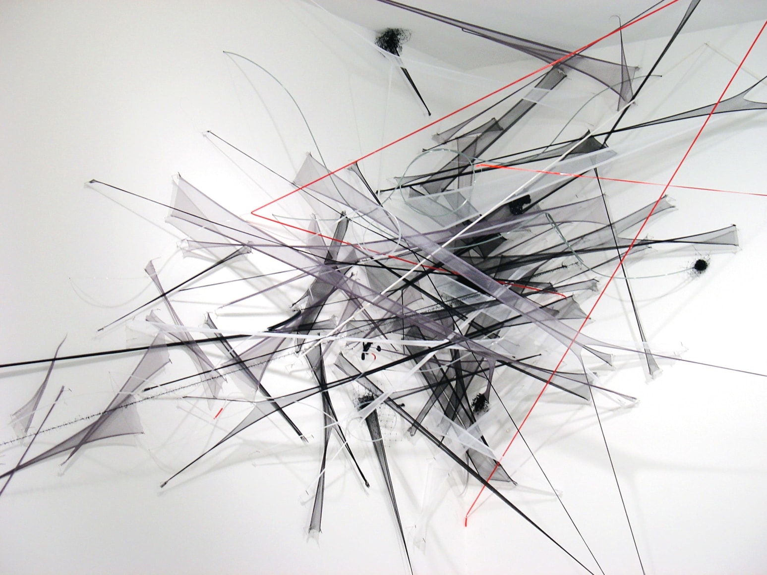 Gelah Penn’s drawings in space incorporate synthetics like mosquito netting and plastic tubing to turn installation sites into both ground and armature. Her structures inhabit walls, corners, and ceilings, and appear to define architectural space while simultaneously emerging from it. Non-narrative, they are nonetheless filled with gesture and allusion.