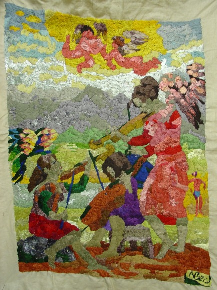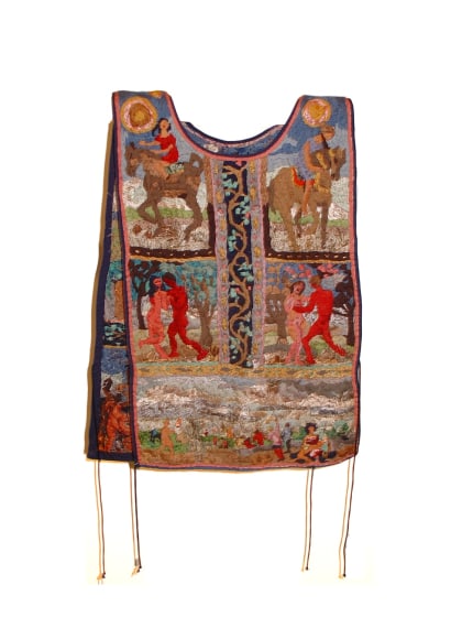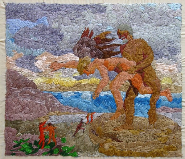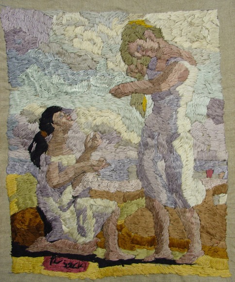 The artist first began to work with embroidery by decorating blouses as a means to supplement her income. Over time this evolved into autonomous works that developed alongside her paintings into figural compositions. In the late 70s, Beck executed a number of narratives from Greek mythology including the tales of Antigone, Daedalus and Icarus and Atalanta. Indeed, while Beck both painted and stitched these themes, she shows a greater freedom of color in the fabric pieces. Each of her canvases are filled with half-inch long stitches that vibrate in tonal patches of color. Subtle variations in the direction and tonalities of the thread provide a relief-like molding to the work.