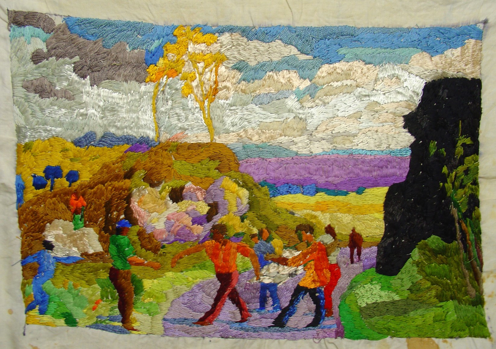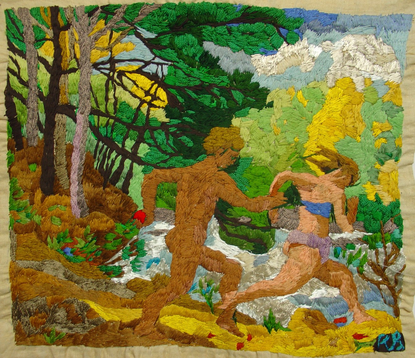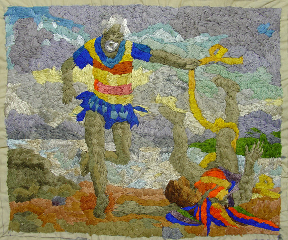 Rosemarie Beck: Embroidered Mythologies examines the mythological aspect of Beck's late embroideries. The artist often turned to narrative in her work, frequently electing to depict the frenzied climax of various Greek tragedies - the falling of Icarus or the foot race for Atalanta. It seems almost counter-intuitive that Beck was able to imbue her embroideries with such dynamism considering the tedious nature of needlework, however, the rough surfaces and the angularity of the stitches amplify the drama of the story in a way that seems particularly unique to the medium of embroidery.