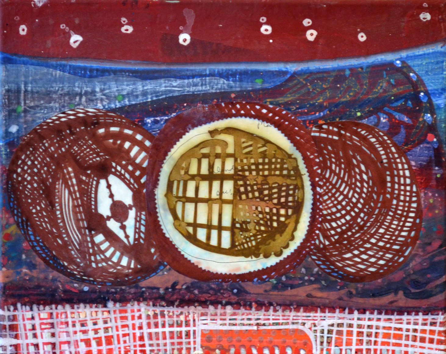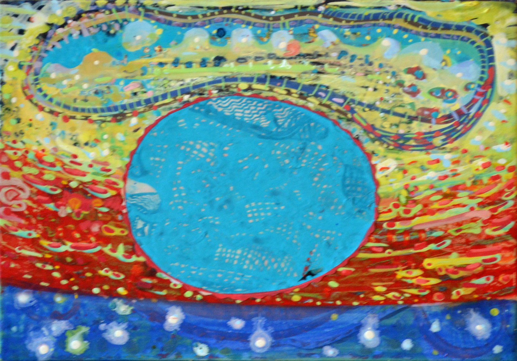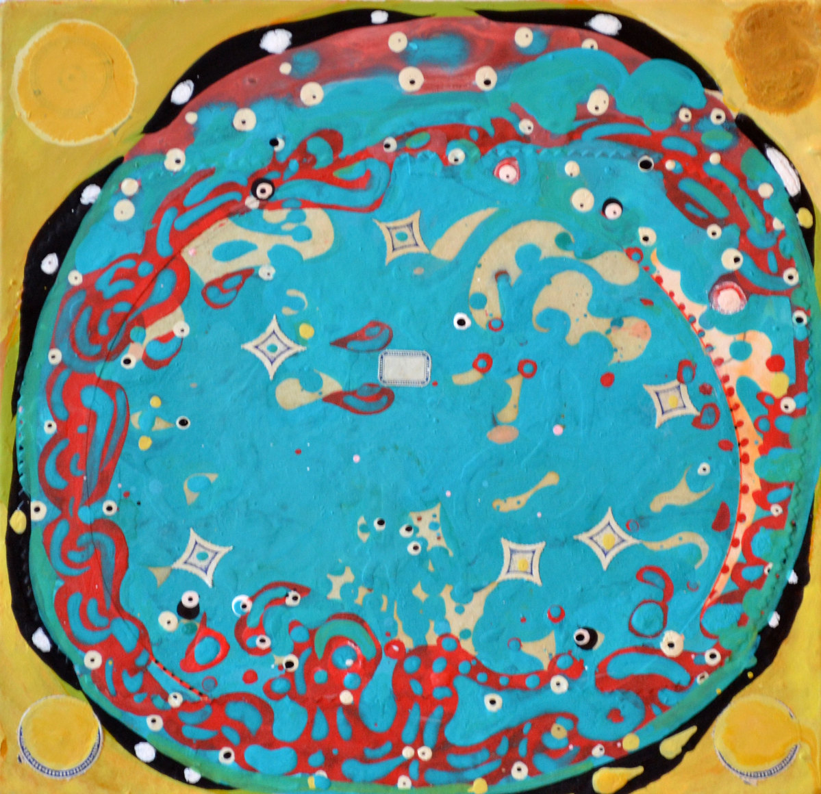 themselves into the painted surfaces of the planetary orbs, almost as if they were firmly footed by gravitational